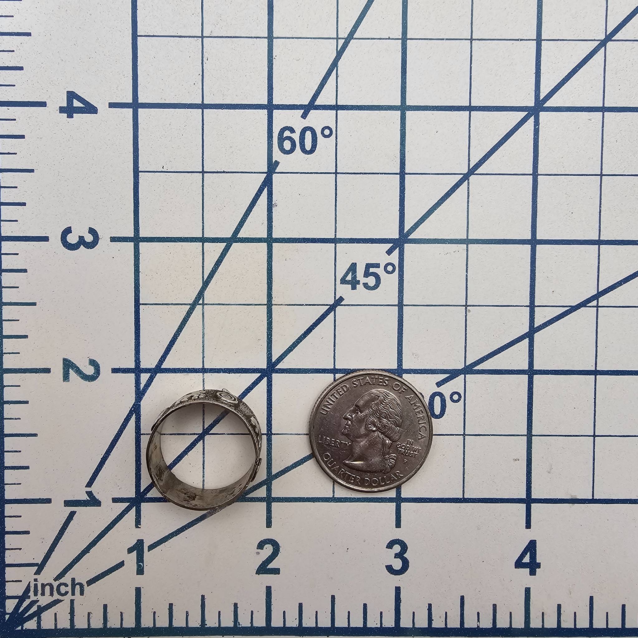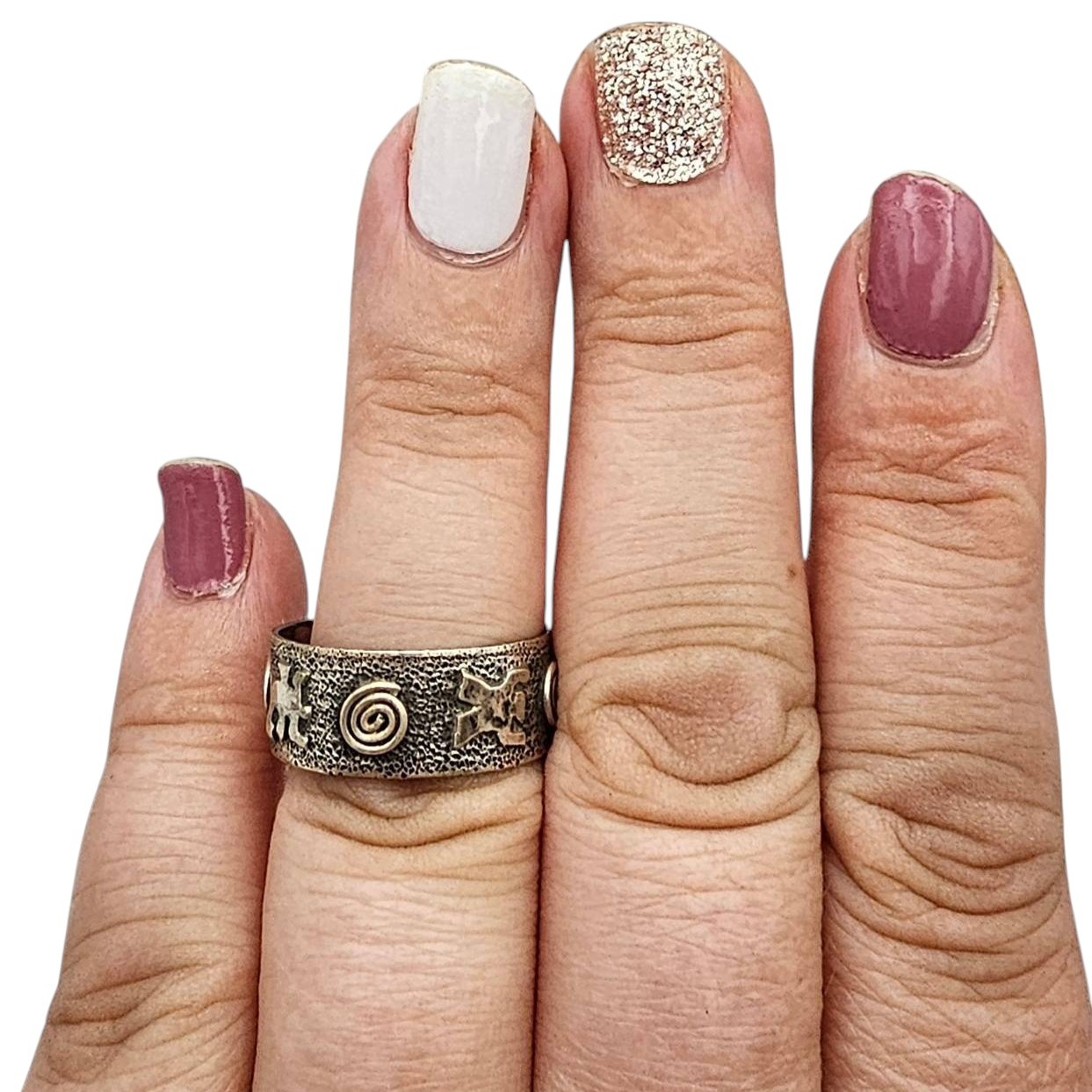 Handmade sterling silver ring by Navajo artist Scott Skeets. Features petroglyph-style engravings with textured detailing. Marked as size 9.5, with an artist label referencing the original retail value of $75. A representation of authentic Navajo craftsmanship and design.