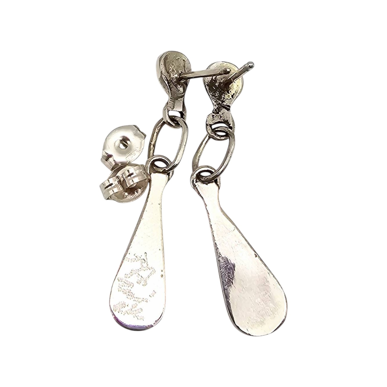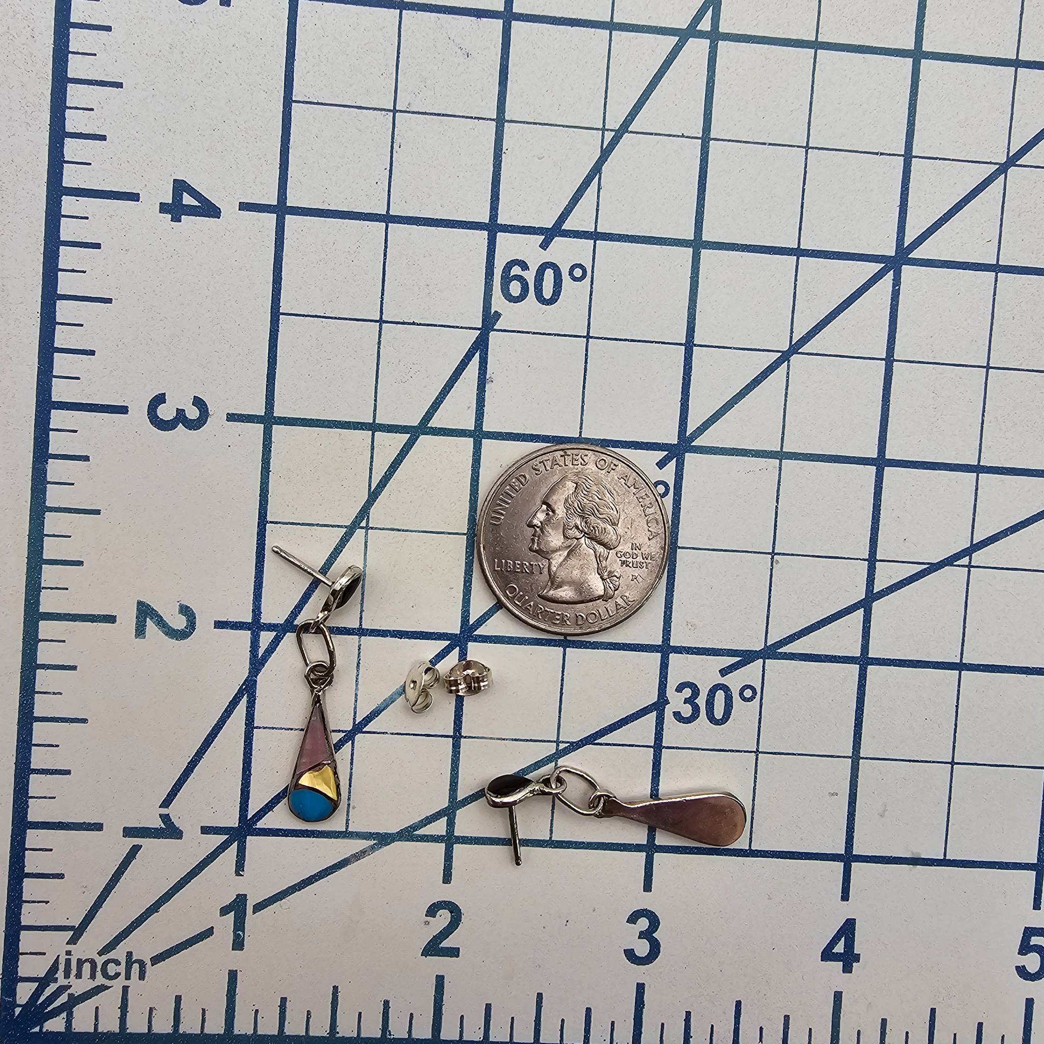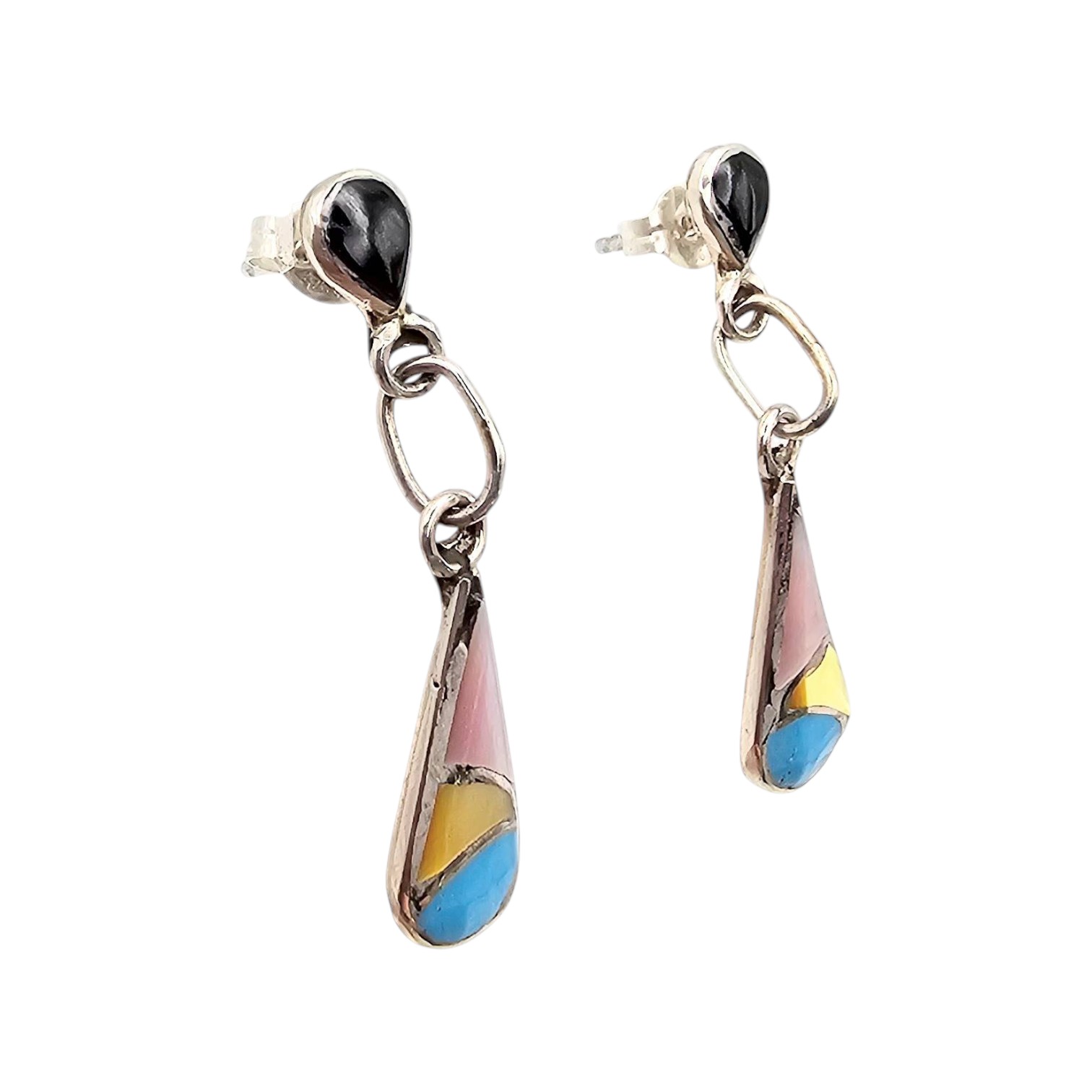 Antionetti Ahiyite Zuni handmade earrings featuring a multicolor inlay design in sterling silver. Weighing approximately 2.3 grams, these earrings include mother of pearl, turquoise, and jet stone accents. Secure post and clutch backs are included.