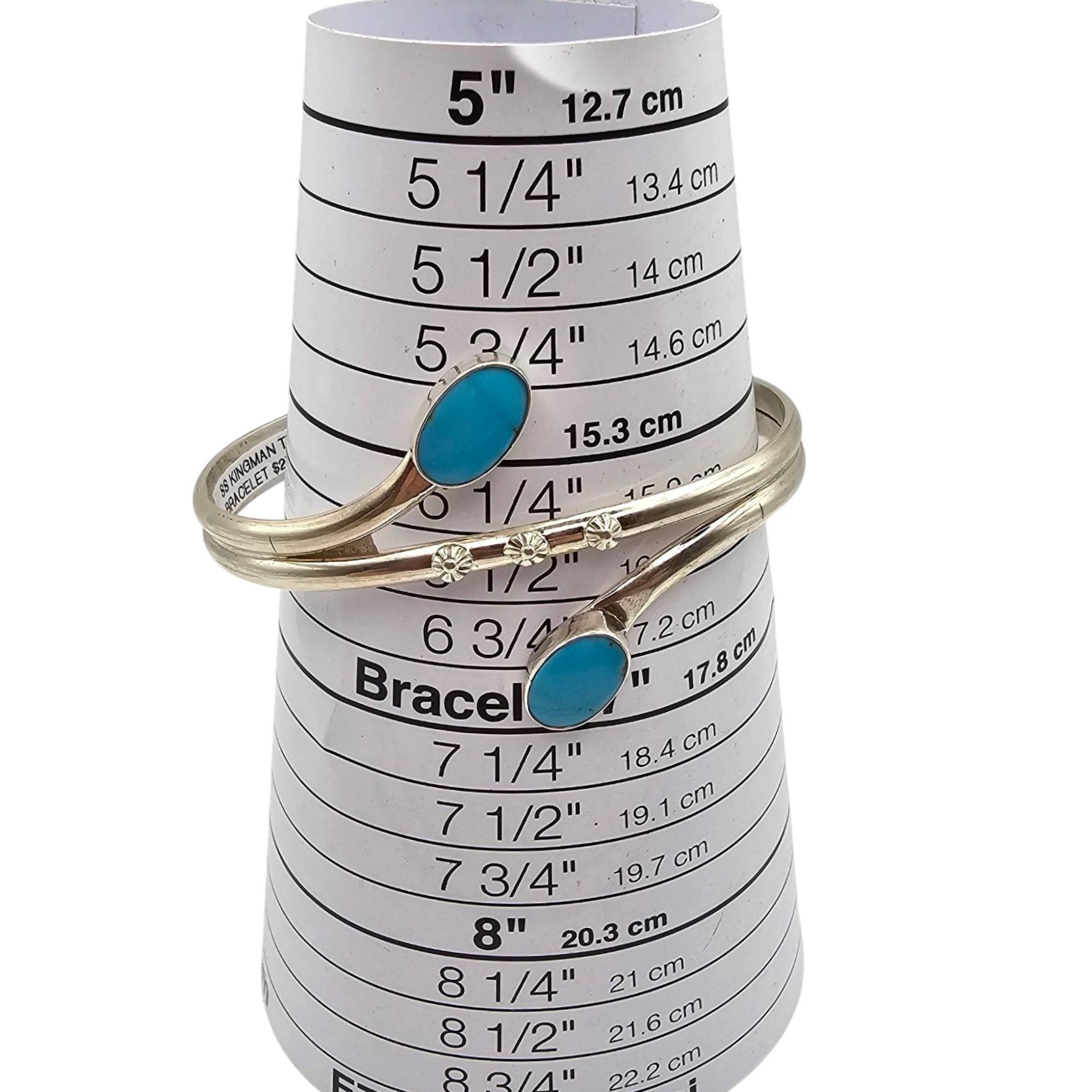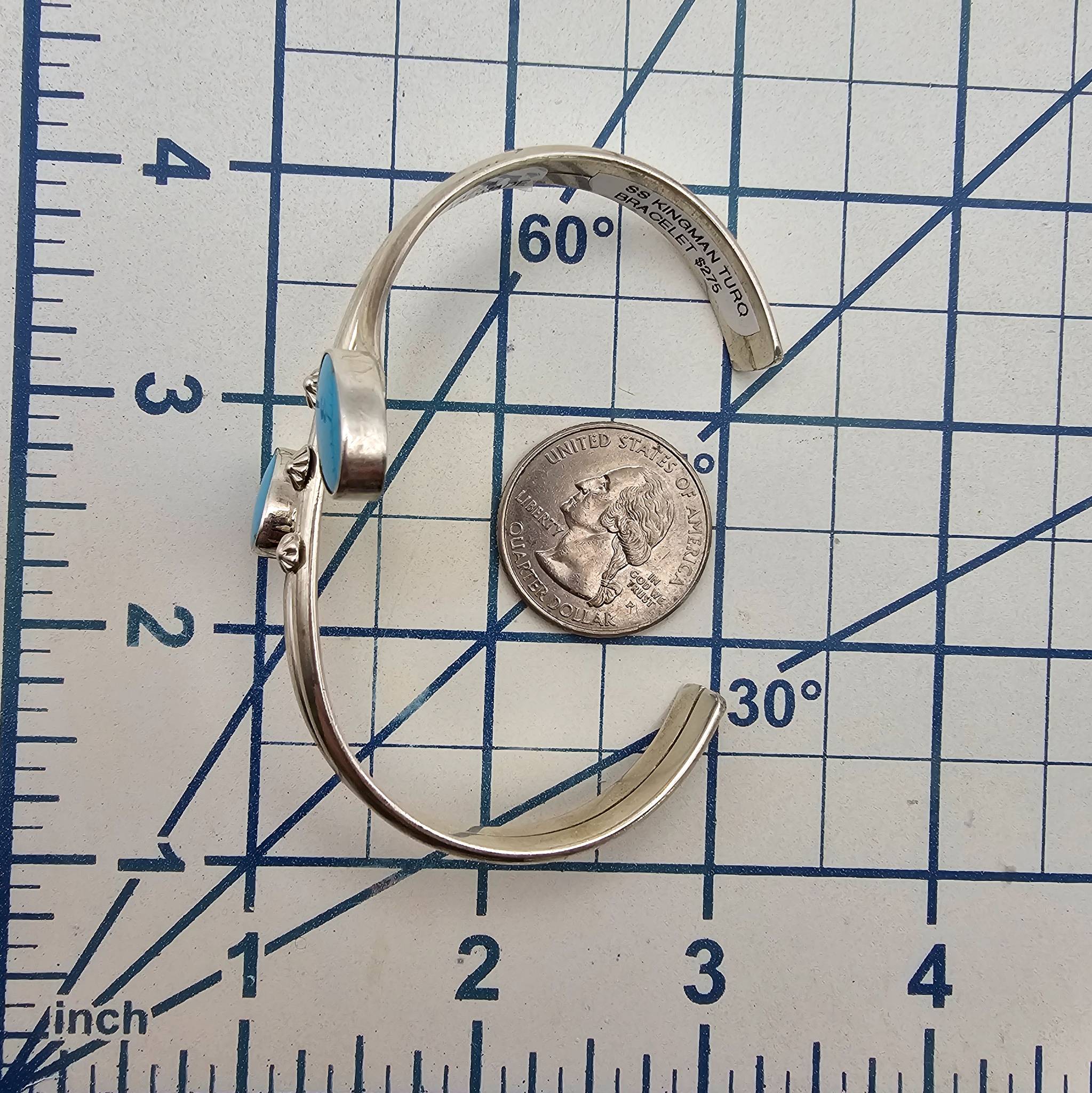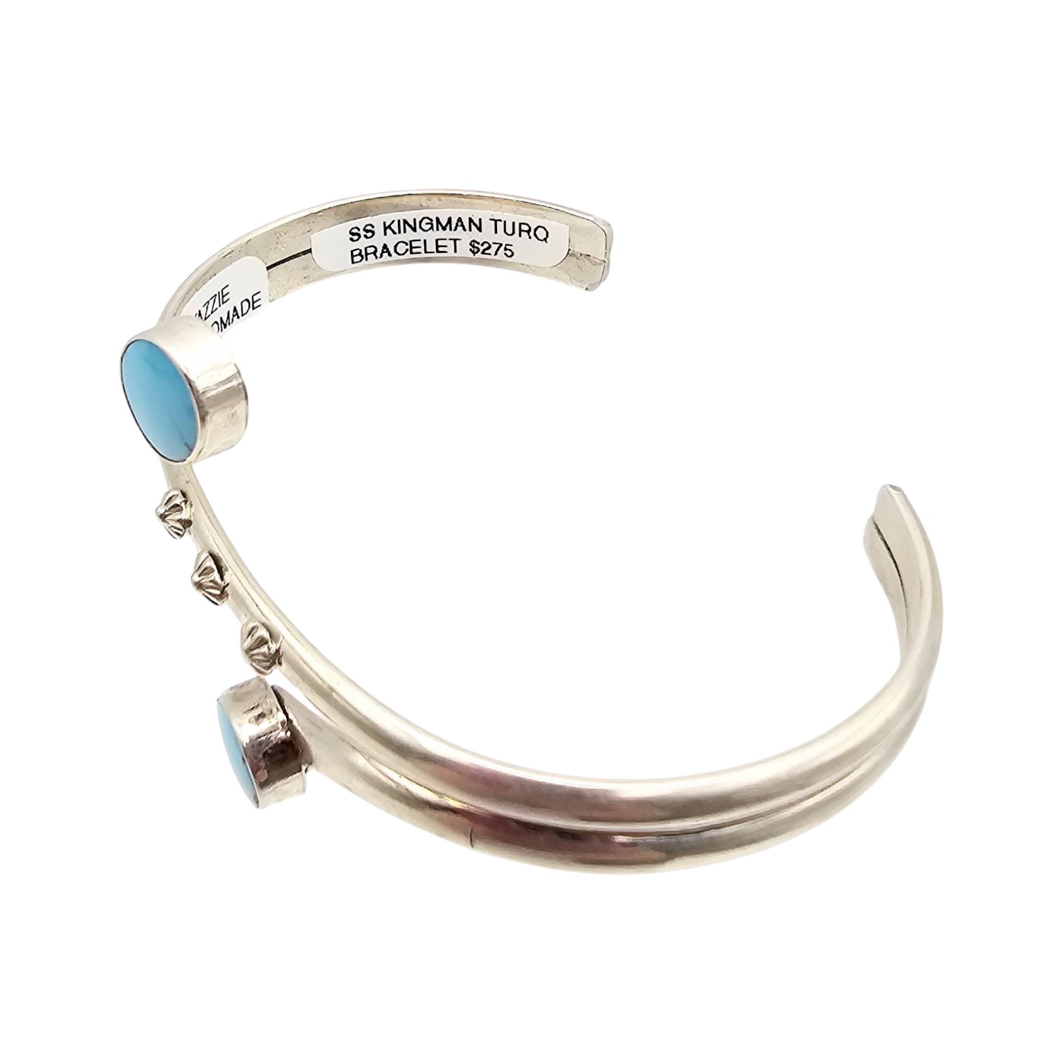 Sterling silver cuff bracelet by Thomas Yazzie, a Navajo artisan. Features two vibrant Kingman turquoise stones and decorative silver accents. The bracelet is handmade and marked on the inner side. Weighs approximately 23.3 grams and measures around 5 1/2″ for the inner circumference, adjustable. Purchased at $275 retail.