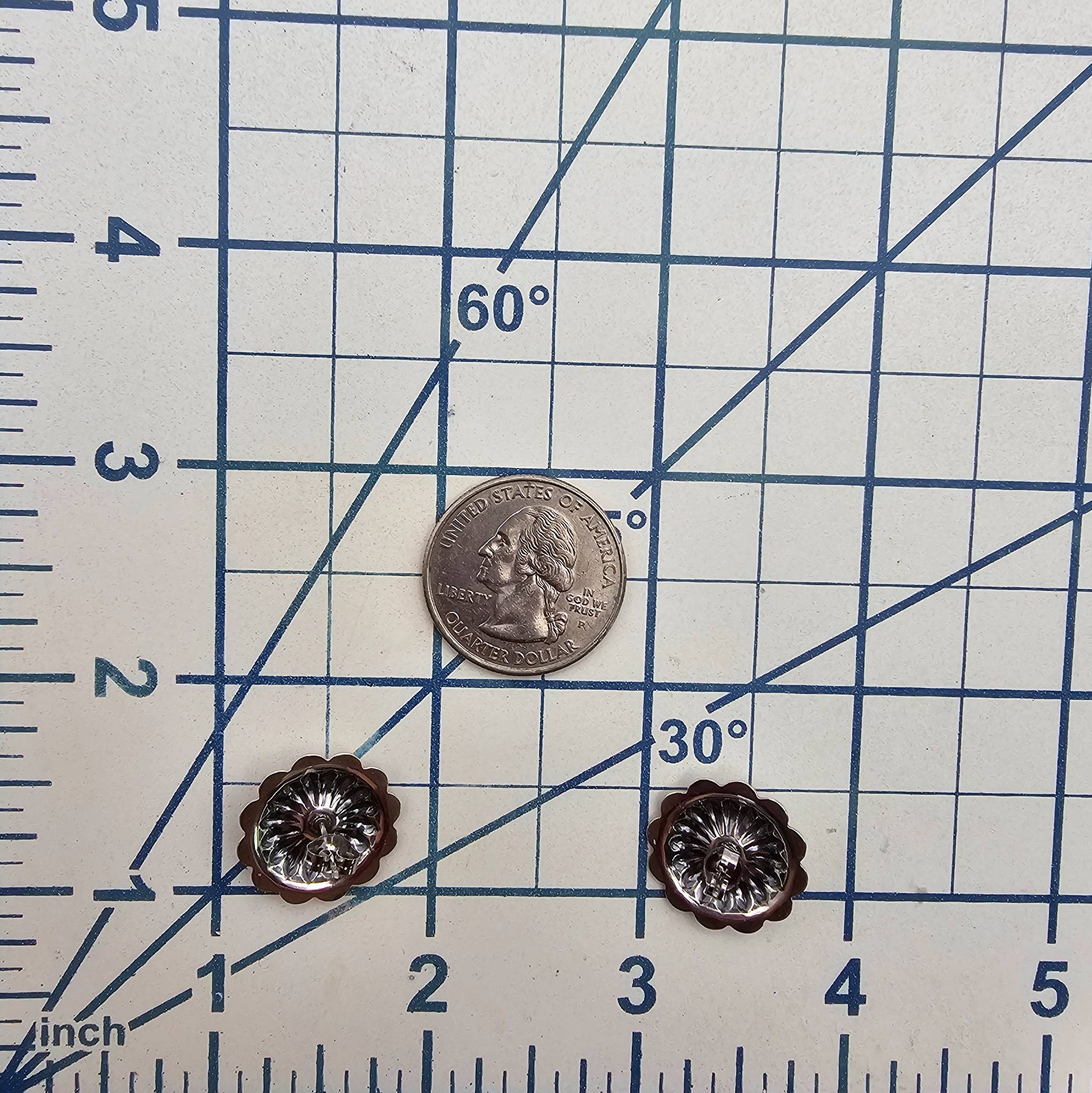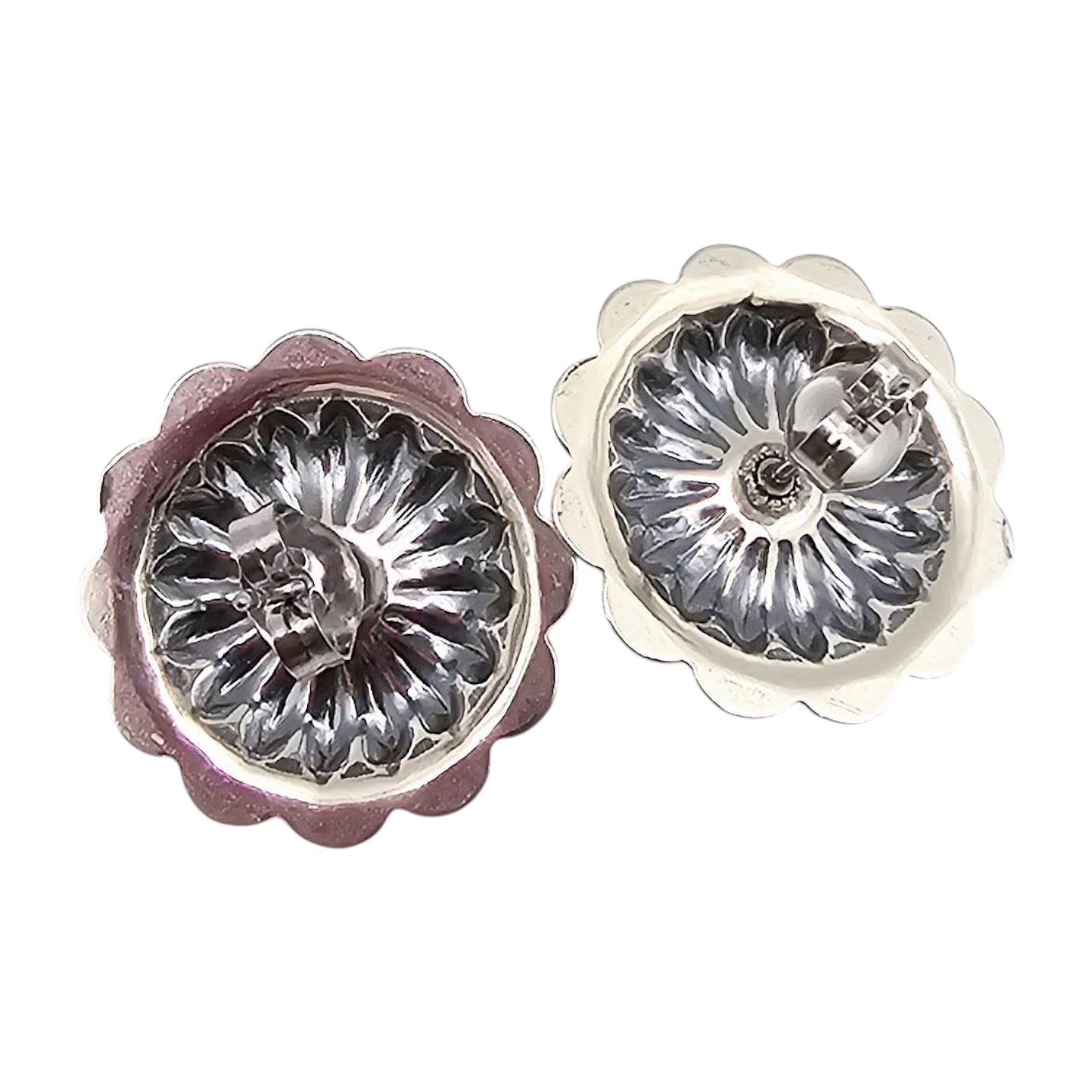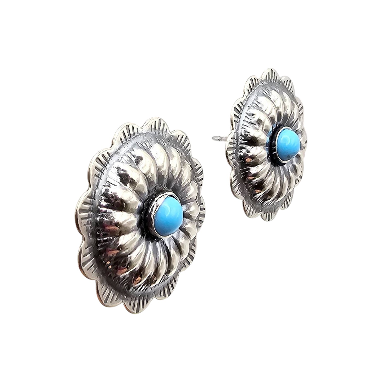 Sterling silver post-style earrings featuring Kingman turquoise stones at their centers. The earrings showcase a scalloped design accentuating the central turquoise. They weigh approximately 2.6 grams. Dimensions of the earrings are visible against a ruler scale in the image.