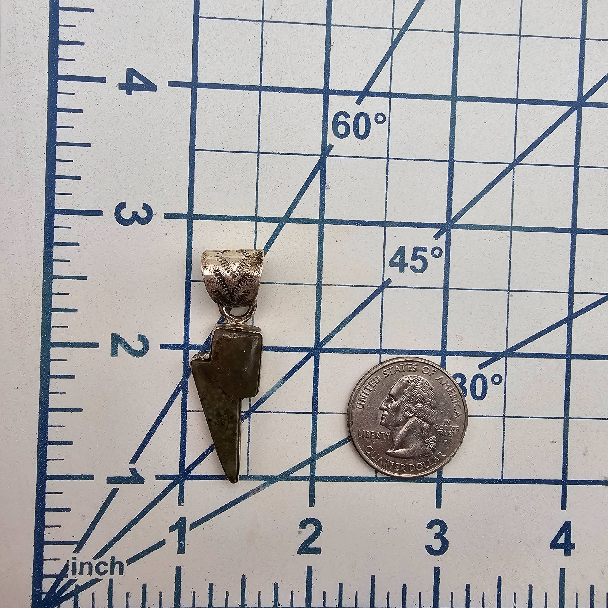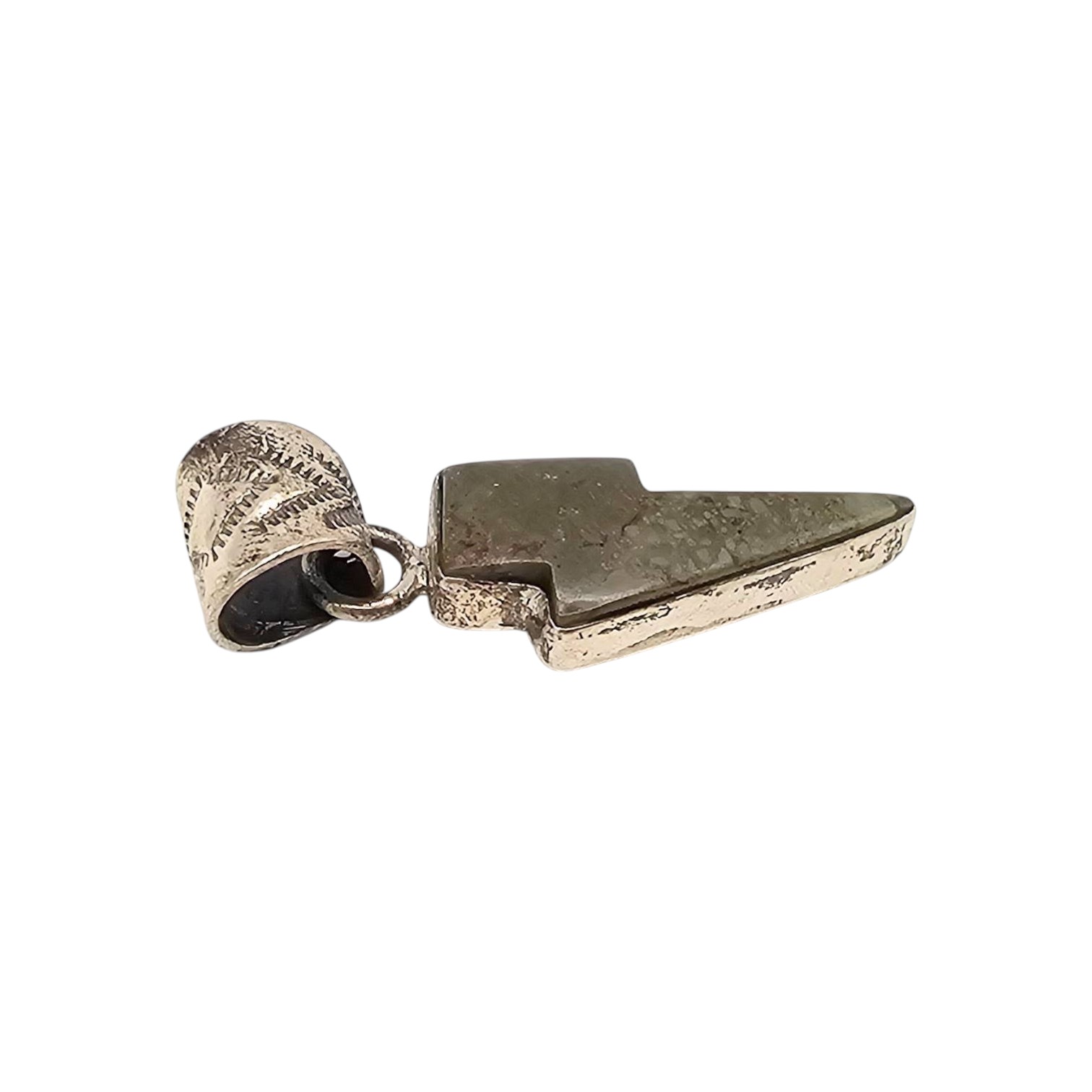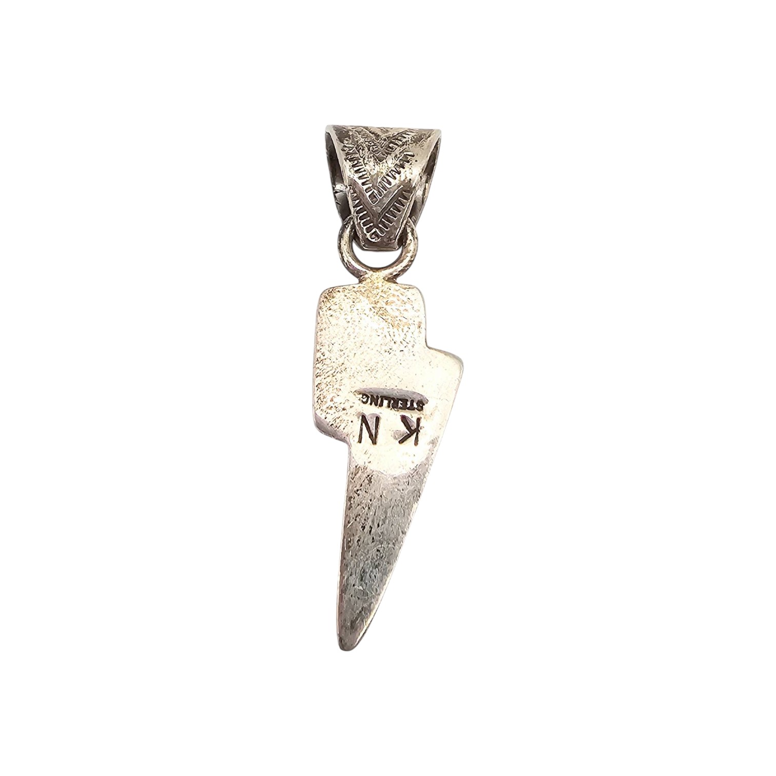 Sterling silver pendant crafted by Navajo artisan Kevin Nez, featuring a lightning bolt design inlaid with Kingman turquoise. Marked ‘KN Sterling’ on the back. The pendant weighs approximately 6.3 grams. The bail is intricately engraved and large enough to accommodate most chains.