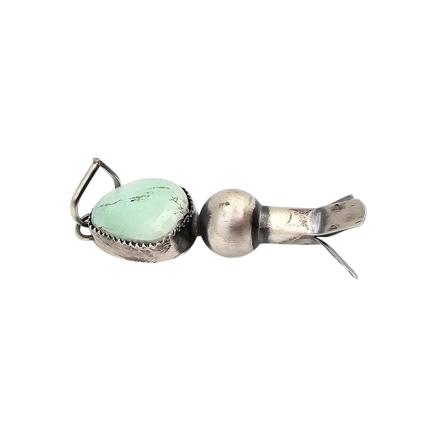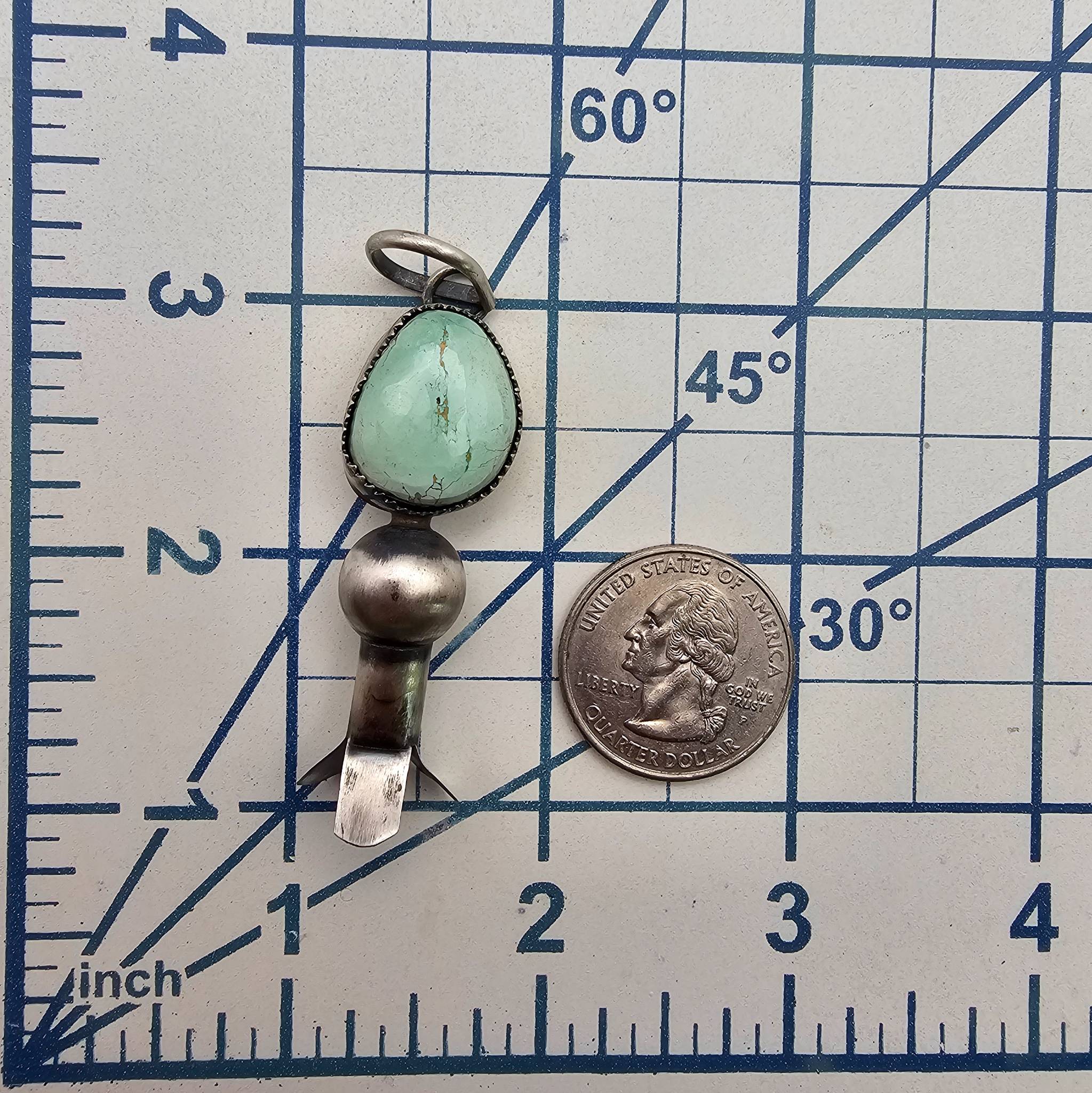 Navajo handmade sterling silver pendant by Tia Long featuring a Royston turquoise stone. Marked ‘T13 Sterling’ on the back. The pendant showcases a floral or squash blossom design and weighs 7.9 grams. The turquoise stone is bezel-set with natural veining. Includes handmade craftsmanship details. Measures approximately 2.5 inches in length.