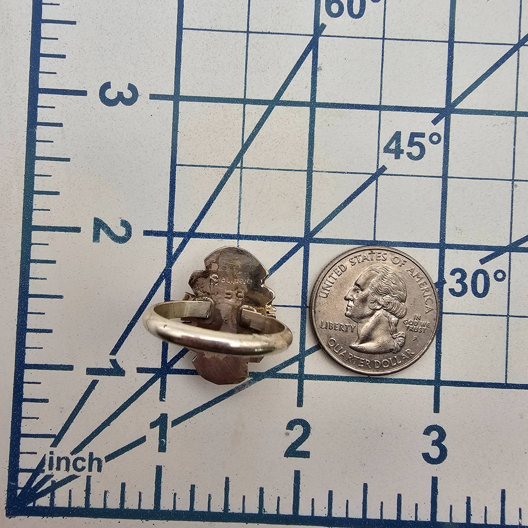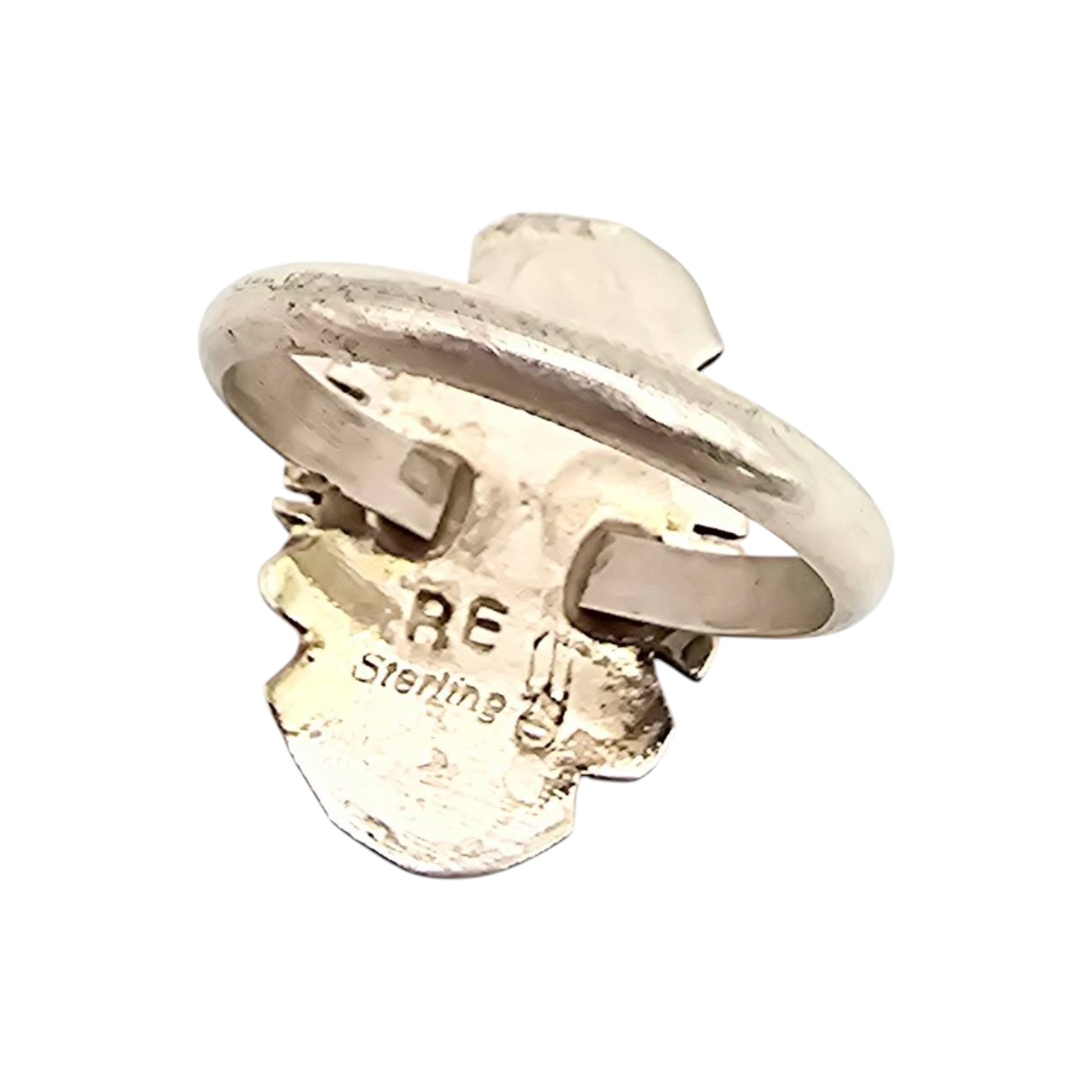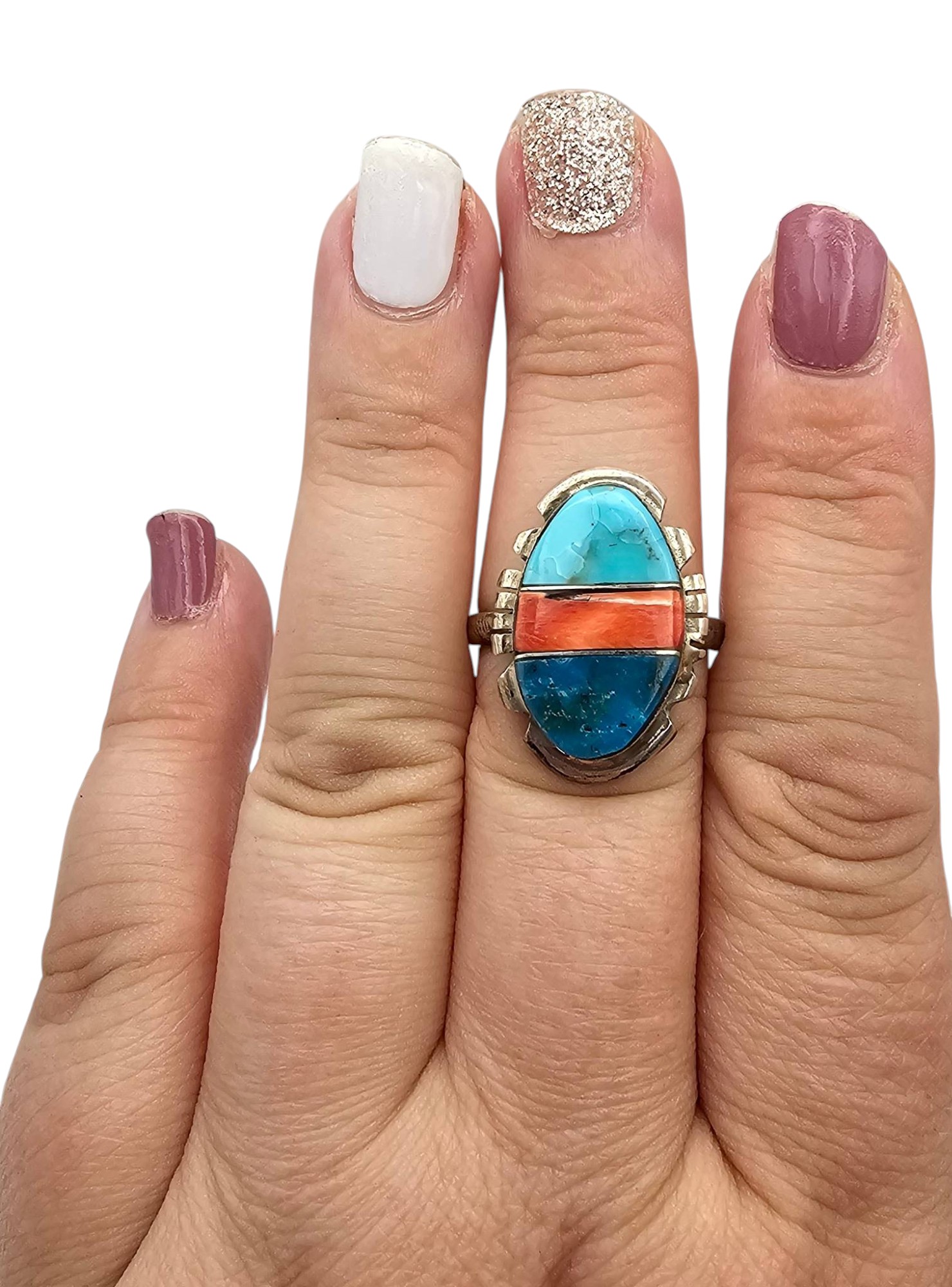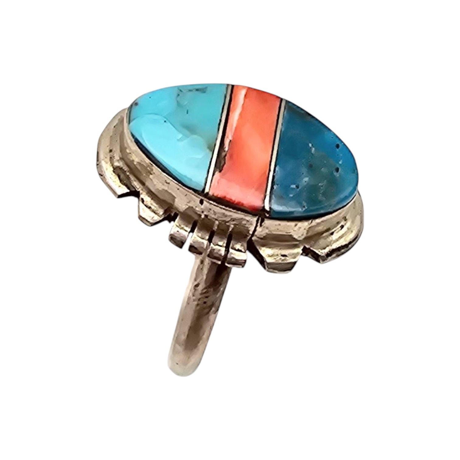 Handcrafted by Brandon Etcity, this Navajo ring features a sterling silver band and an inlaid design with turquoise and coral stones. The ring is marked ‘sterling’ and ‘RE’ on the underside. It weighs approximately 6.3 grams. Designed in size 10, it showcases the artisan’s craftsmanship and traditional Navajo artistry.