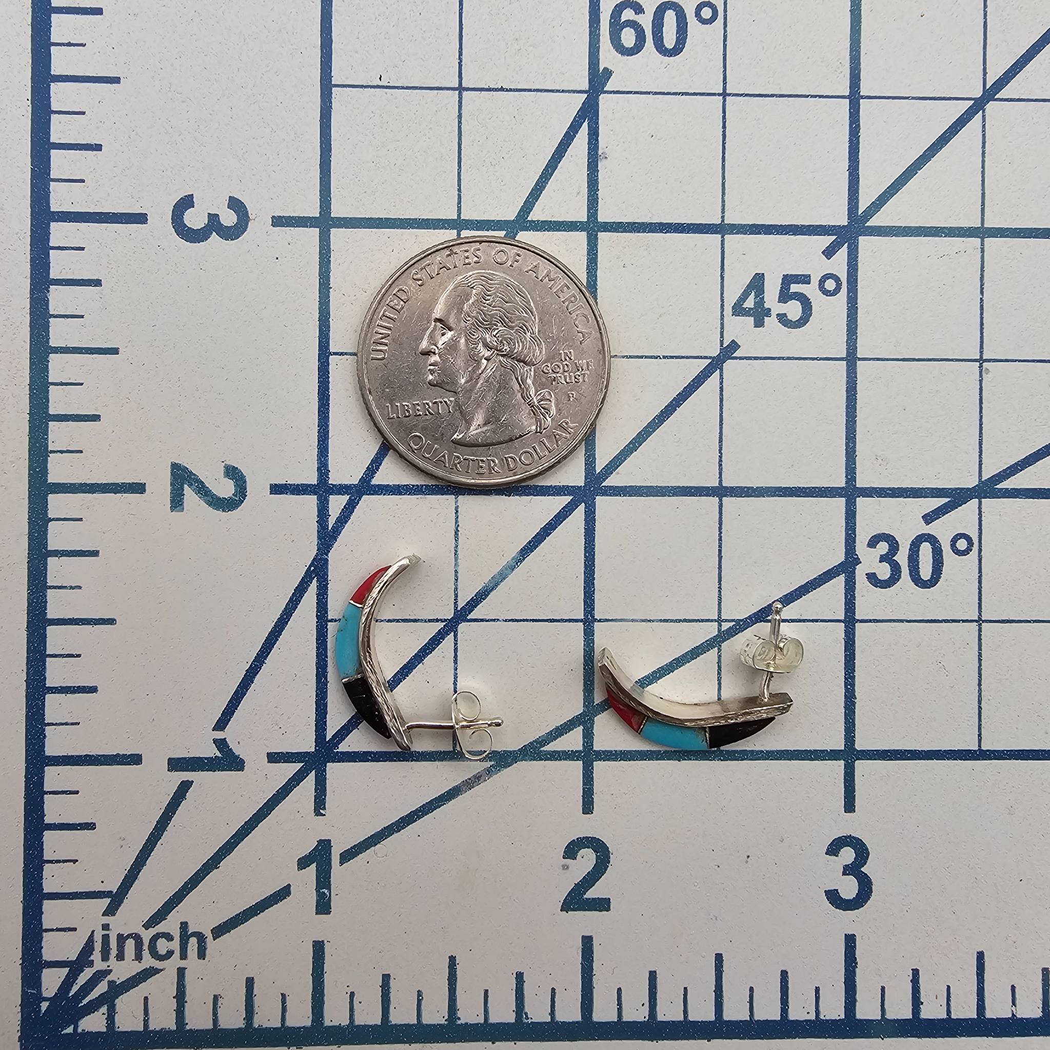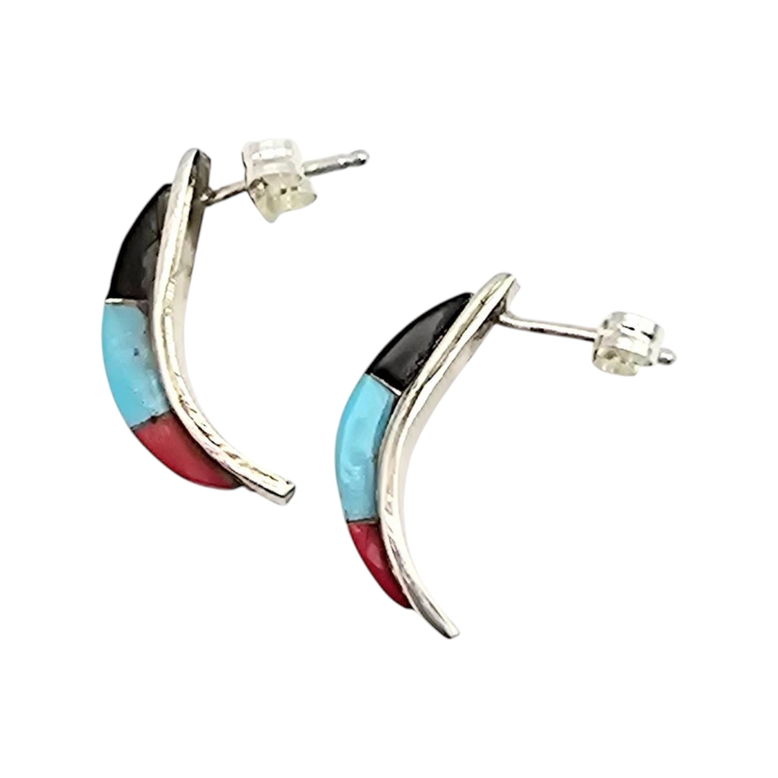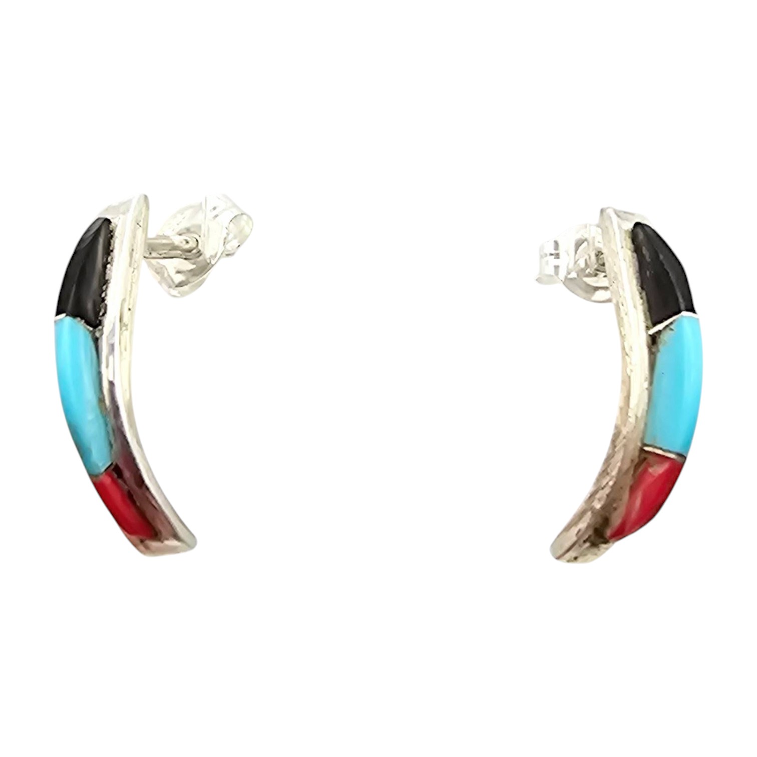 Ken Lonjose Zuni handmade sterling silver half-hoop earrings featuring multi-stone inlay design. The stones include turquoise, red coral, and black onyx, characteristic of Zuni craftsmanship. The earrings weigh approximately 1.5 grams and have a post-back closure.