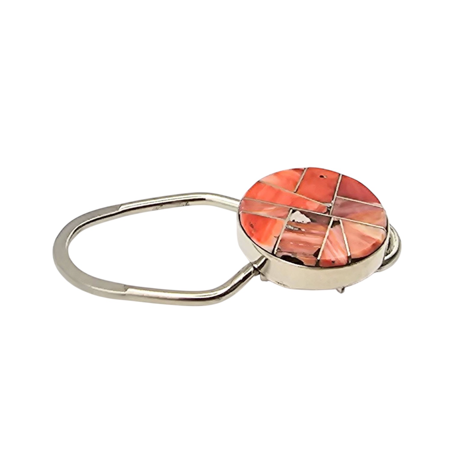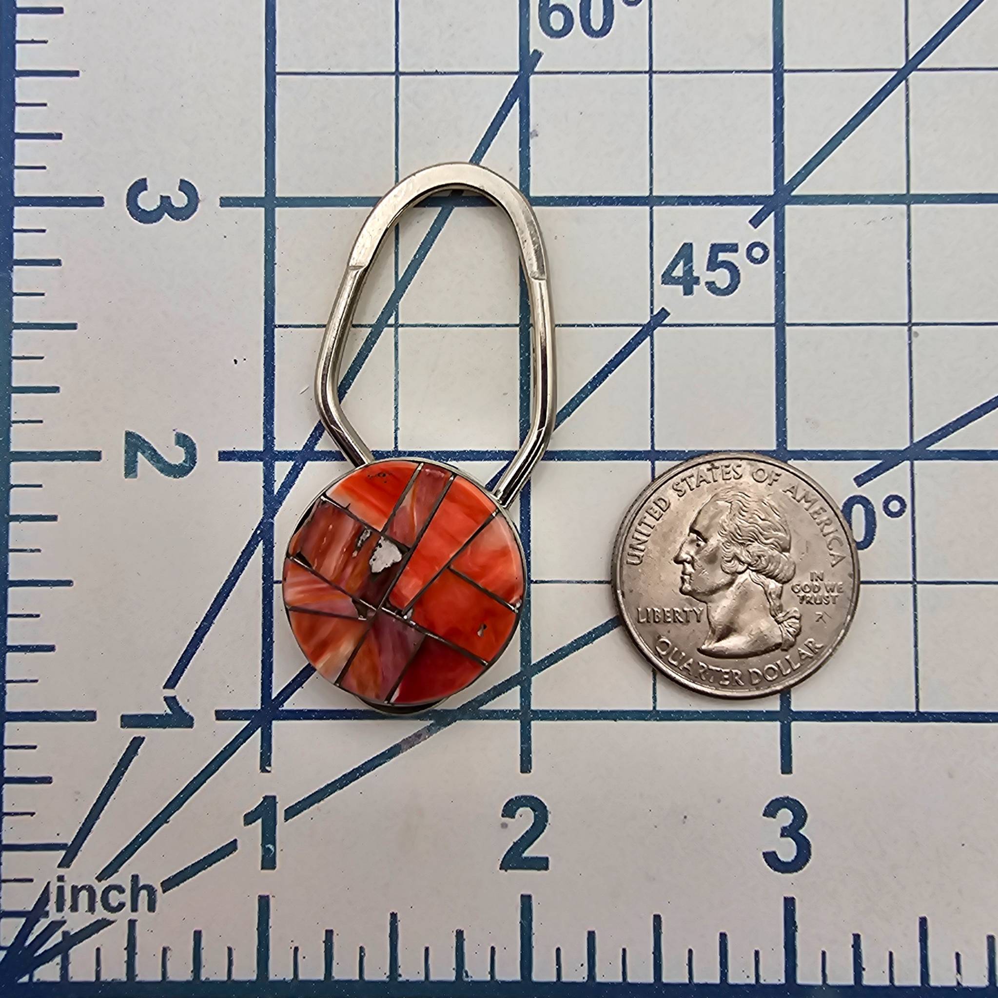 Handmade by Arnold Yazzie, this Navajo key ring features spiny oyster inlaid in a circular design with silver-tone lining. The piece weighs 12.2 grams, as shown in the images. It is an elegant and functional piece of Native American craftsmanship, showcasing traditional materials and artistry.