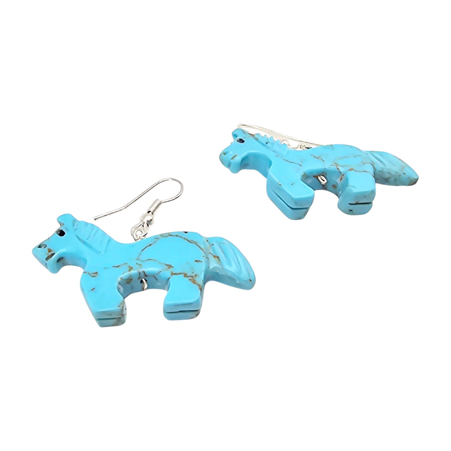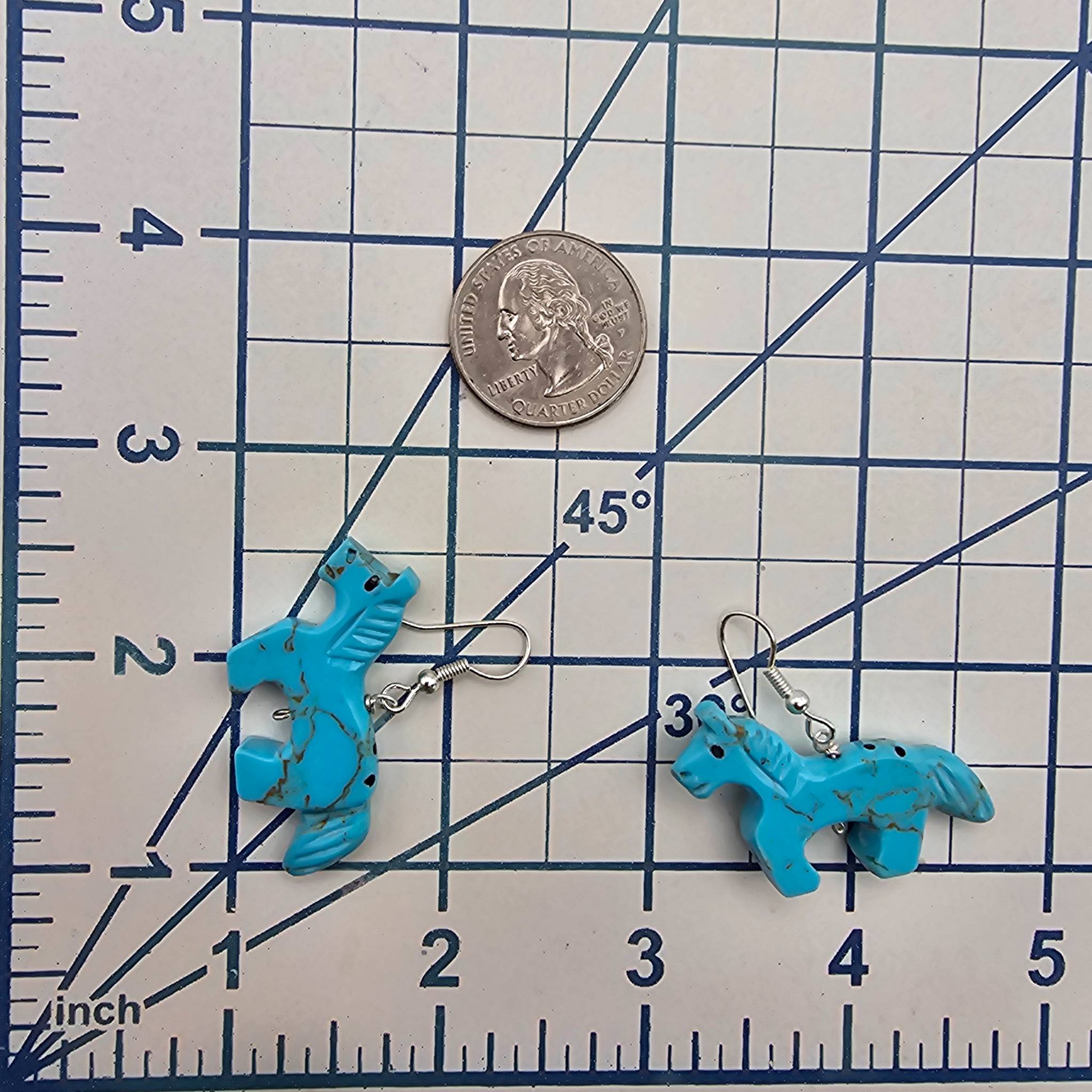 Navajo handmade turquoise stone fetish earrings by Ben Livingston, featuring horse-shaped carvings. Crafted with vibrant turquoise and accented with sterling silver ear hooks. The intricate design showcases traditional Navajo artistry. Weighs approximately 11.3 grams total. Dimensions indicated on the measurement grid and scale.