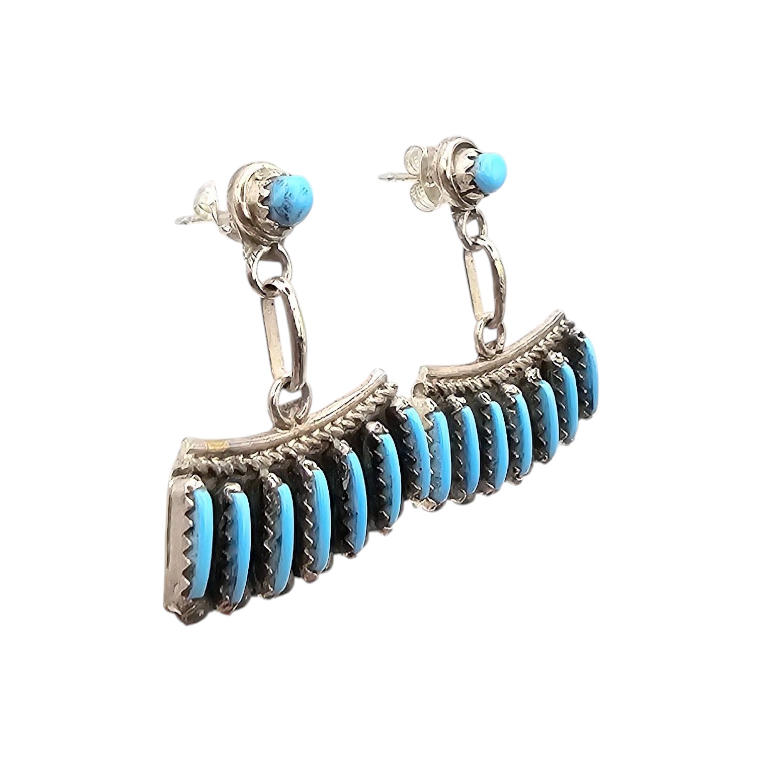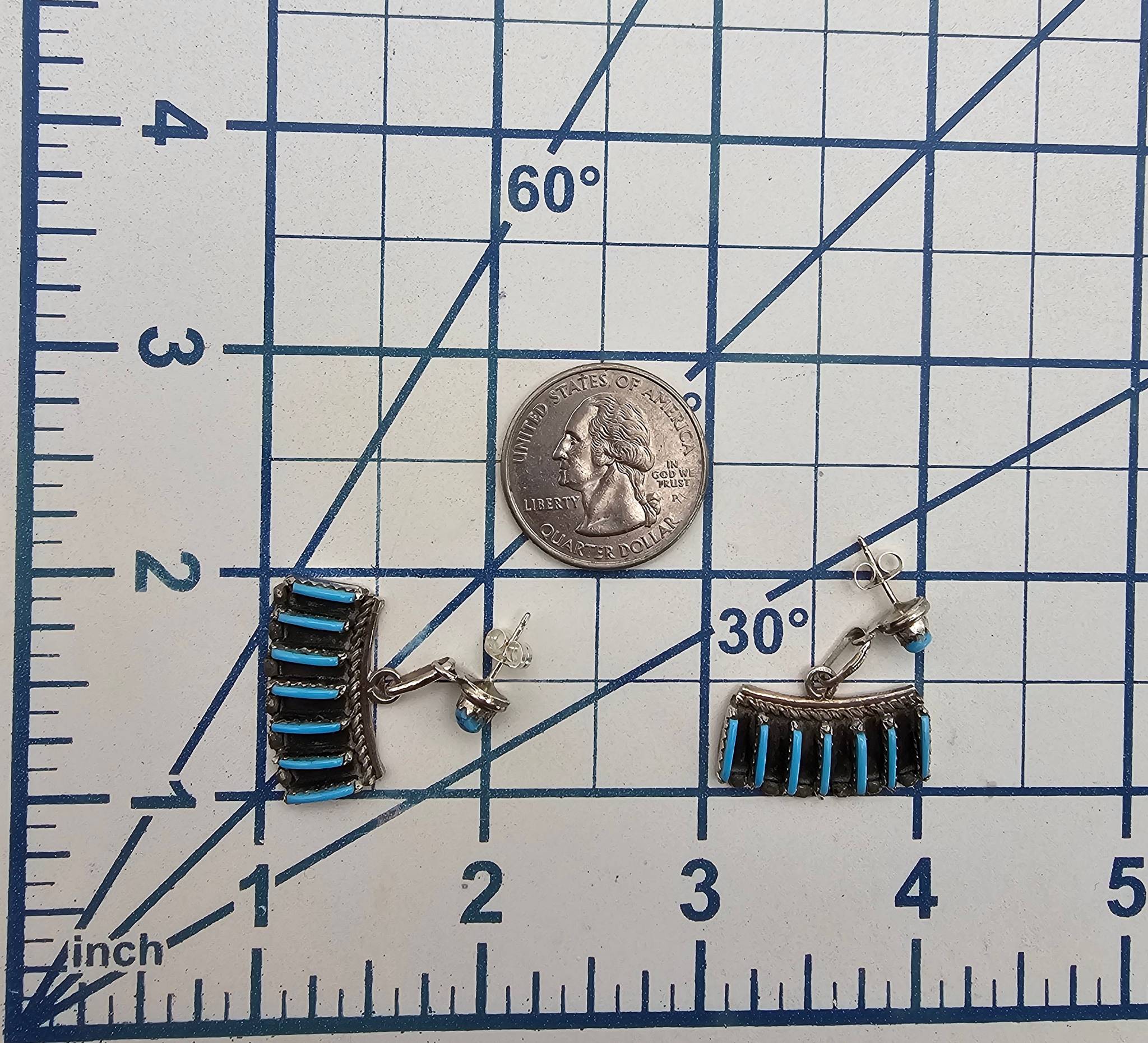 Davis Kaamasee Zuni handcrafted sterling silver earrings featuring Kingman turquoise stones. The earrings are adorned with intricate channel inlay turquoise bars and a single round turquoise stone at the base of the post. Marked “Sterling DK” on the back. Total weight of the pair is 6 grams. Includes post and back closures.