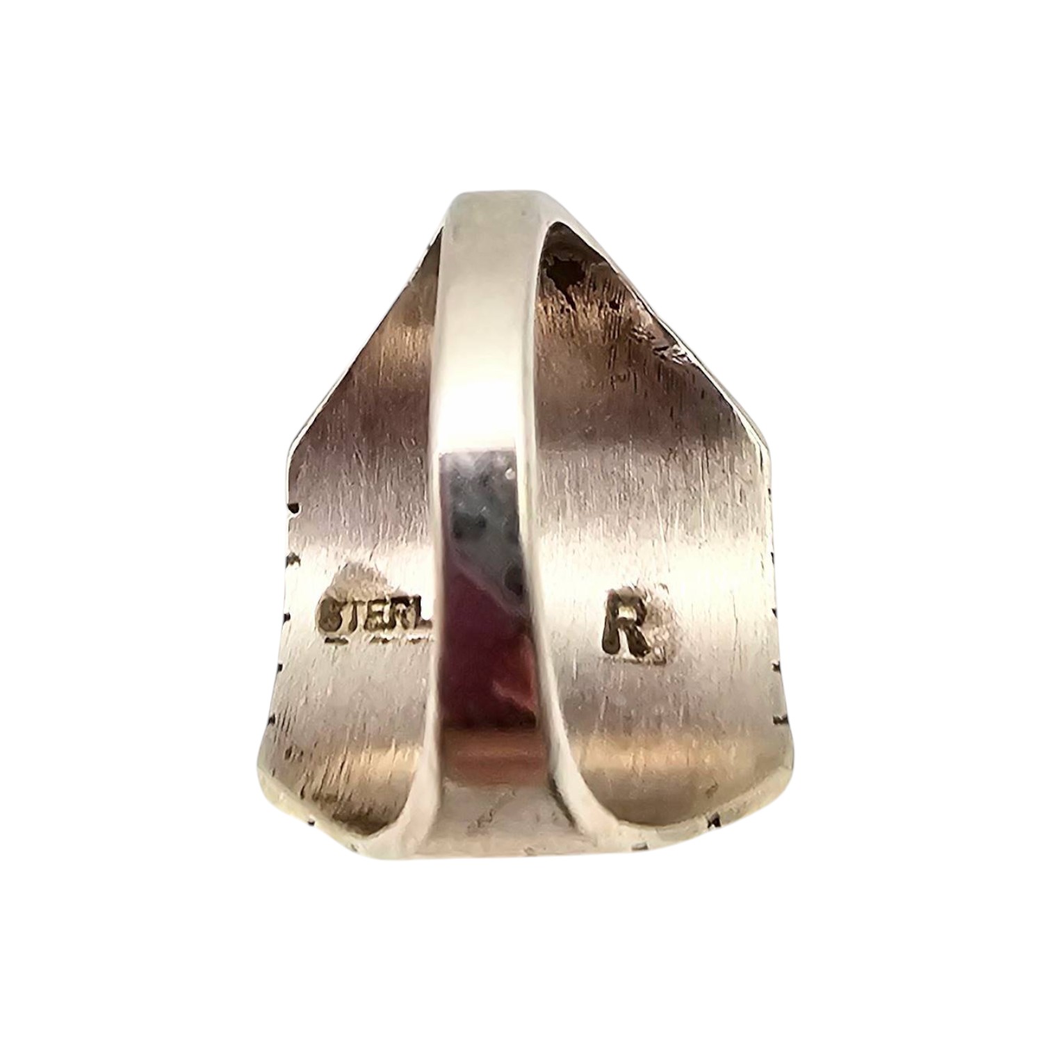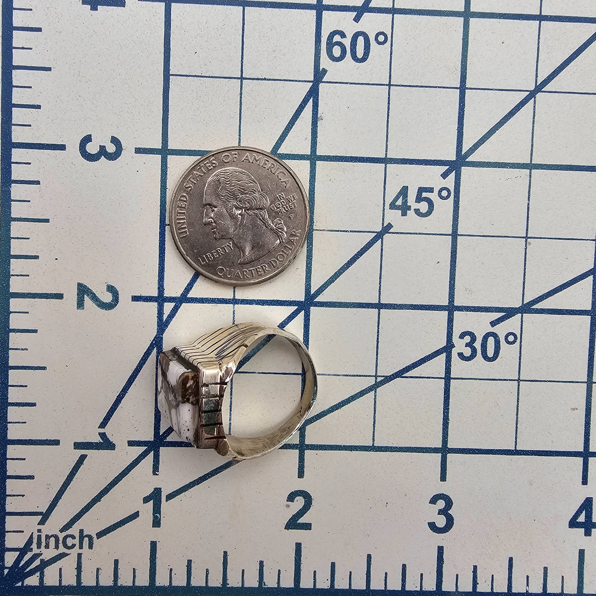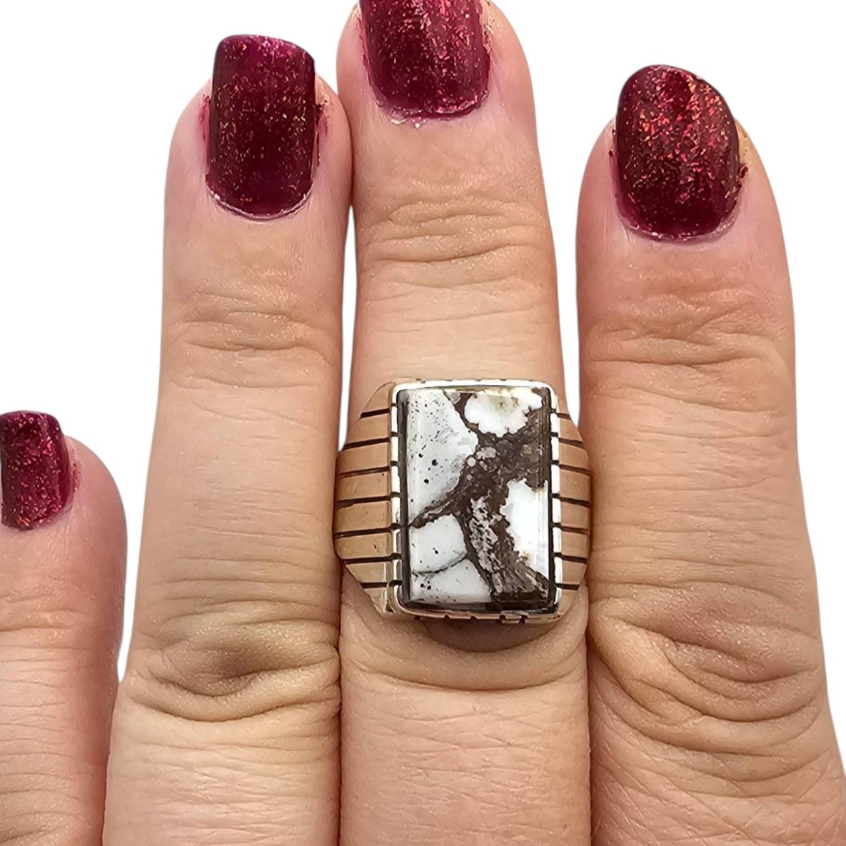 Handmade sterling silver ring by Navajo artisan Ray Jack, featuring a rectangular Wild Horse stone centerpiece with brown and white patterns. The ring is marked ‘STERL’ and ‘R’ on the inner band. Weighs 9.3 grams and is sized at 8.5. Detailed with ribbed accents on the band, this piece showcases traditional Native American craftsmanship.