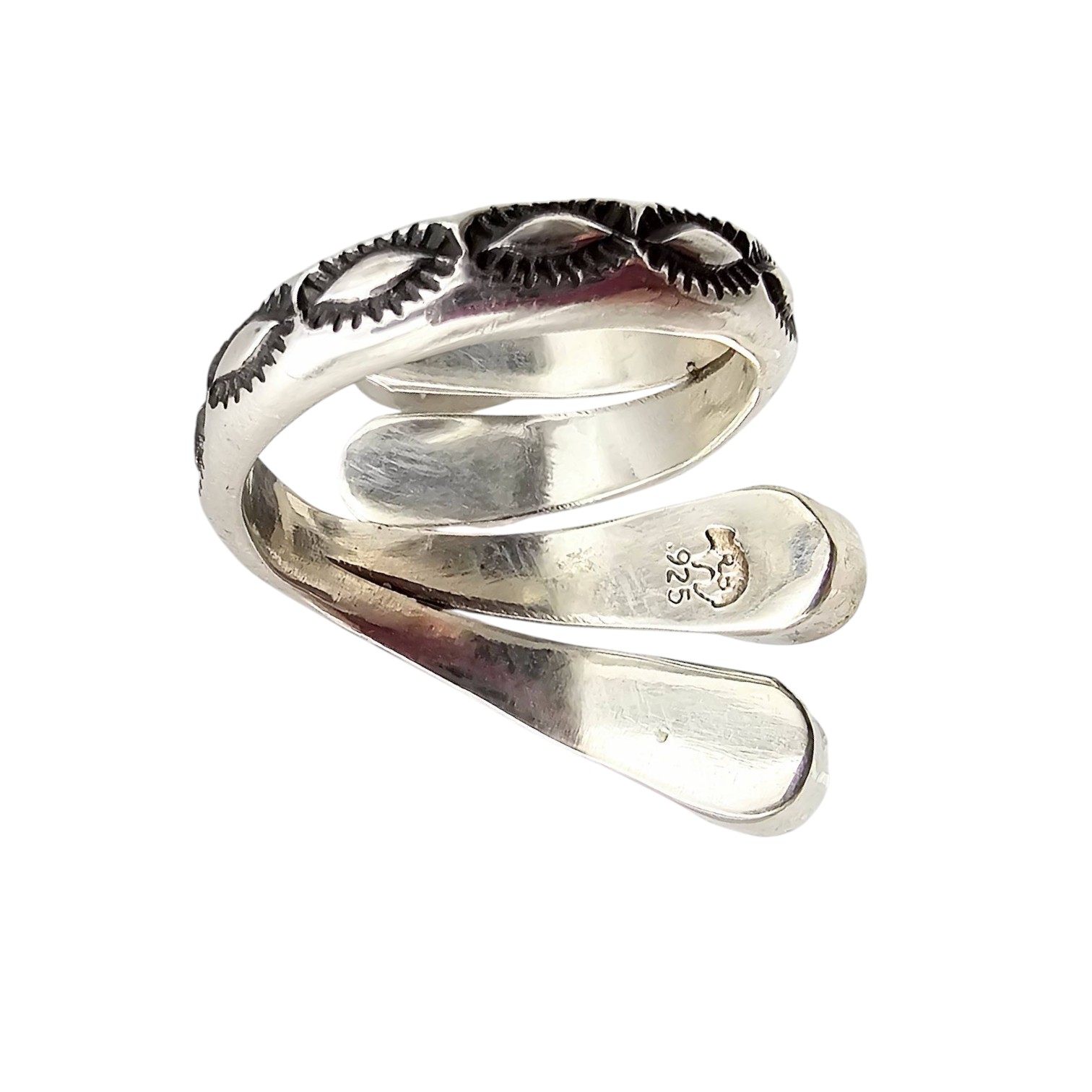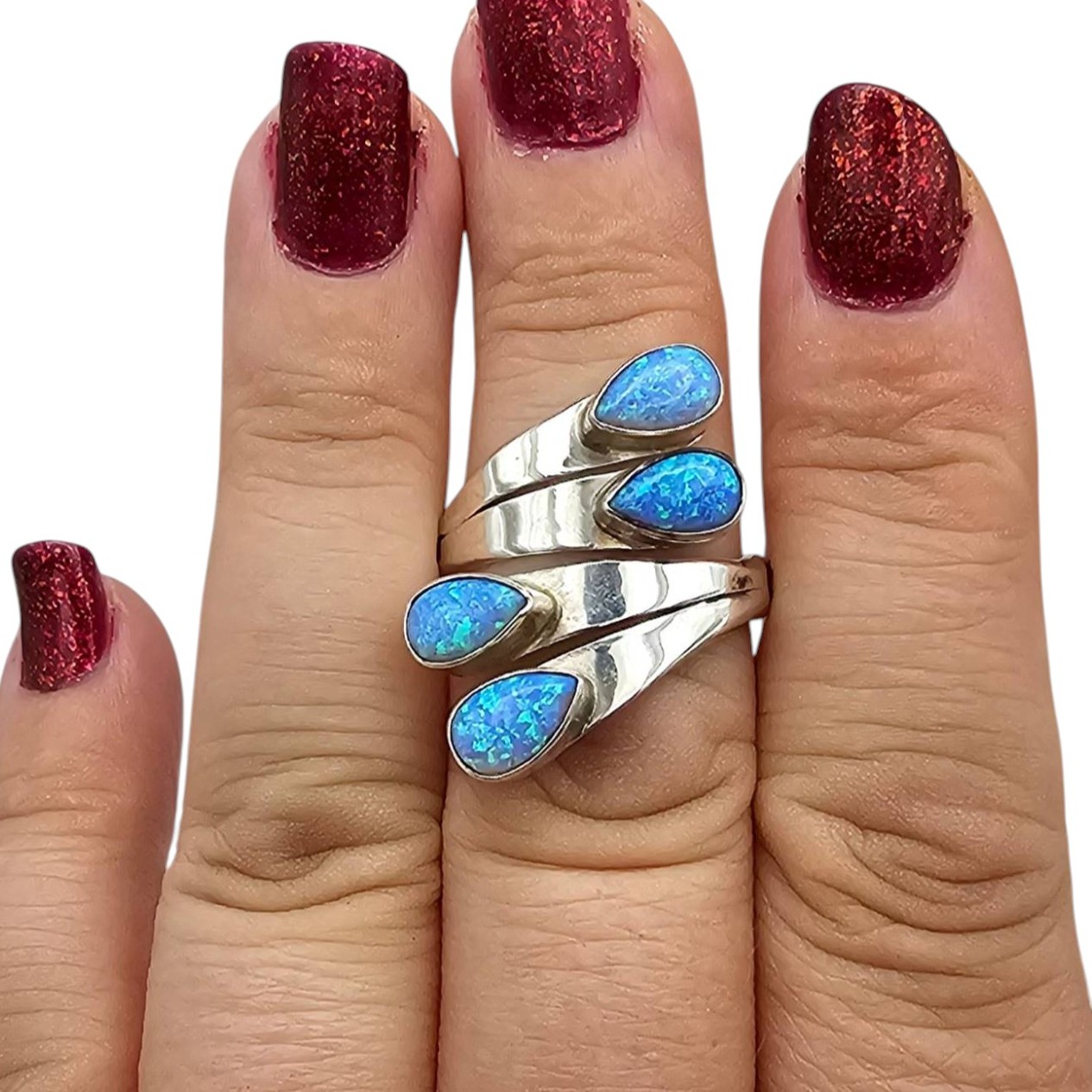 Handmade sterling silver ring by Navajo artisan Thomas Yazzie featuring four opal inlay stones. The adjustable design allows for flexible sizing, and the band includes intricate patterns. Weighs approximately 5.9 grams. Ideal for collectors of Native American jewelry or opal lovers.