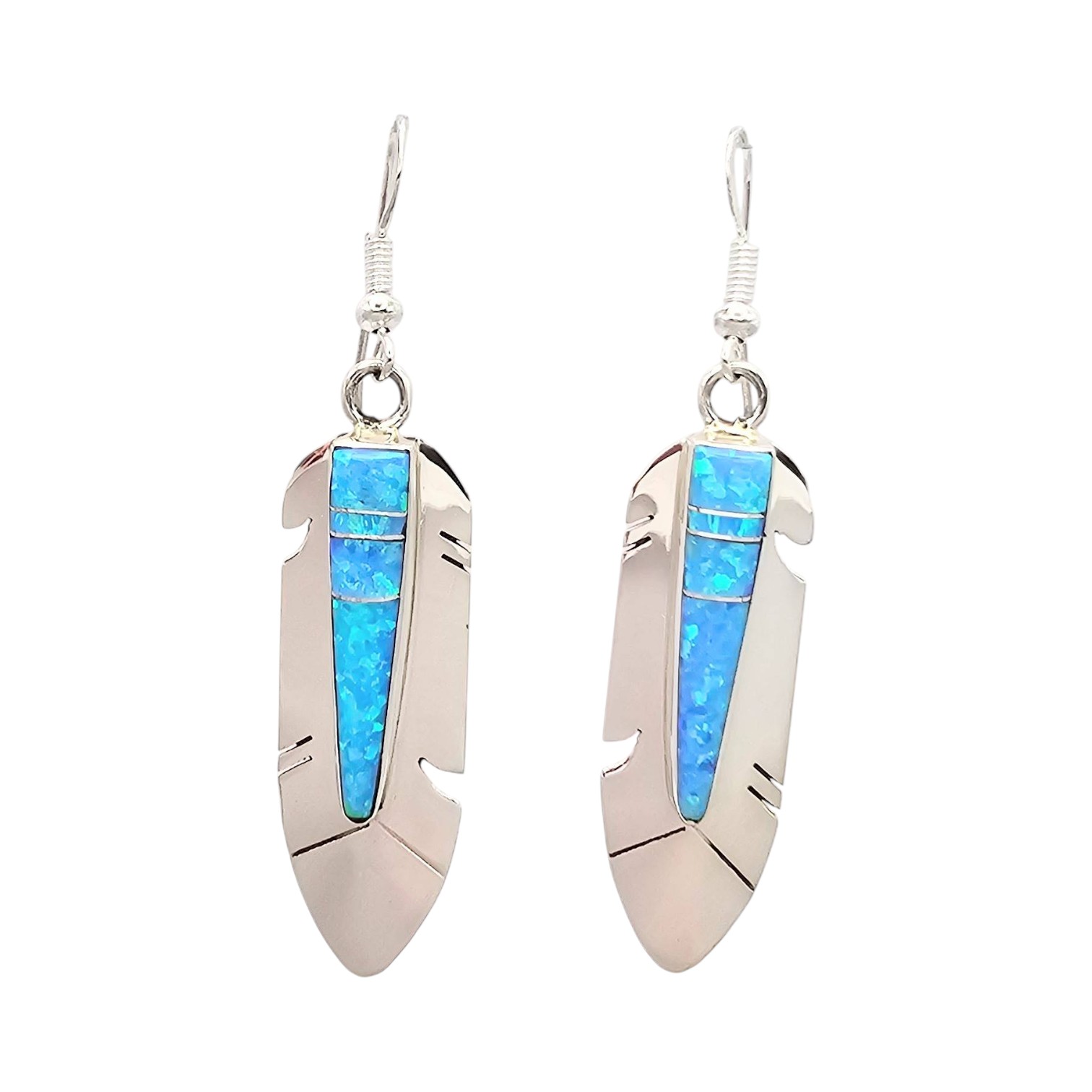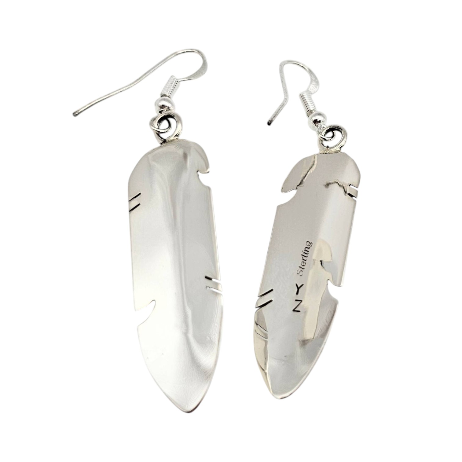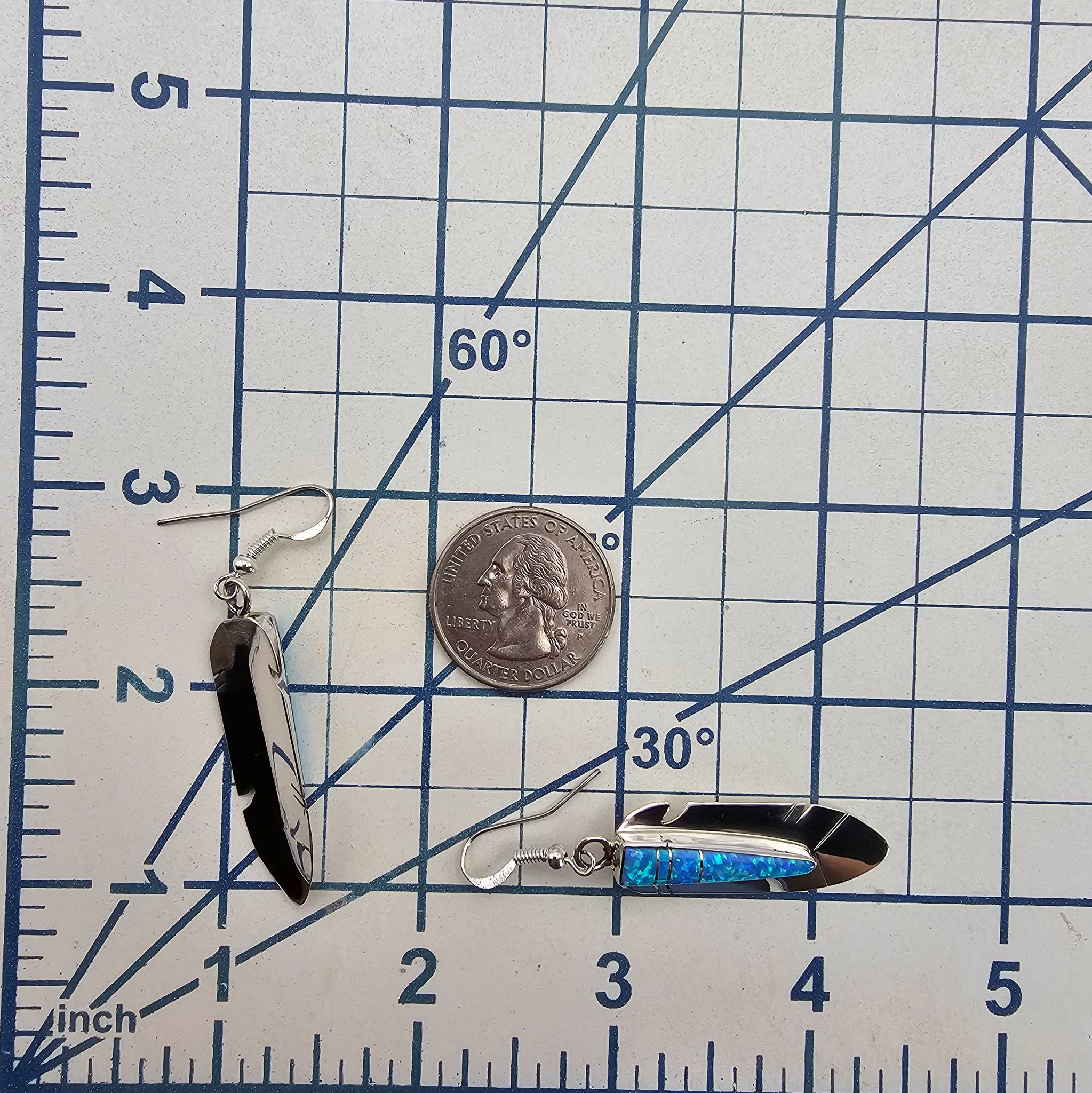 Mary Yazzie Navajo handmade sterling silver earrings showcasing an intricate feather design with opal inlays. These lightweight earrings weigh 5.5 grams collectively and measure approximately 2.5 inches in length, including the hooks. The initials ‘YZ’ on the back indicate the artisan’s mark. Excellent craftsmanship represents the rich tradition of Navajo jewelry.