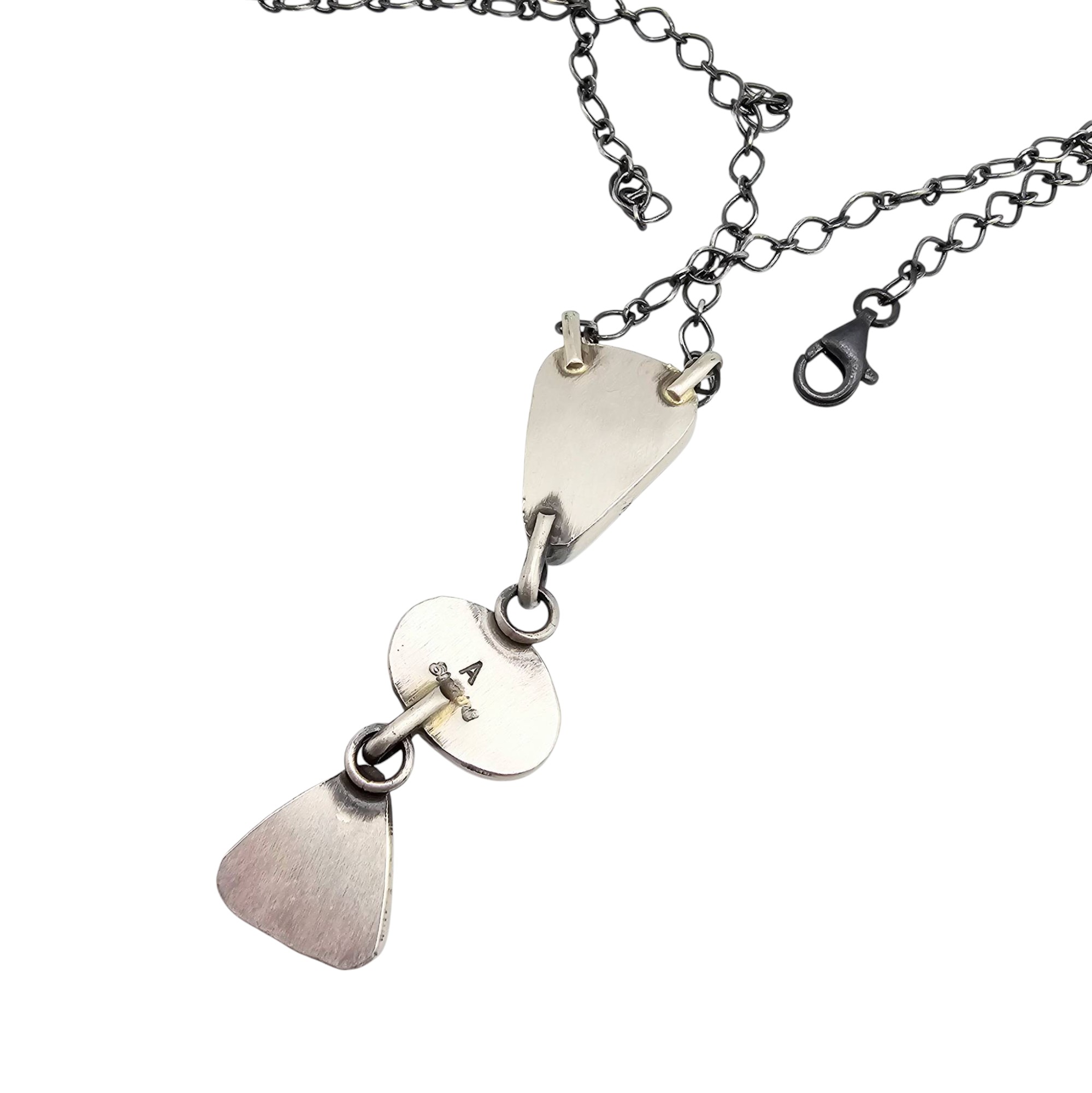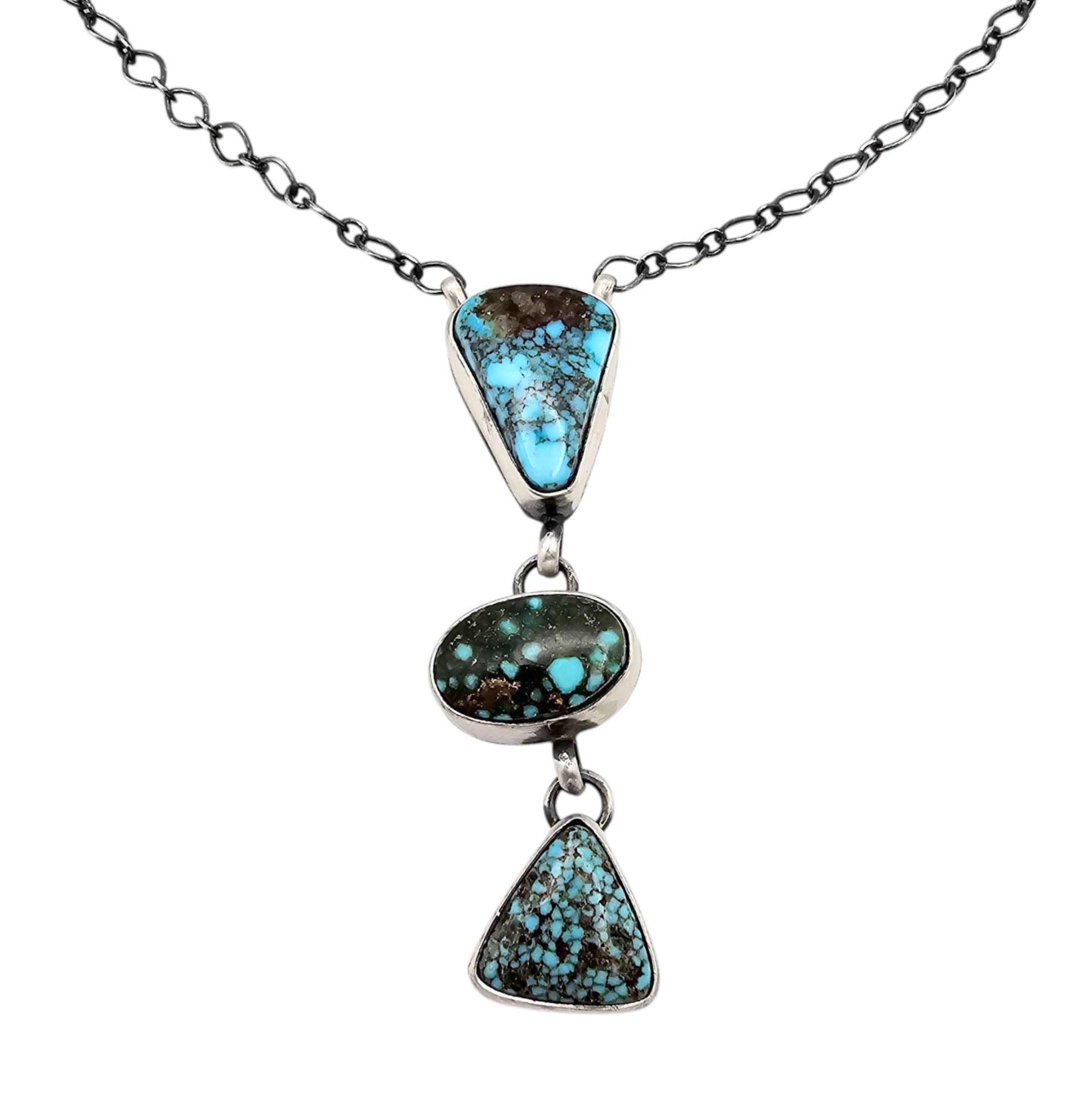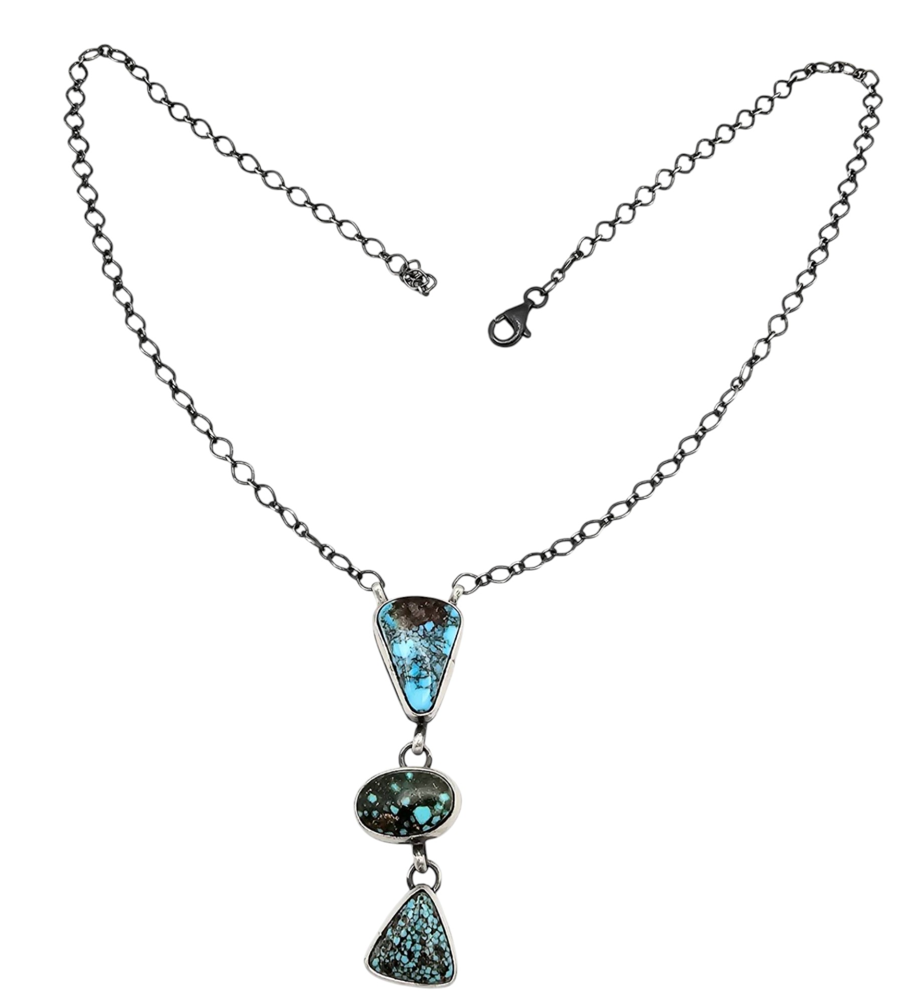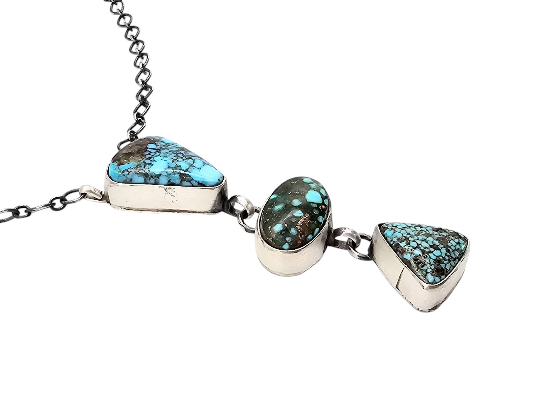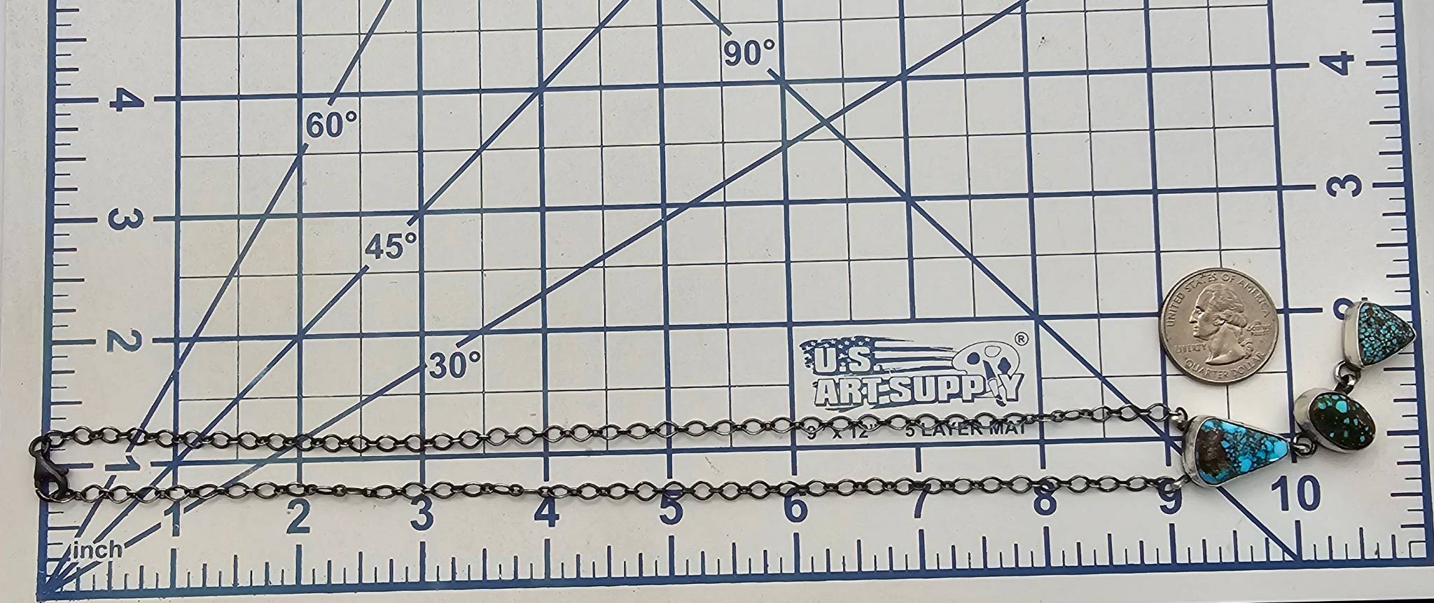 Handmade sterling silver necklace by Navajo artisan Antoinette Martinez, featuring three Sonoran Gold turquoise stones in varied shapes. The necklace has a lobster clasp closure and a total weight of 13.9 grams. The stones display vivid blue-green hues with natural matrix patterns. The piece measures approximately as shown against a ruler, with chain links for size adjustment.