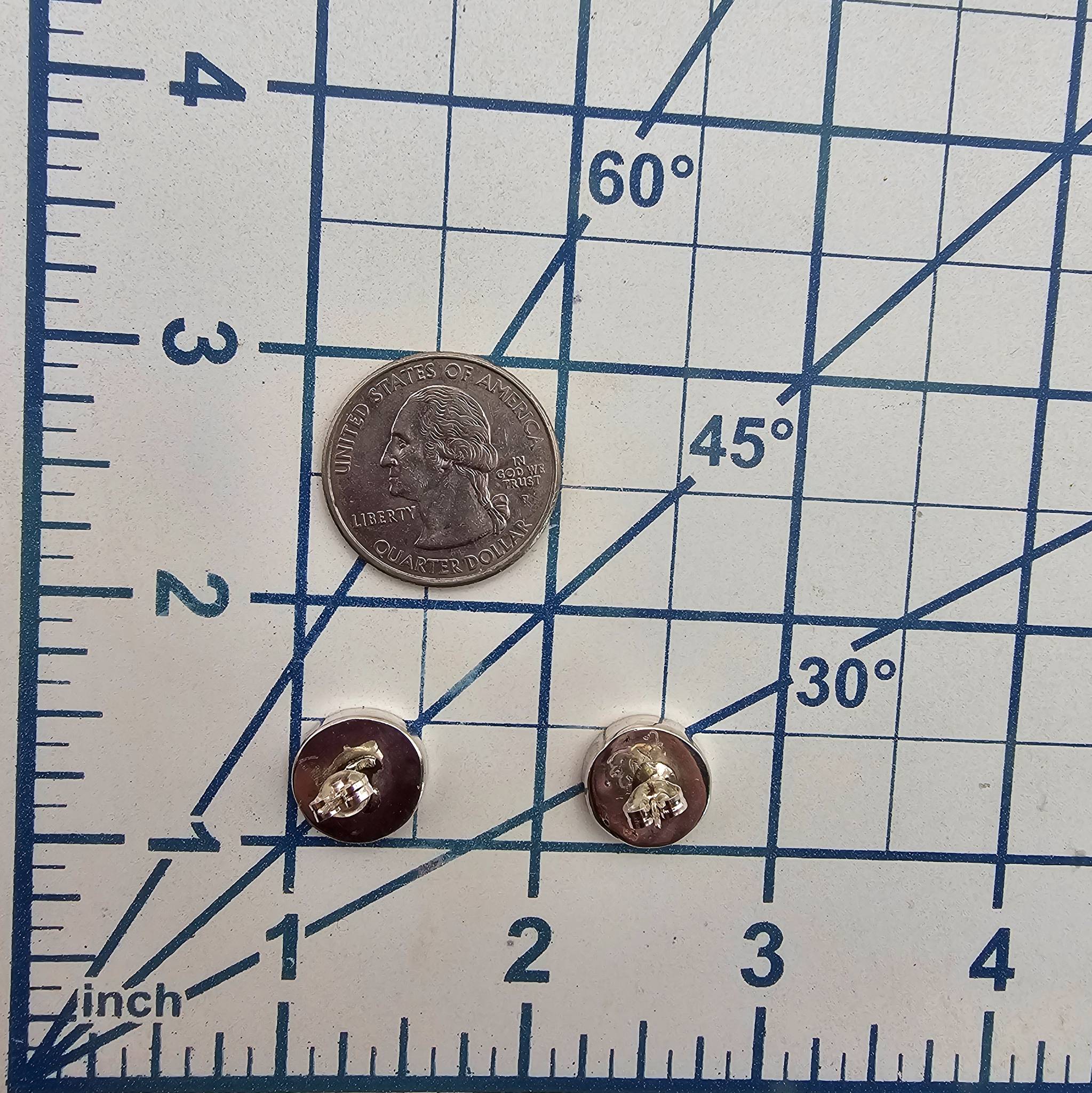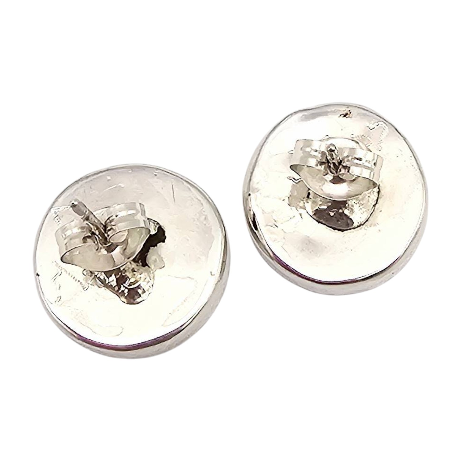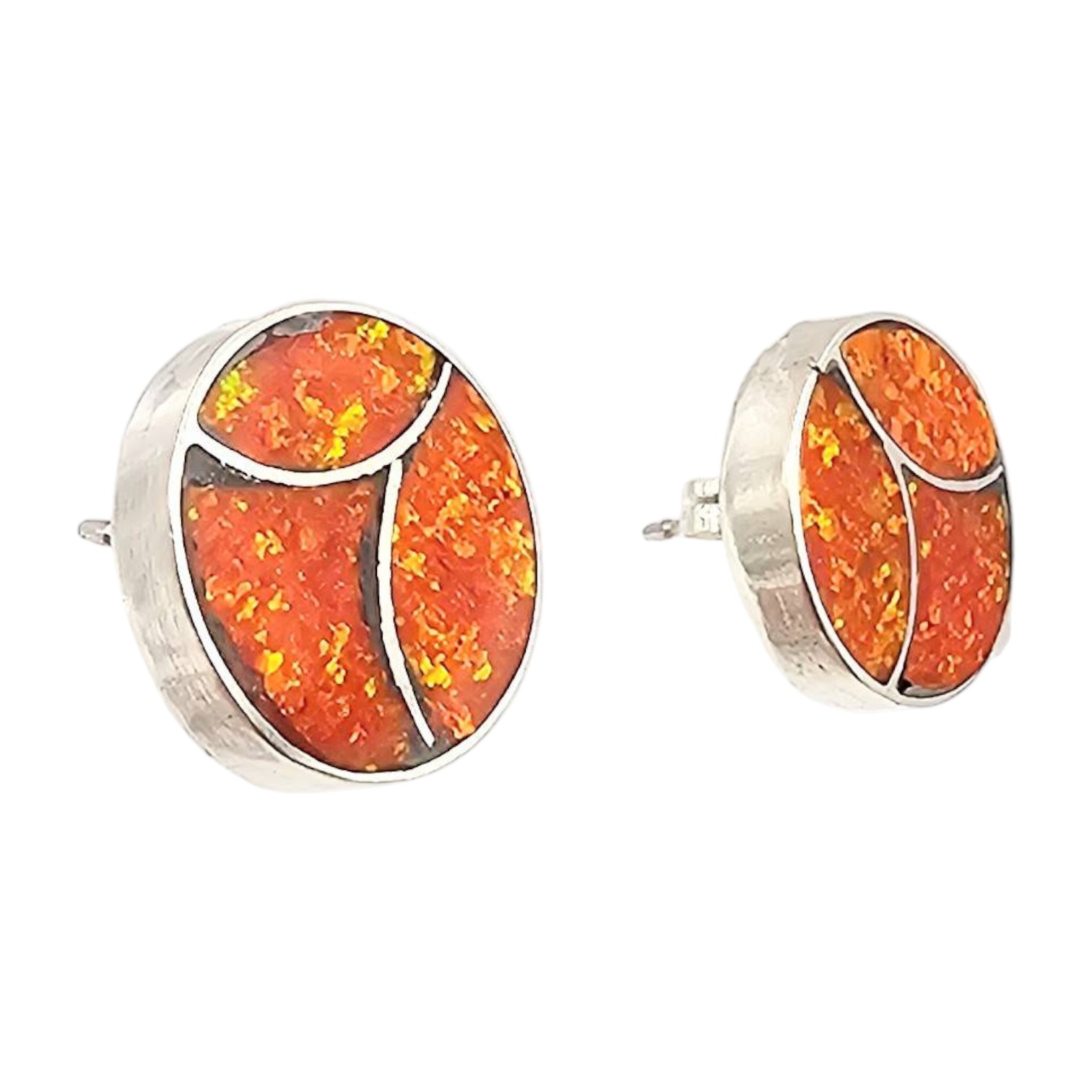 Zuni handmade earrings by Carmichel Halo, crafted from sterling silver and featuring vibrant orange opal inlay in a circular design. These earrings weigh 2.8 grams and include sterling silver posts with butterfly backings for secure wear. Suitable for collectors or everyday wear.