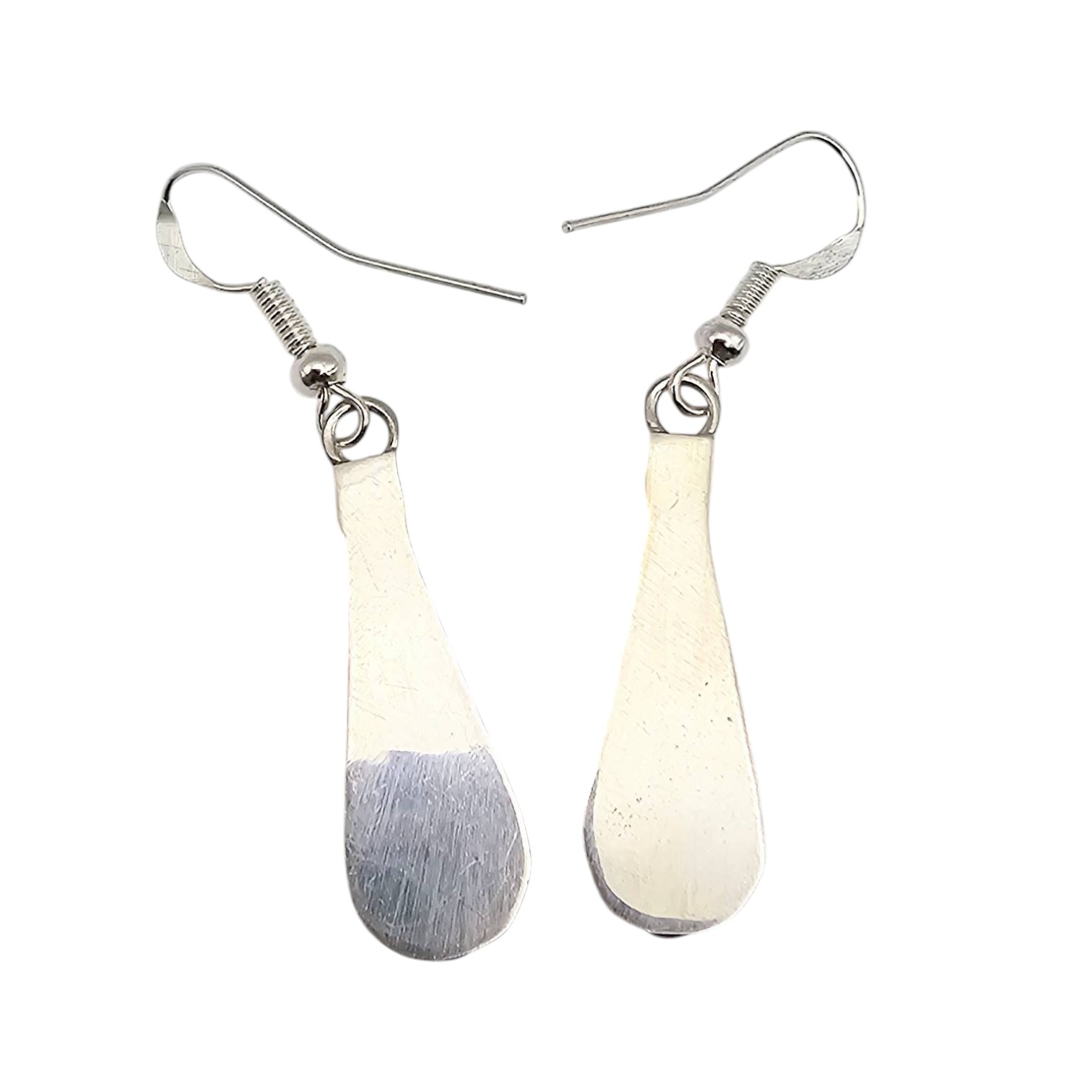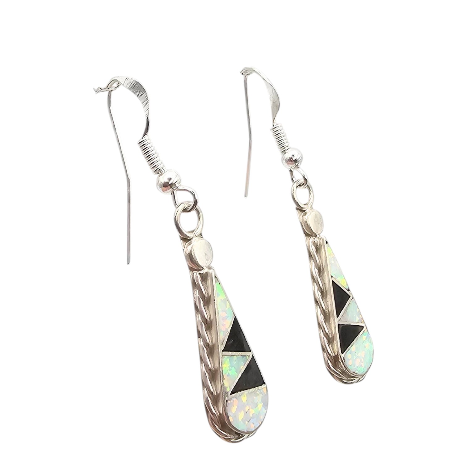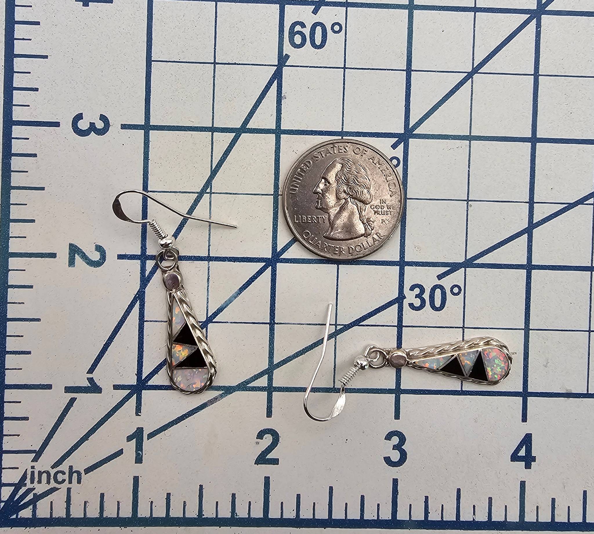 Handmade earrings crafted by Swain Charlie, a Zuni artisan. Made from sterling silver, these earrings feature inlaid multi-stone opal and onyx designs with geometric patterns. They weigh 3.9 grams and measure approximately 1.75 inches in total length, including the ear wires. They showcase traditional Zuni craftsmanship with intricate stonework and silver detailing.