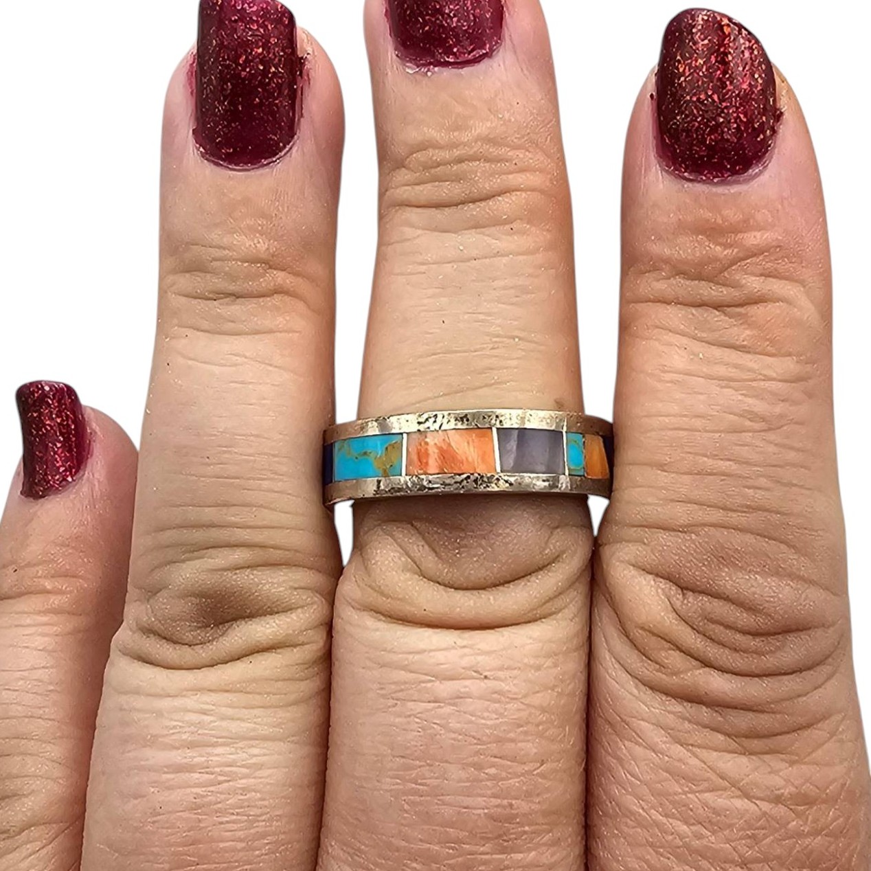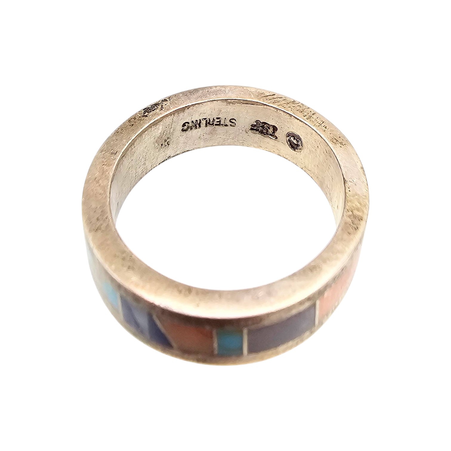 A handmade sterling silver multi-color inlay ring by Navajo artisan Valerie Yazzie. The inlay features a combination of vibrant colors, including turquoise, coral, and purple stones. The ring is stamped with the artist’s mark and ‘Sterling’. It weighs 7.1 grams and is marked as size 9.5.