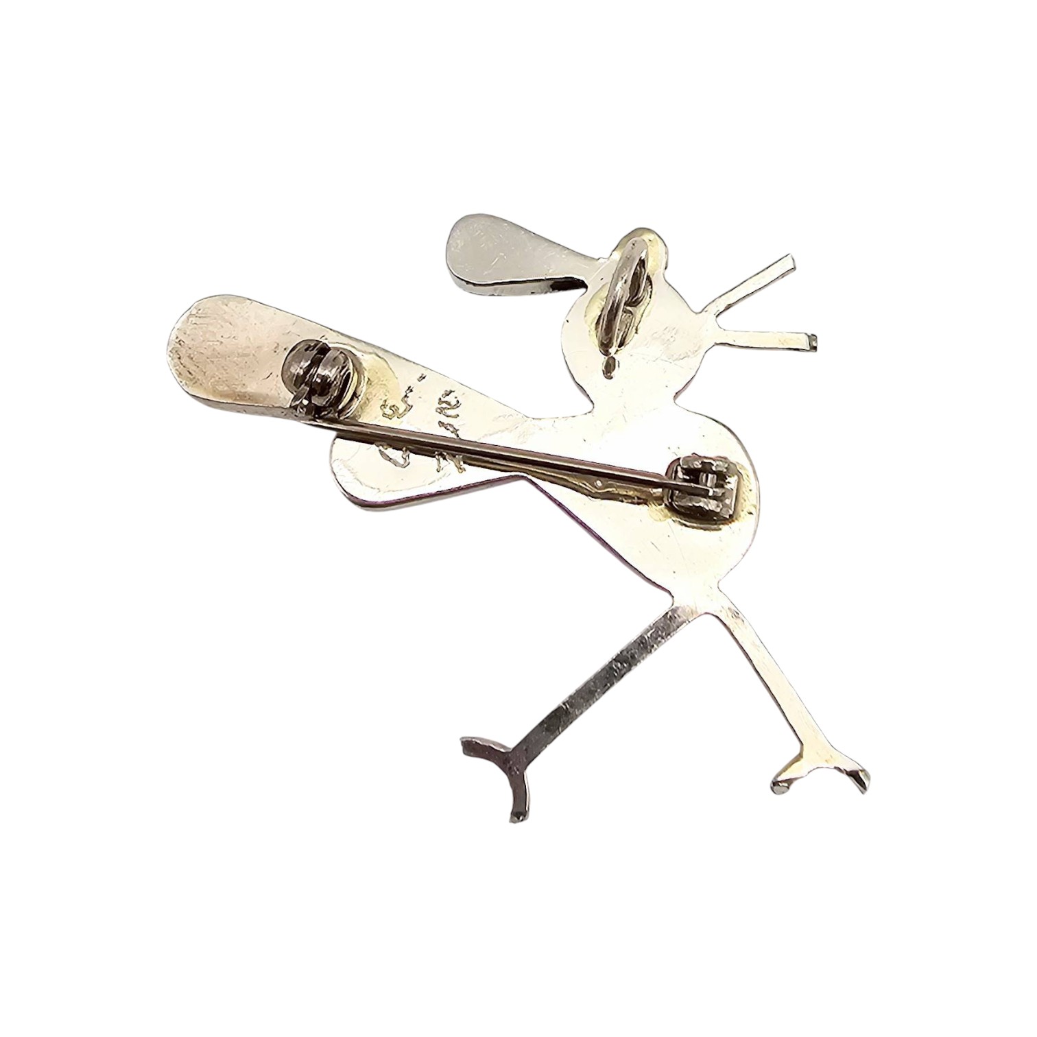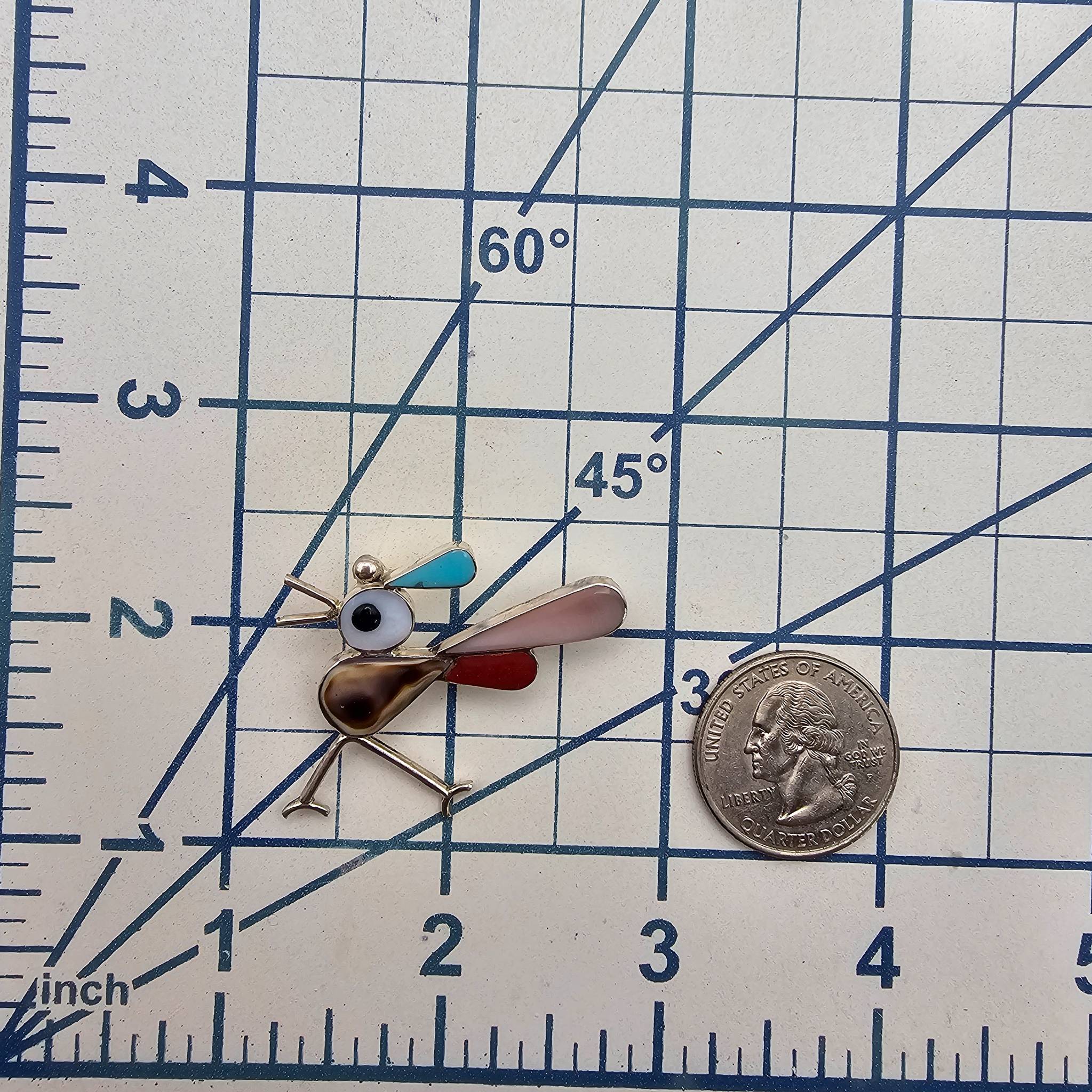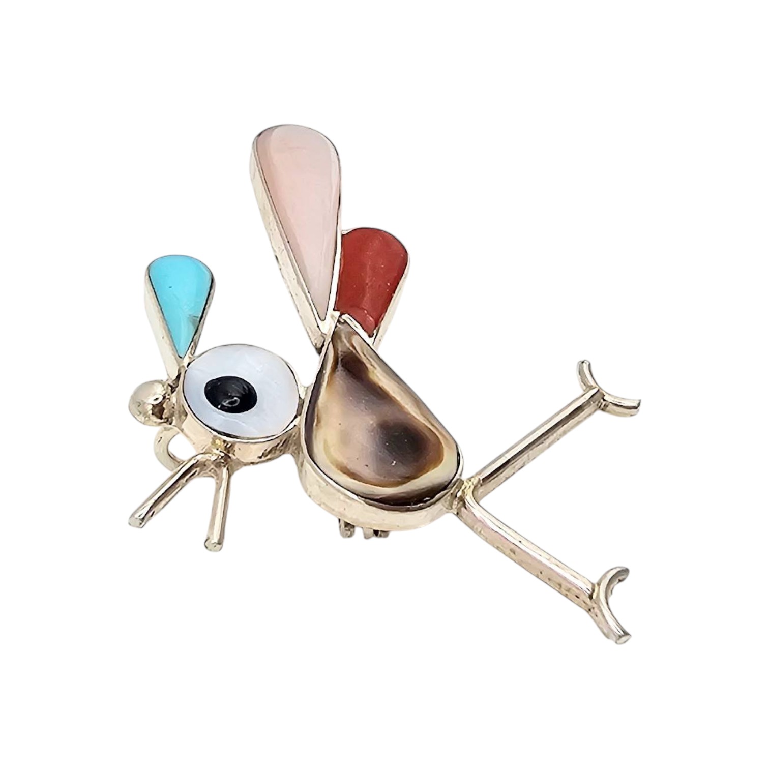 Silver roadrunner brooch by Zuni artist C. E. featuring intricate multi-stone inlay including turquoise, mother of pearl, red coral, and brown shell in sterling silver The design showcases traditional Zuni craftsmanship with detailed stonework and a secure pin mechanism on the back. Weighs approximately 4.1 grams as shown in photos and measures about 2 inches in length.