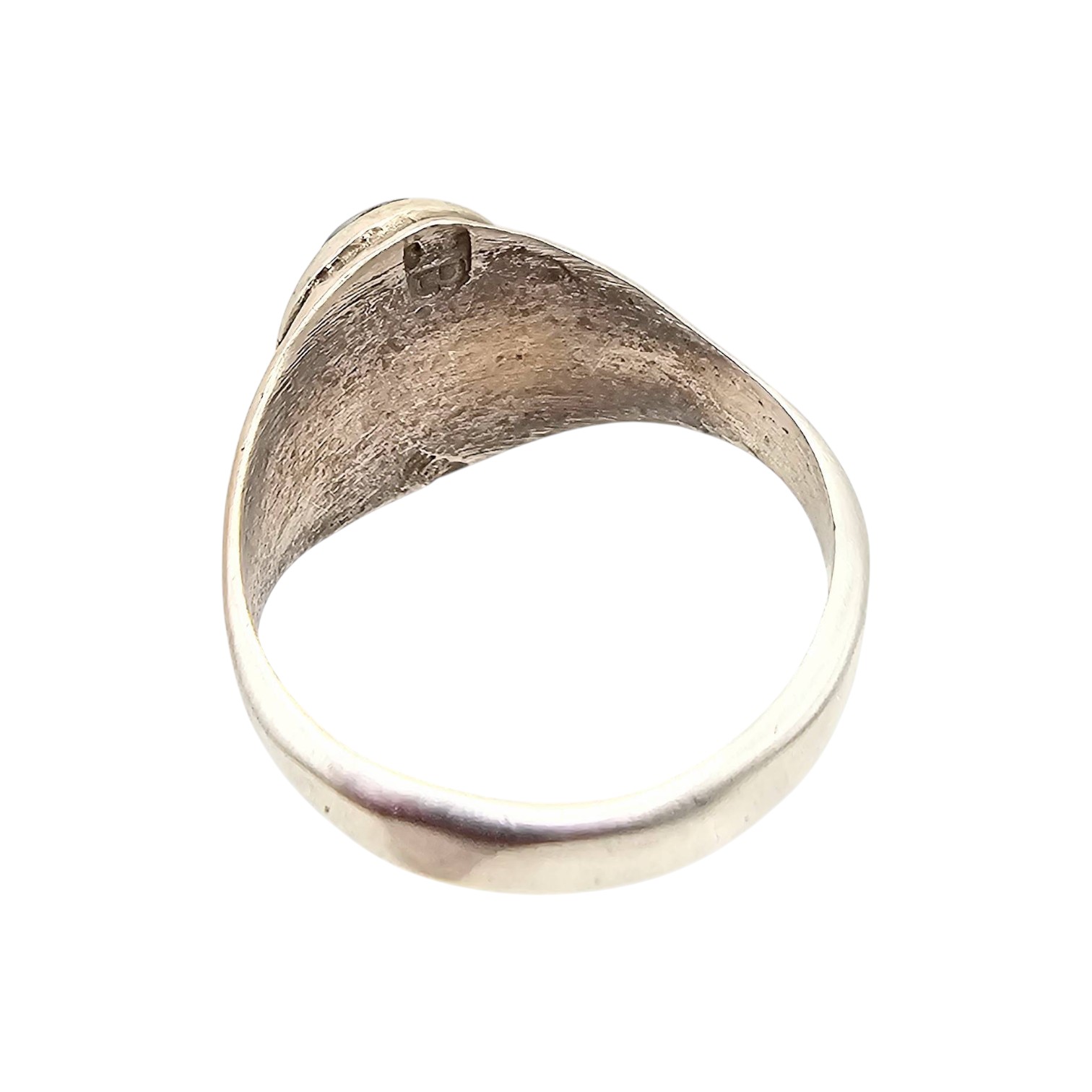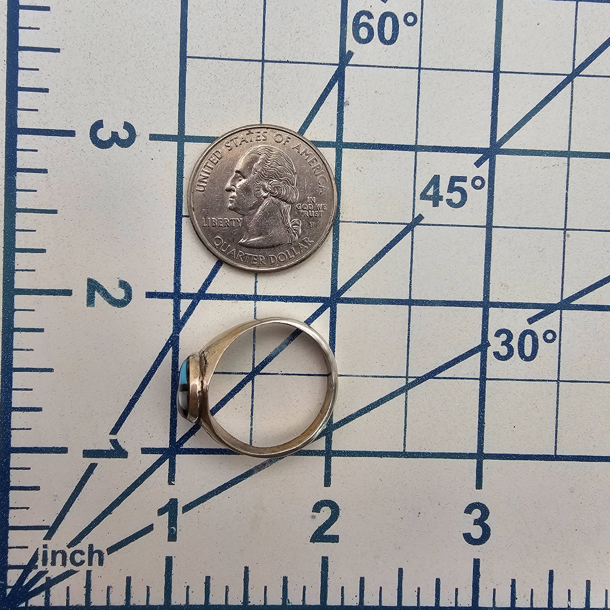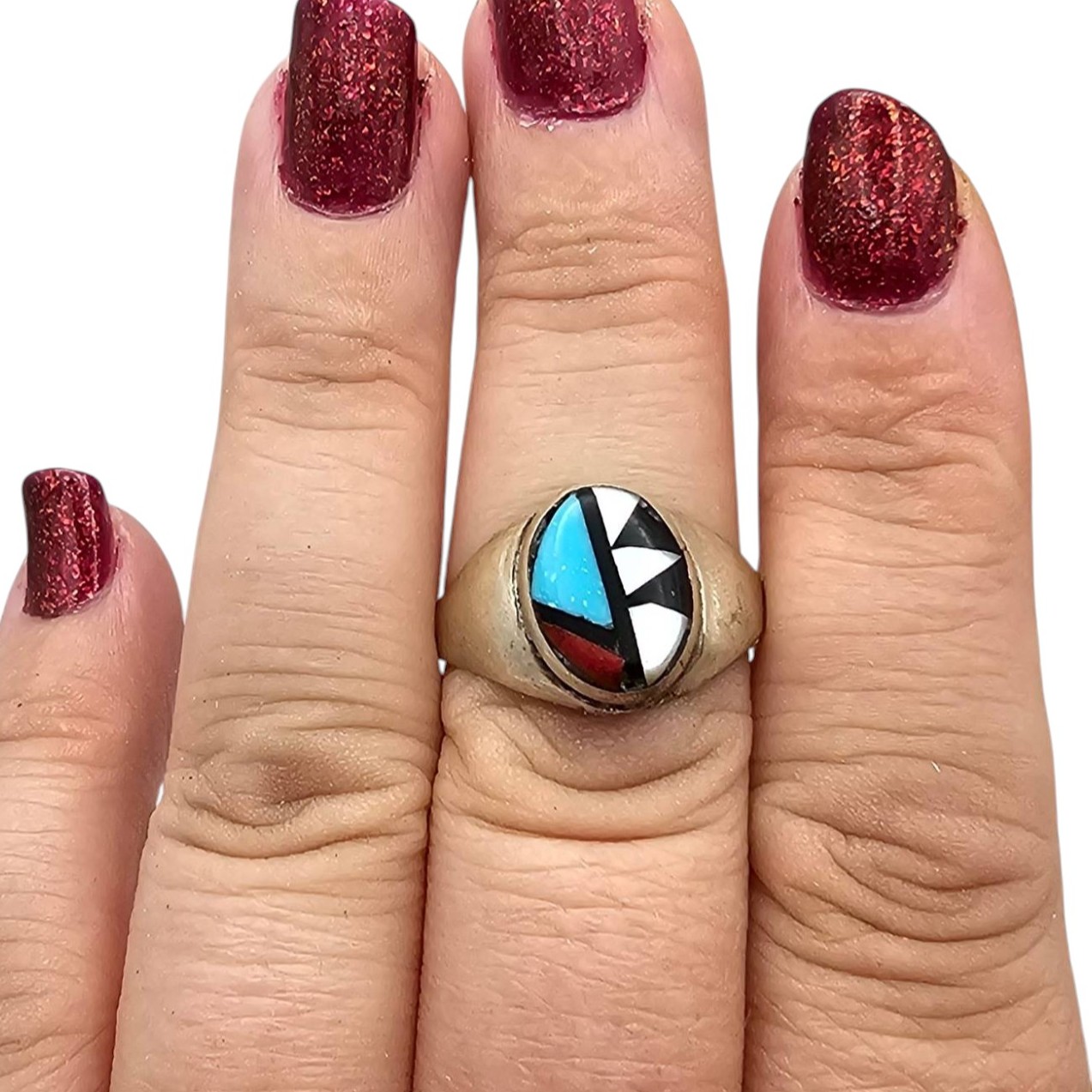 Raymond Bobelu Zuni handmade sterling silver ring featuring a multicolor inlay design with vibrant red, blue, black, and white elements. Size 10, with an approximate weight of 5.4 grams. Crafted by Zuni artisan Raymond Bobelu. Excellent example of Native American jewelry artistry.