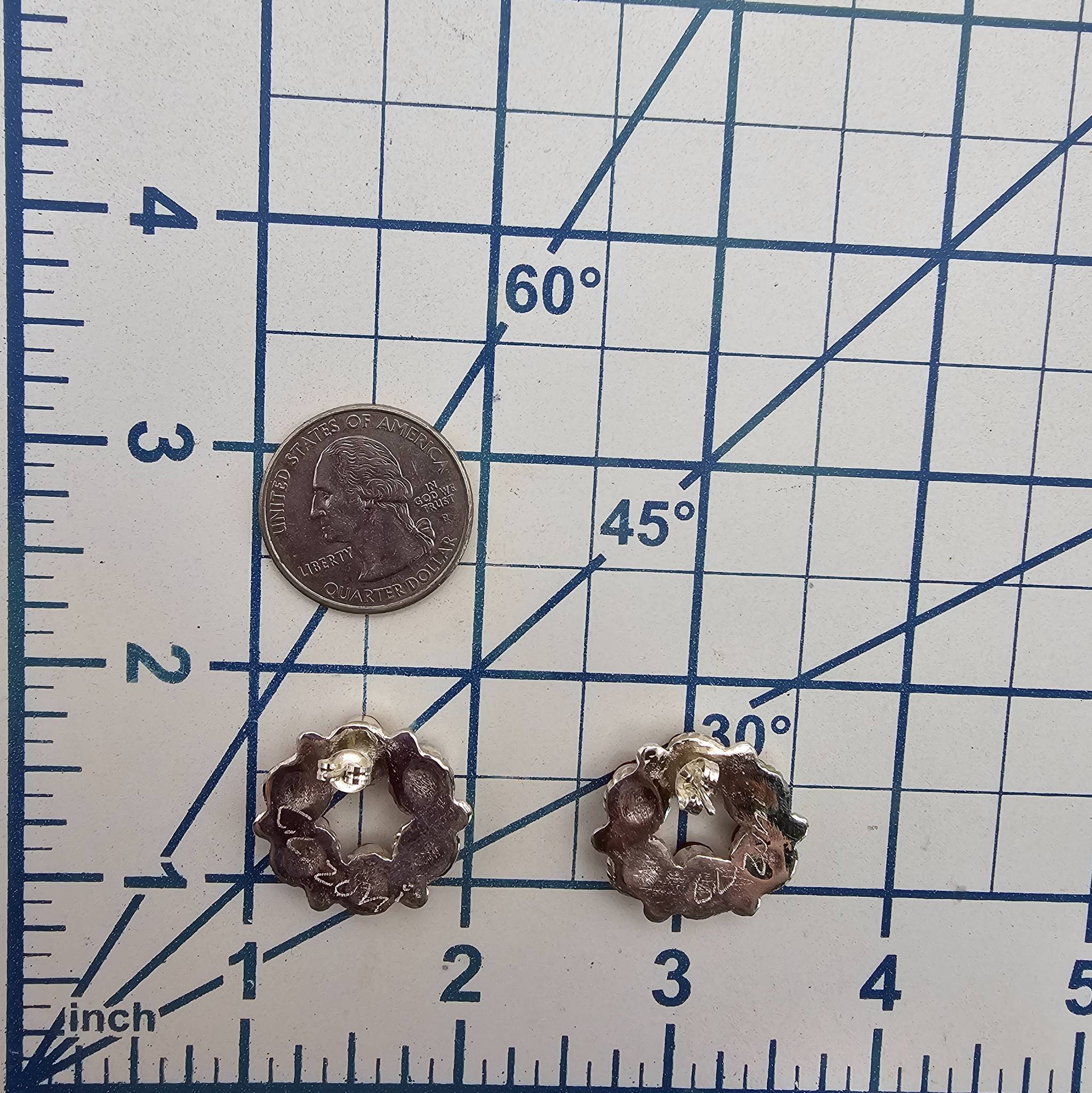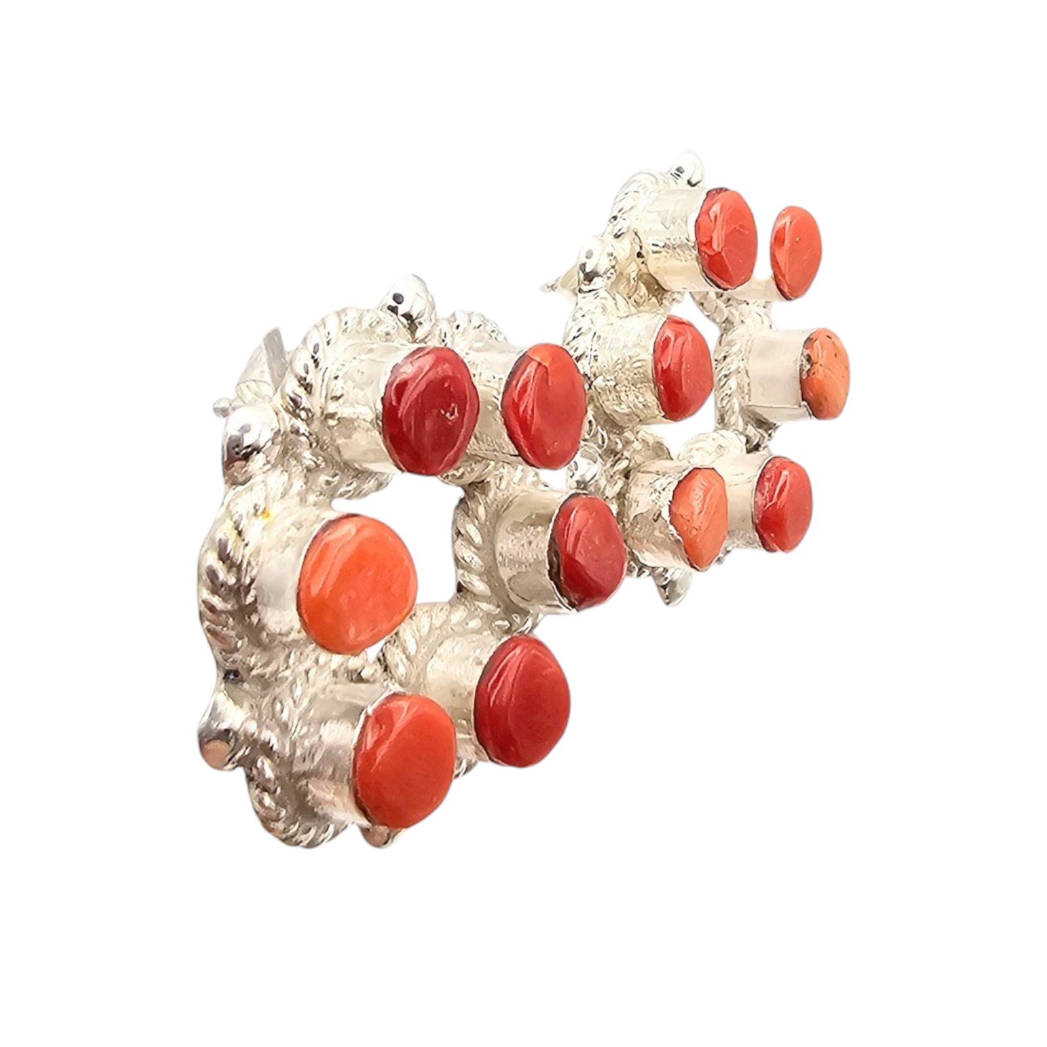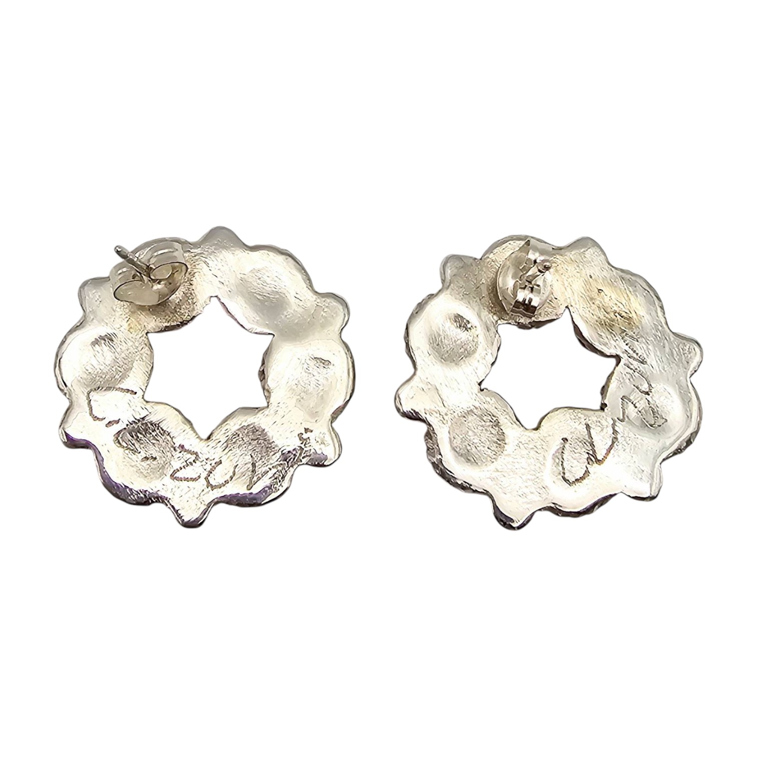 Handmade earrings by Janice Lalio, featuring sterling silver construction and set with red coral stones. These earrings are circular in design and signed on the back. They weigh approximately 8.6 grams. Comes with a label indicating an original price of $250.