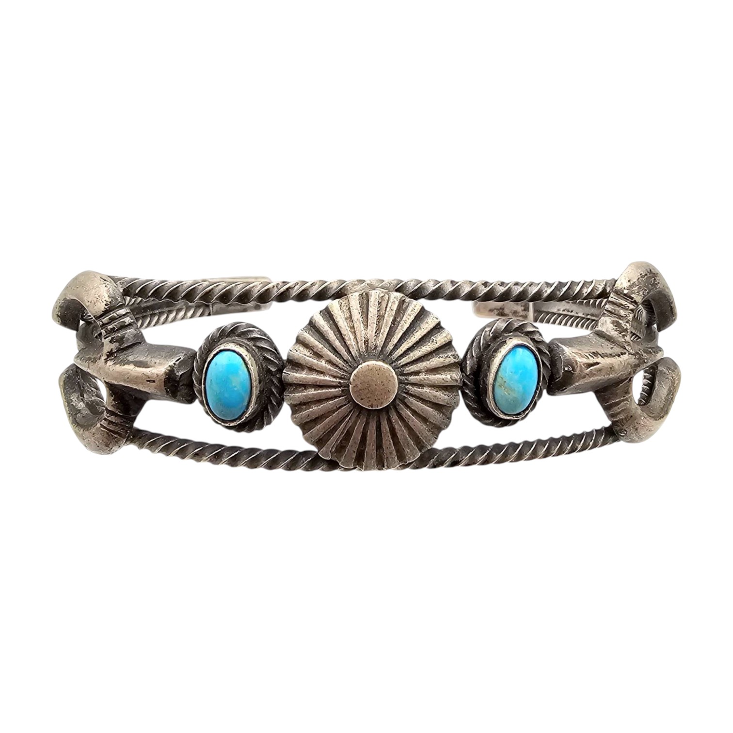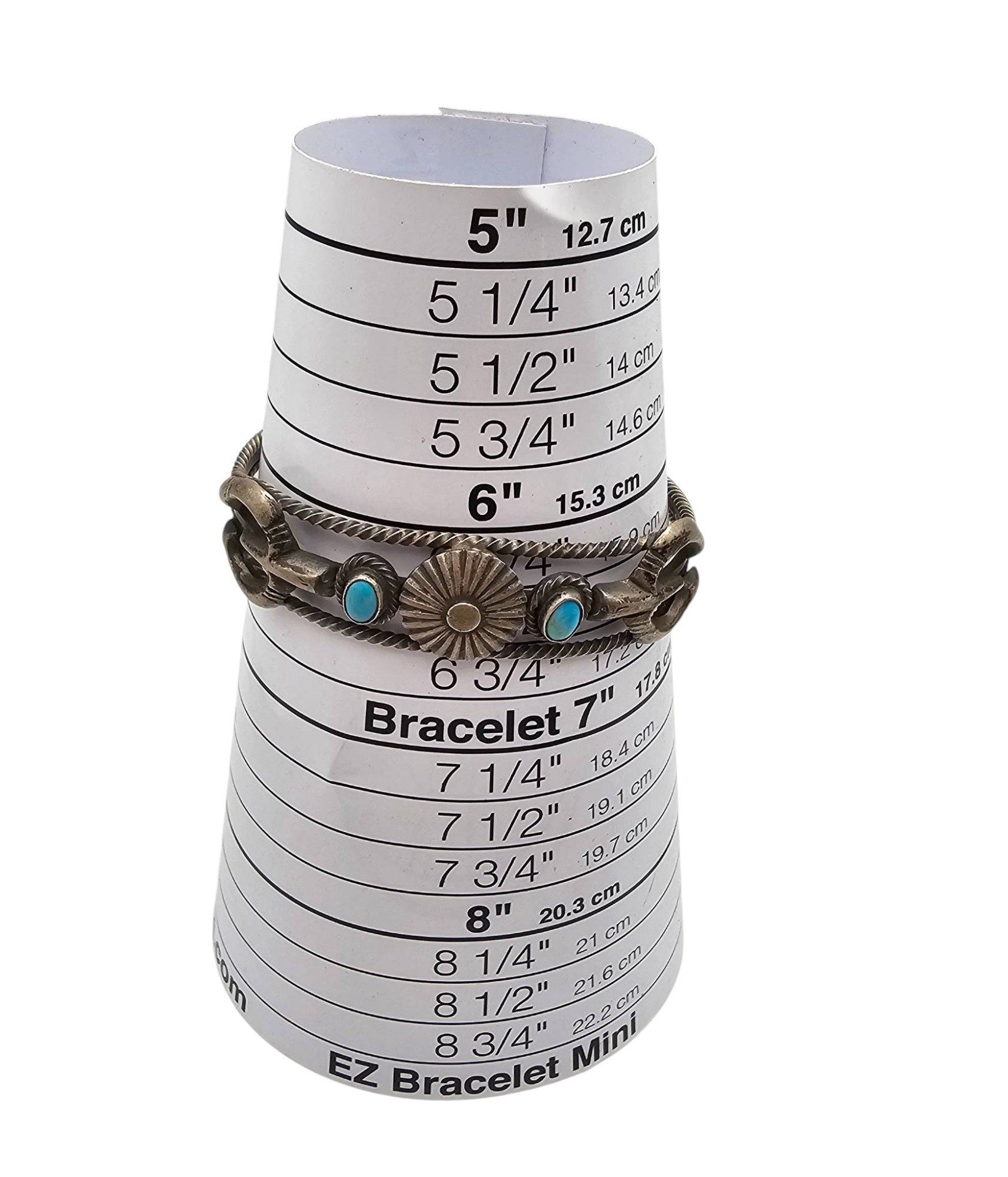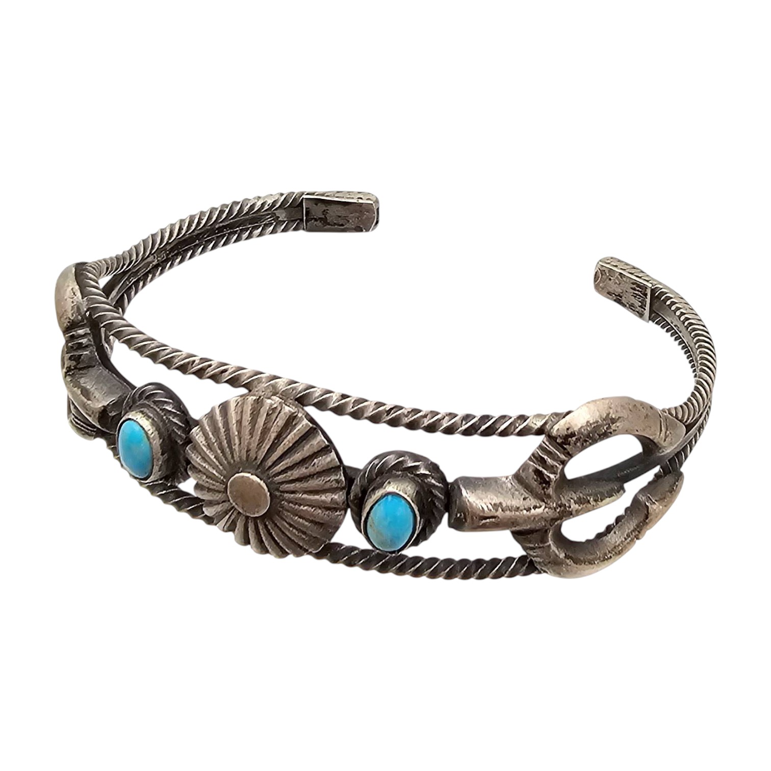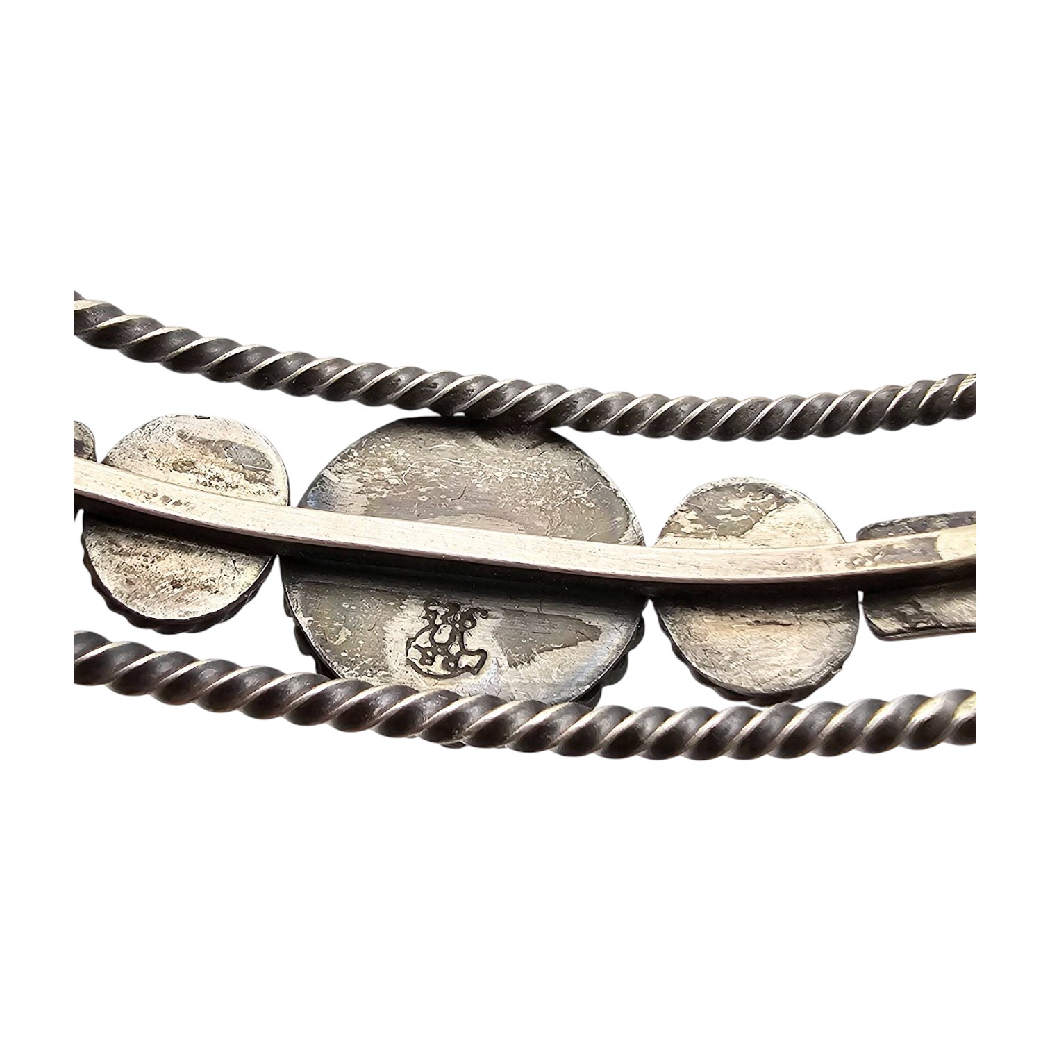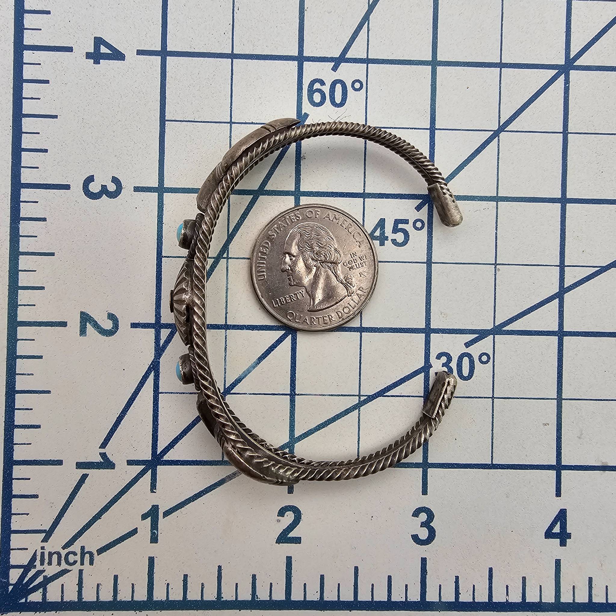 Handmade sterling silver cuff bracelet by Navajo artist Bobby Platero, featuring two turquoise stones and intricate silverwork. Weighs 20.9 grams and measures approximately 6 inches in interior circumference, including the gap. Hallmarked by the artist. Traditional Navajo design.
