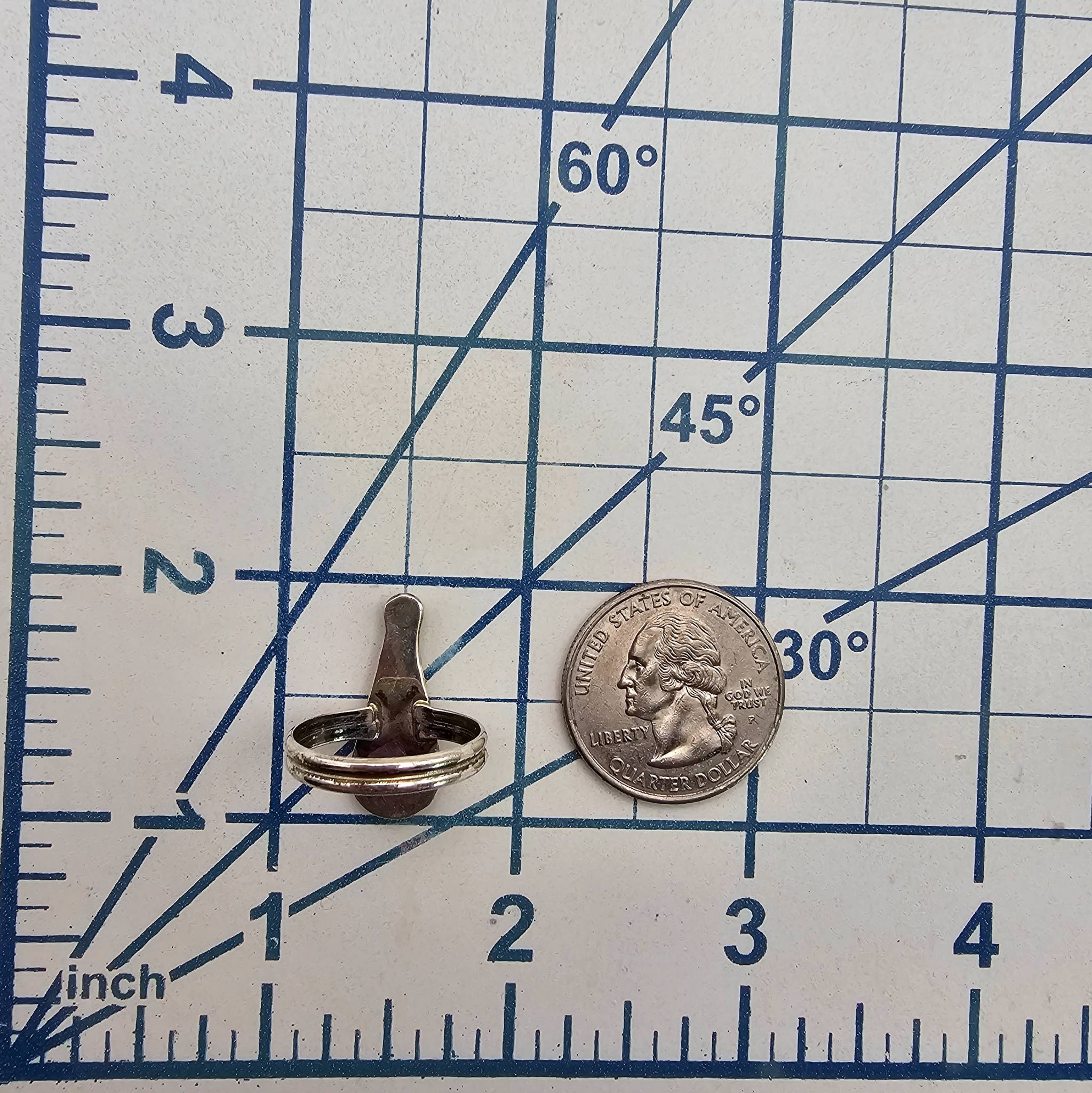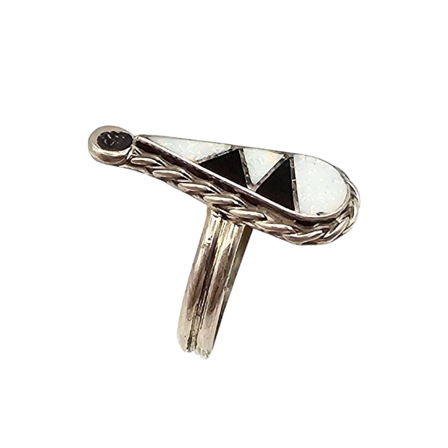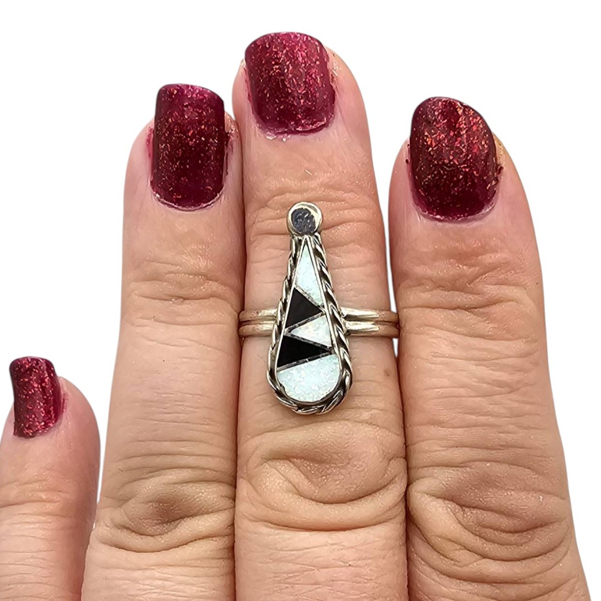 Handmade sterling silver ring by Swain Charlie, a Zuni artisan. Features an inlay of multiple colors including black onyx and opal, with a teardrop-shaped design and intricate borders. Marked as size 7 and weighs approximately 2.7 grams. Includes a polished finish and traditional craftsmanship.