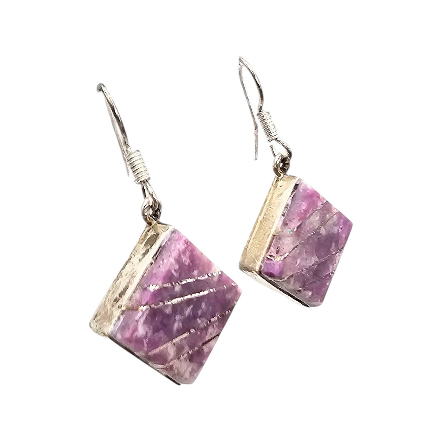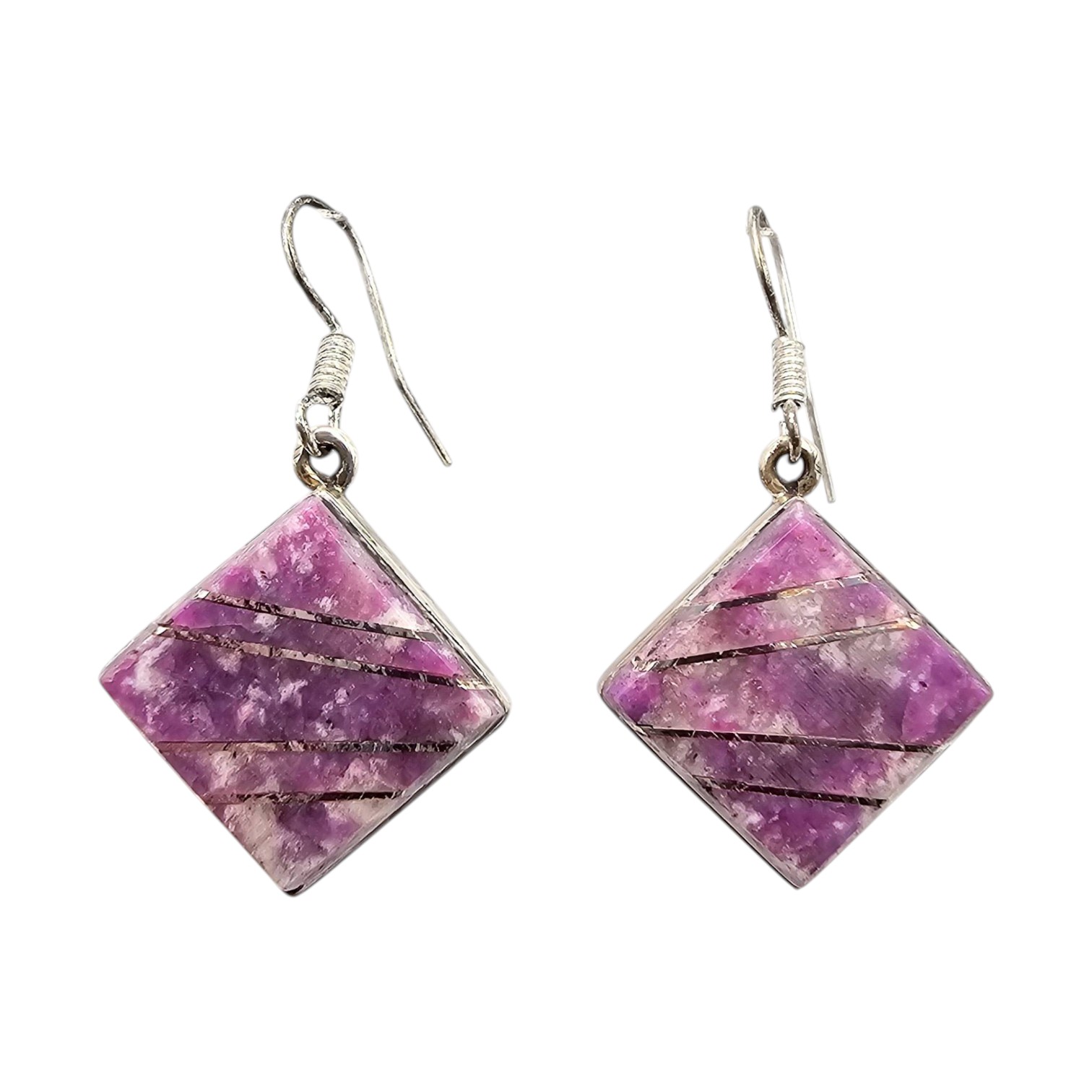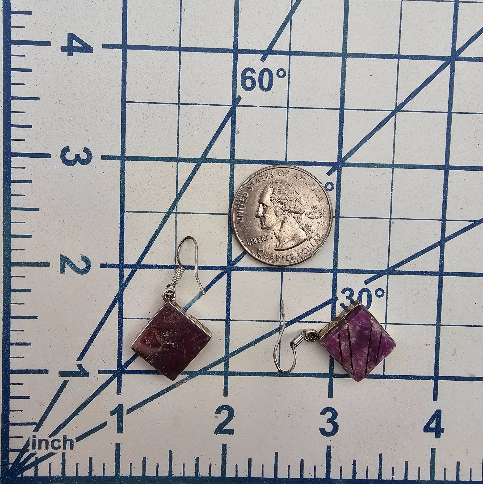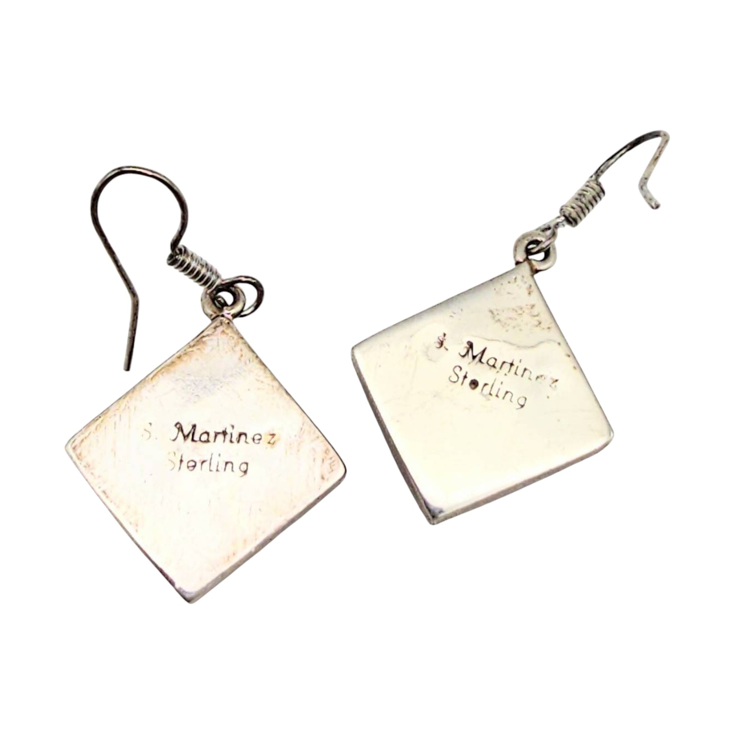Handmade earrings crafted by Navajo artisan Merle House. These sterling silver earrings feature square-shaped pelotilite gemstones with a striking purple hue and diagonal inlays. The reverse side is stamped with ‘A Martinez’ and ‘Sterling.’ Each earring measures approximately 1 inch square, and the total weight is 7.7 grams. A fine example of Navajo craftsmanship and design.