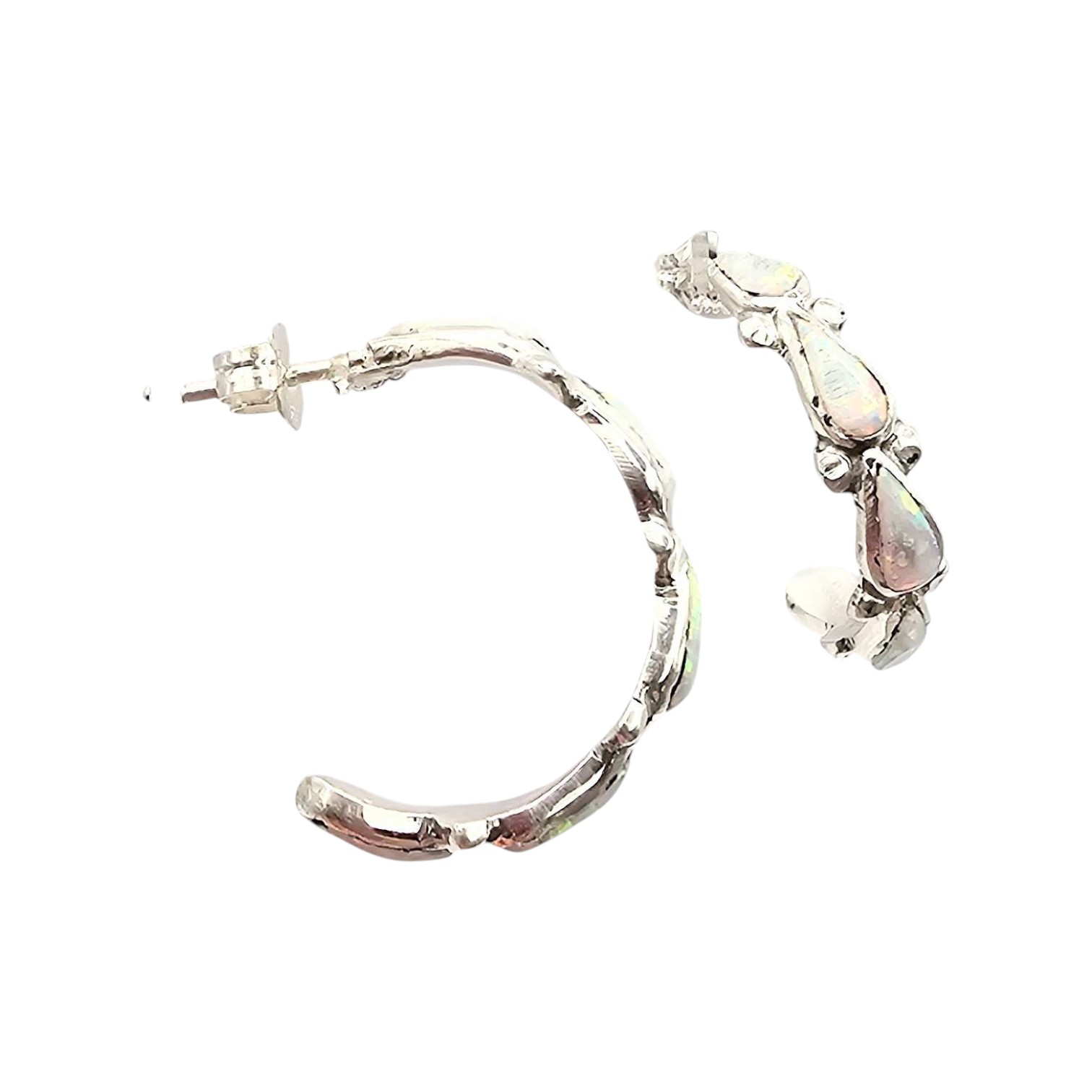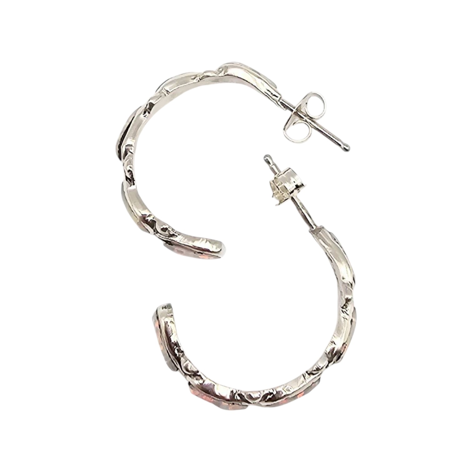 Bryce Vacit Zuni handmade sterling silver earrings featuring inlaid opal stones. These earrings are crafted with intricate detailing and measure approximately 1.5 inches in diameter. They weigh 2.6 grams as a pair and are secured with stud-back closures. Signed by the artisan, Bryce Vacit.