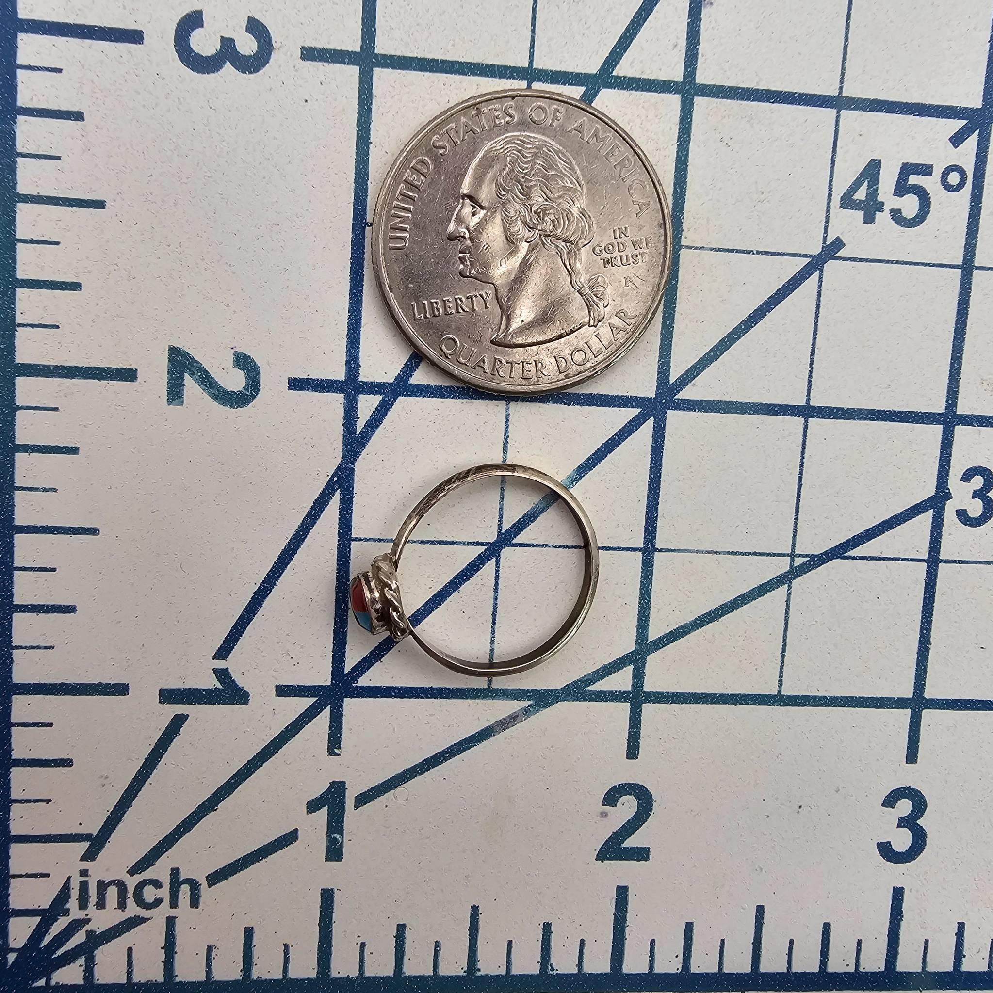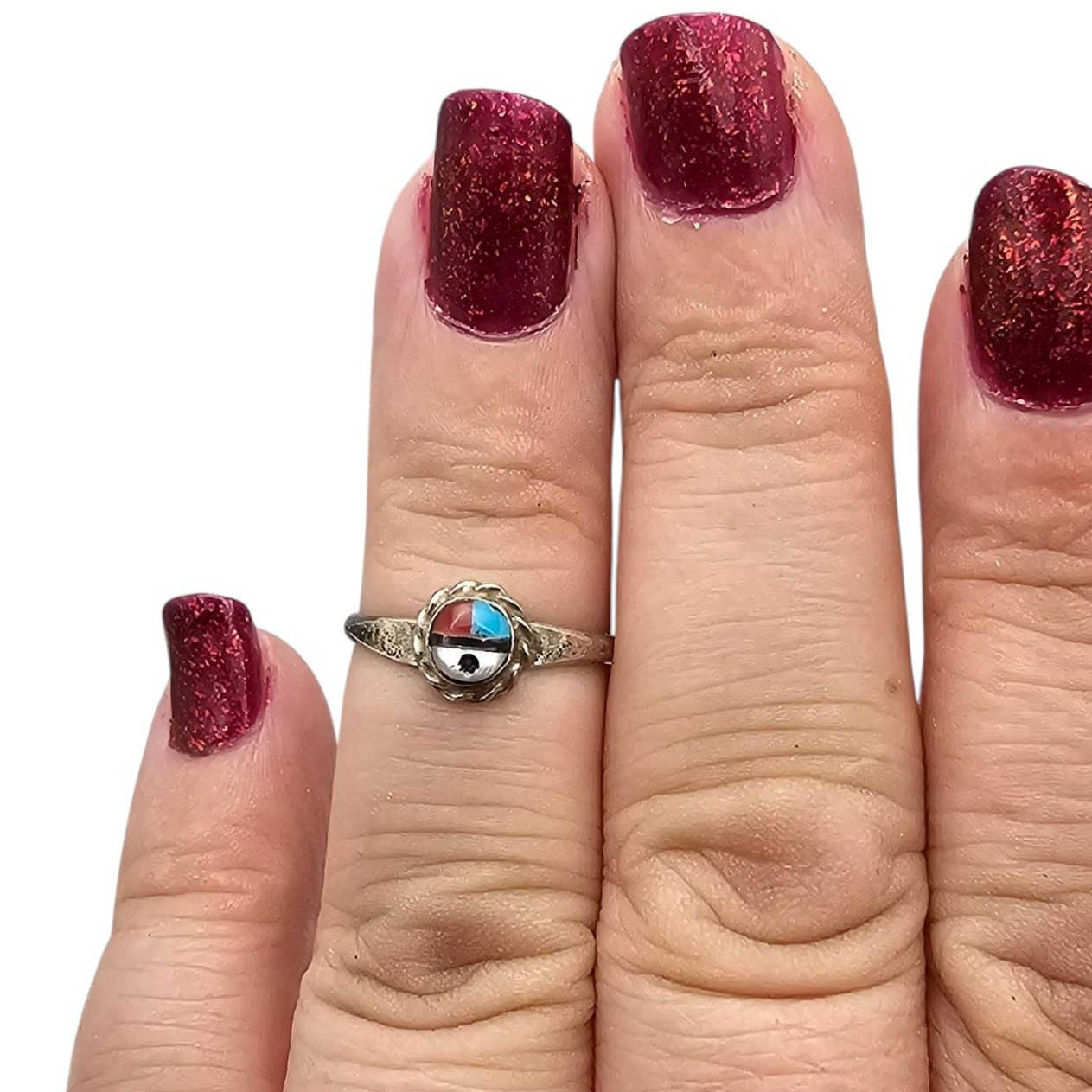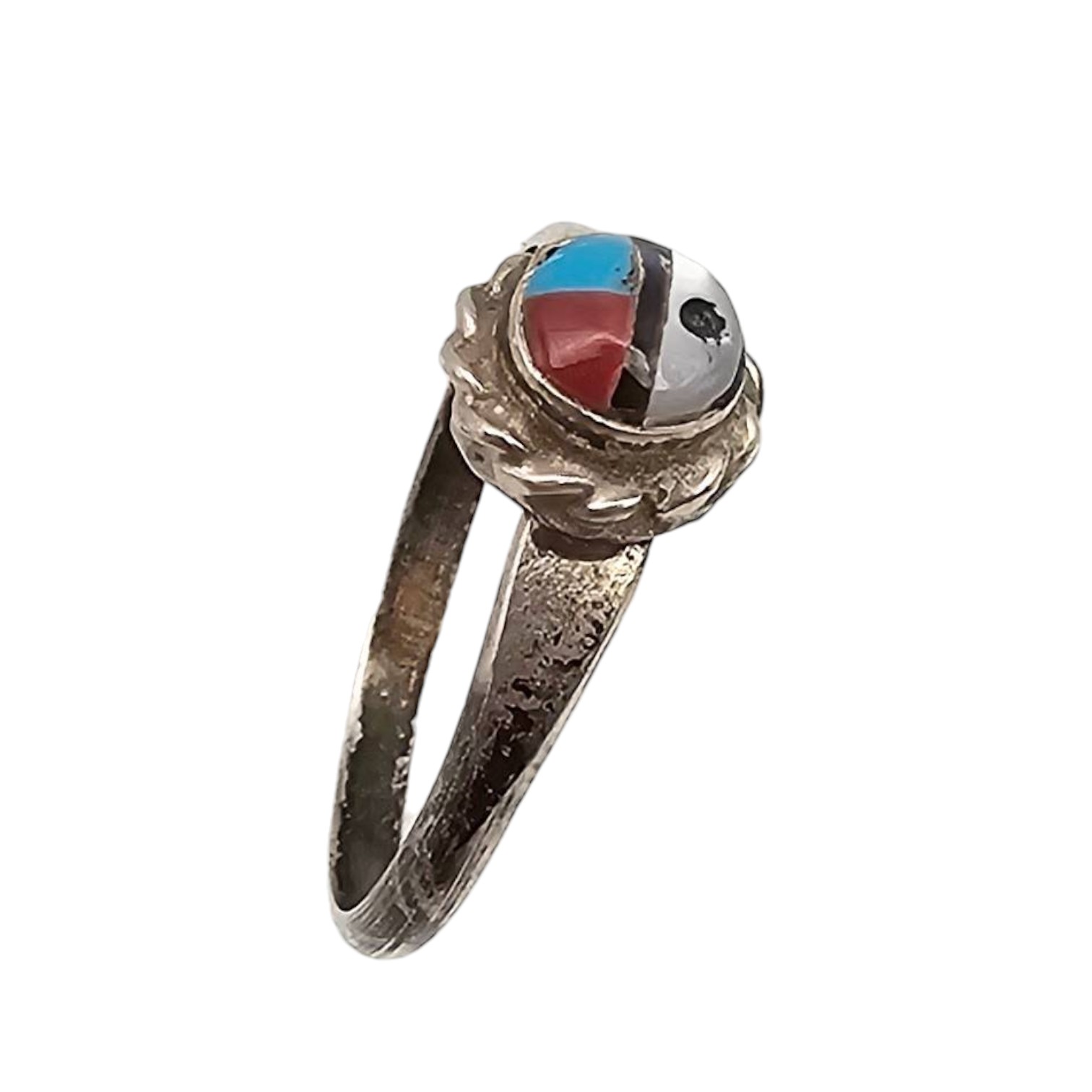 Sterling silver ring by artisan Emerson Vallo, representing Zuni craftsmanship. Features a handcrafted multicolor inlay design on the front with red, blue, and white accents. Ring size is 5, and the weight is 1.1 grams. The piece includes intricate detailing and is marked “Handmade.”