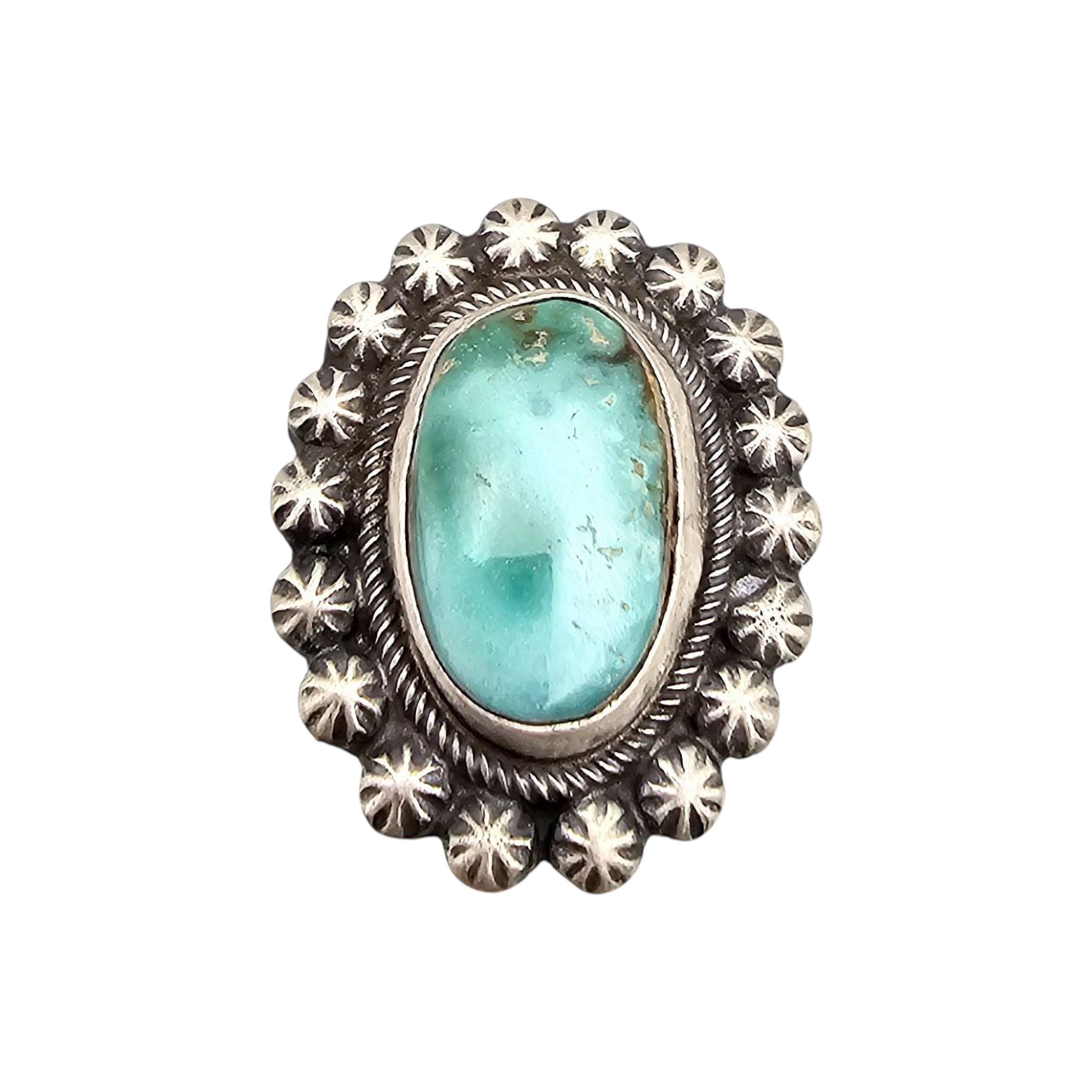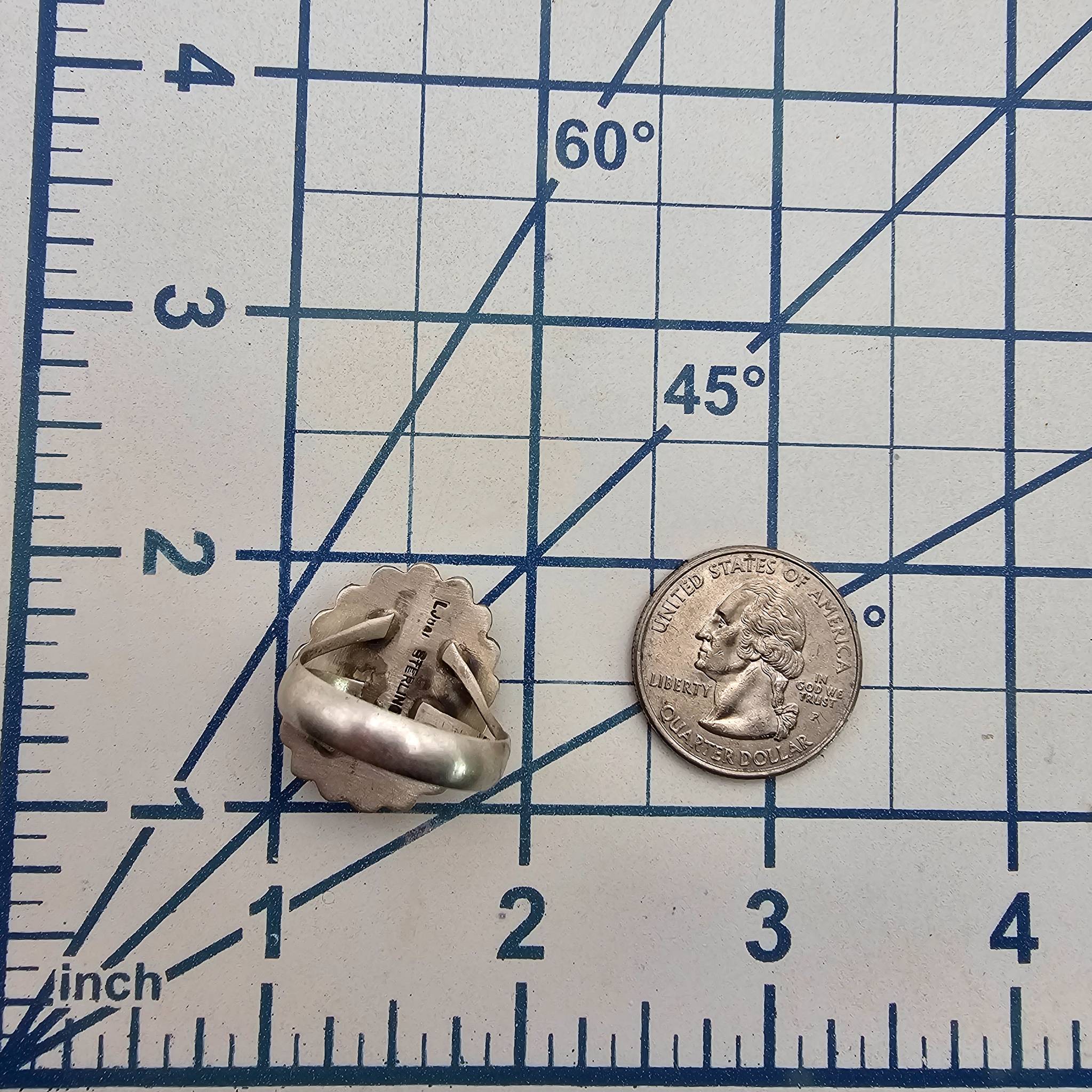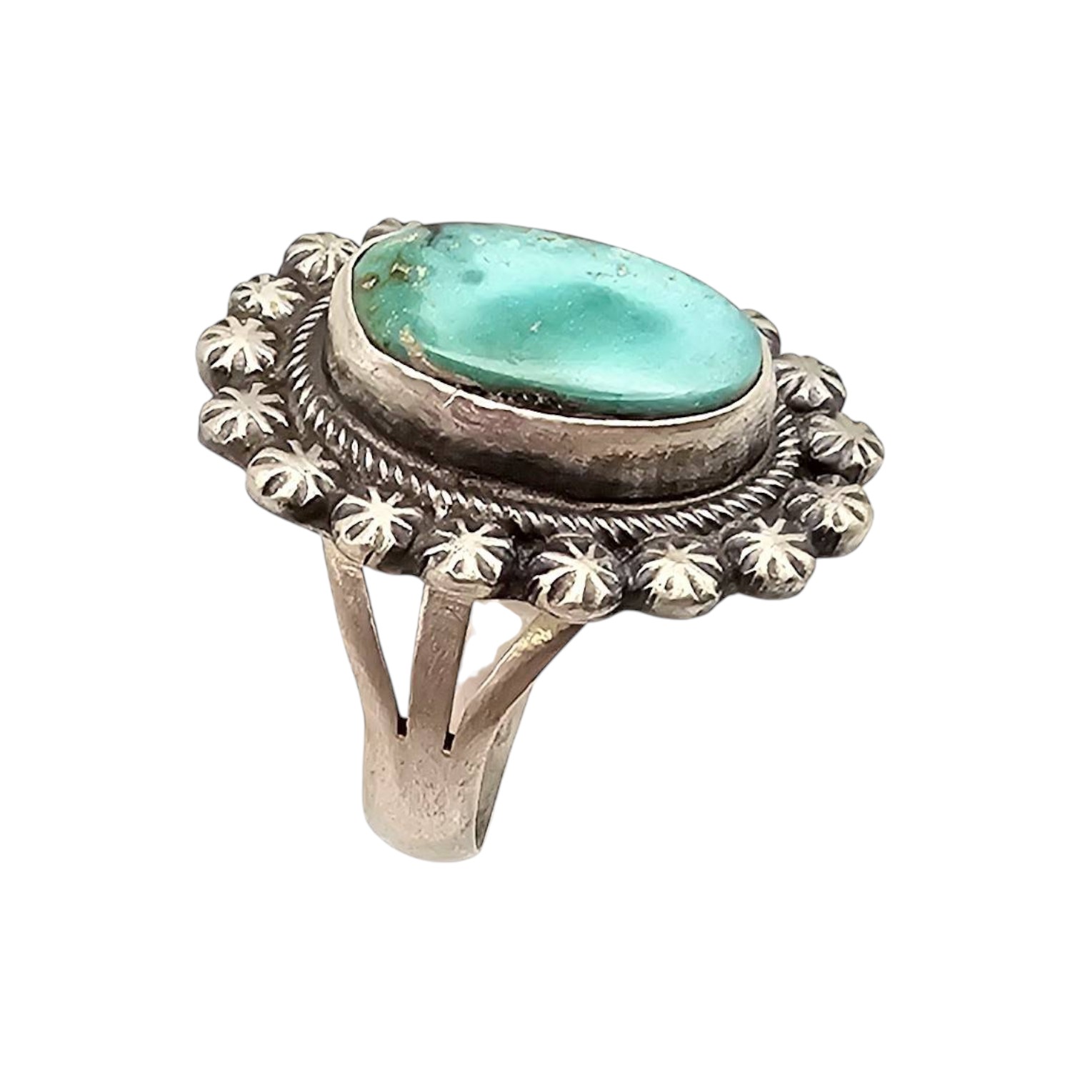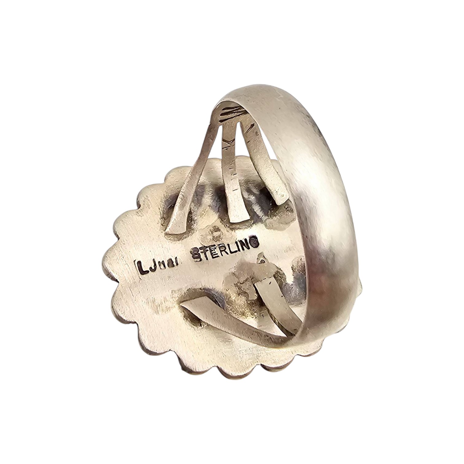Sterling silver handmade Navajo ring crafted by Lorenzo Juan, featuring a Royston turquoise stone set within a scalloped, stamped bezel. The ring is size 9 and weighs approximately 7.2 grams. The bottom of the ring band is stamped ‘L Juan STERLING.’ Ideal for collectors of Native American jewelry or individuals drawn to artisanal craftsmanship.