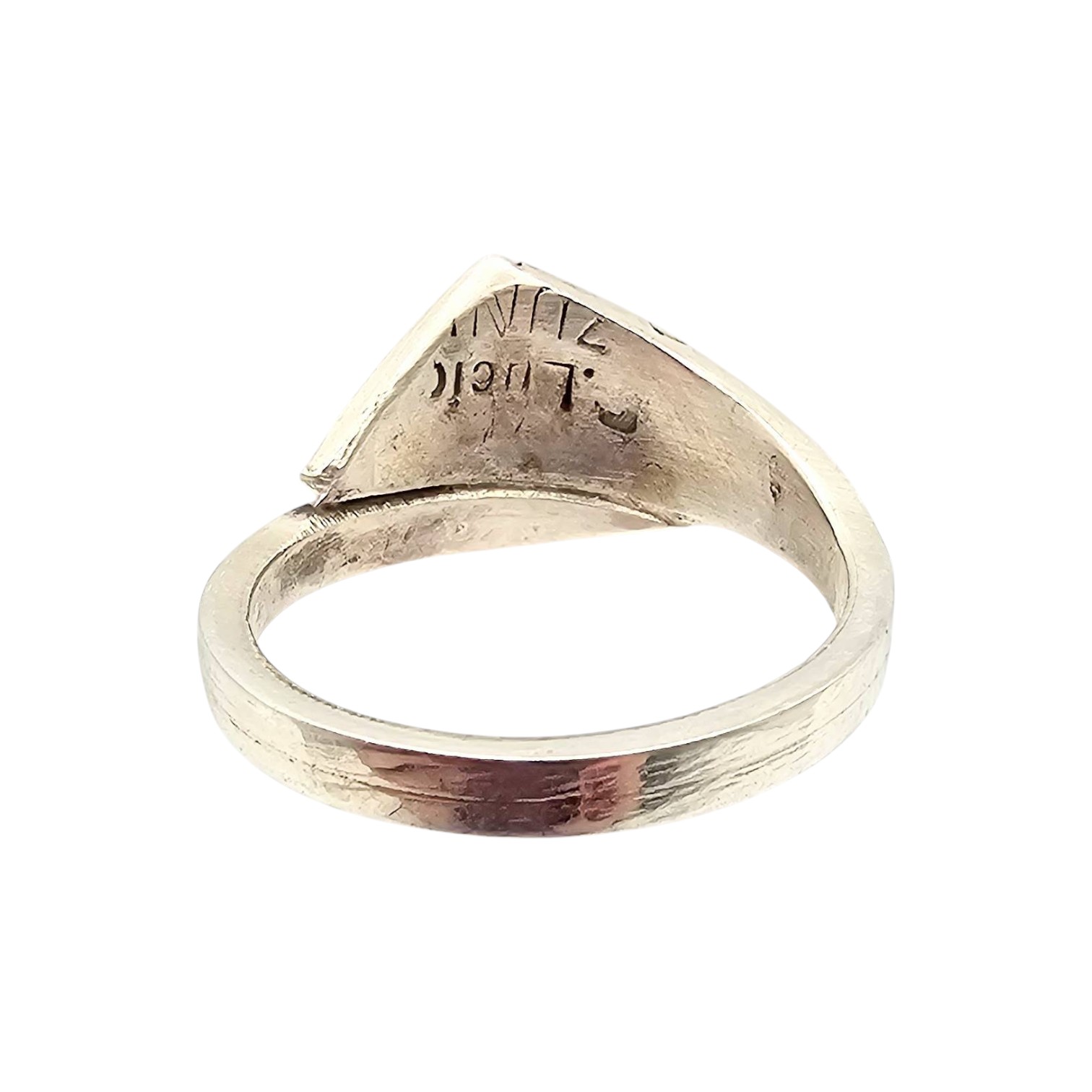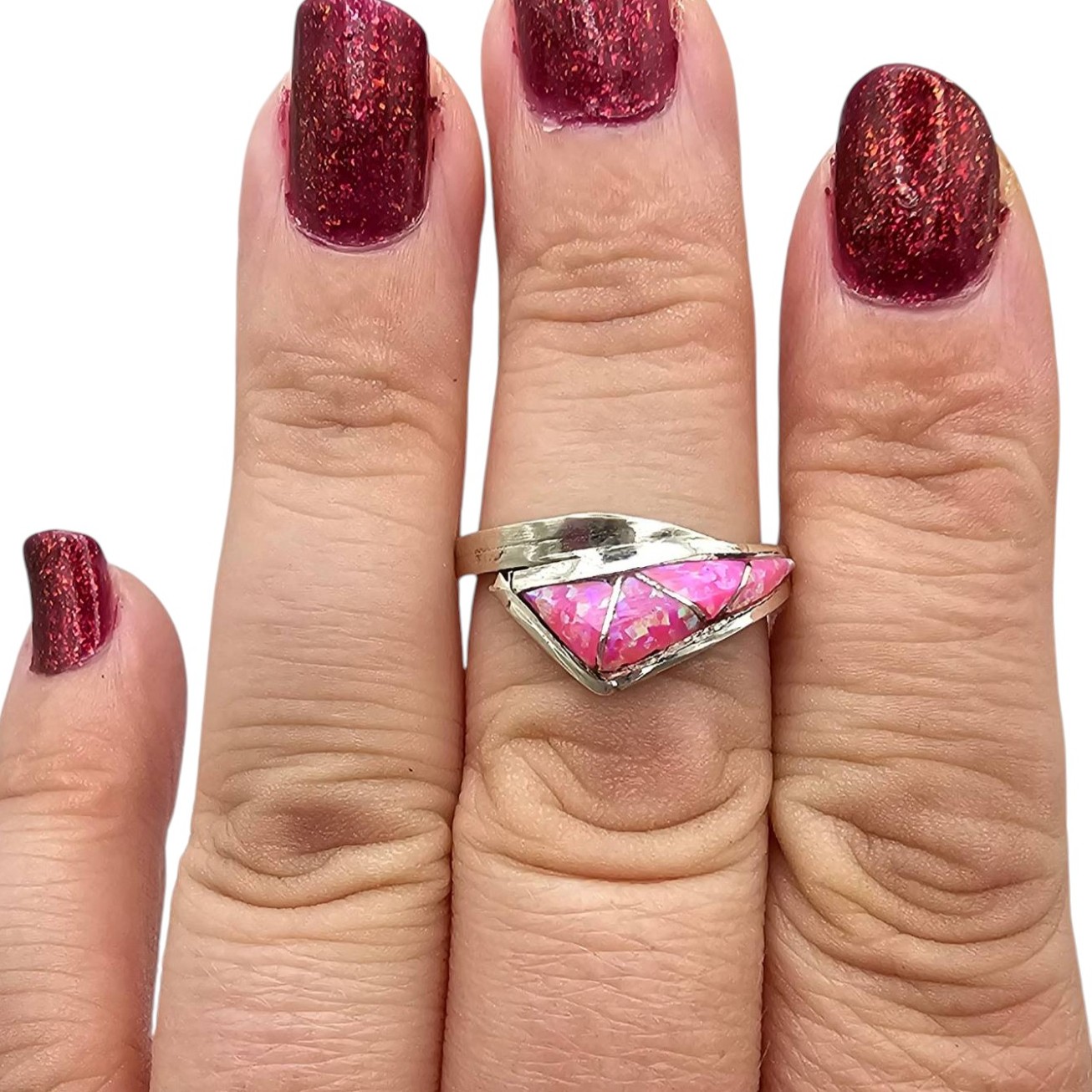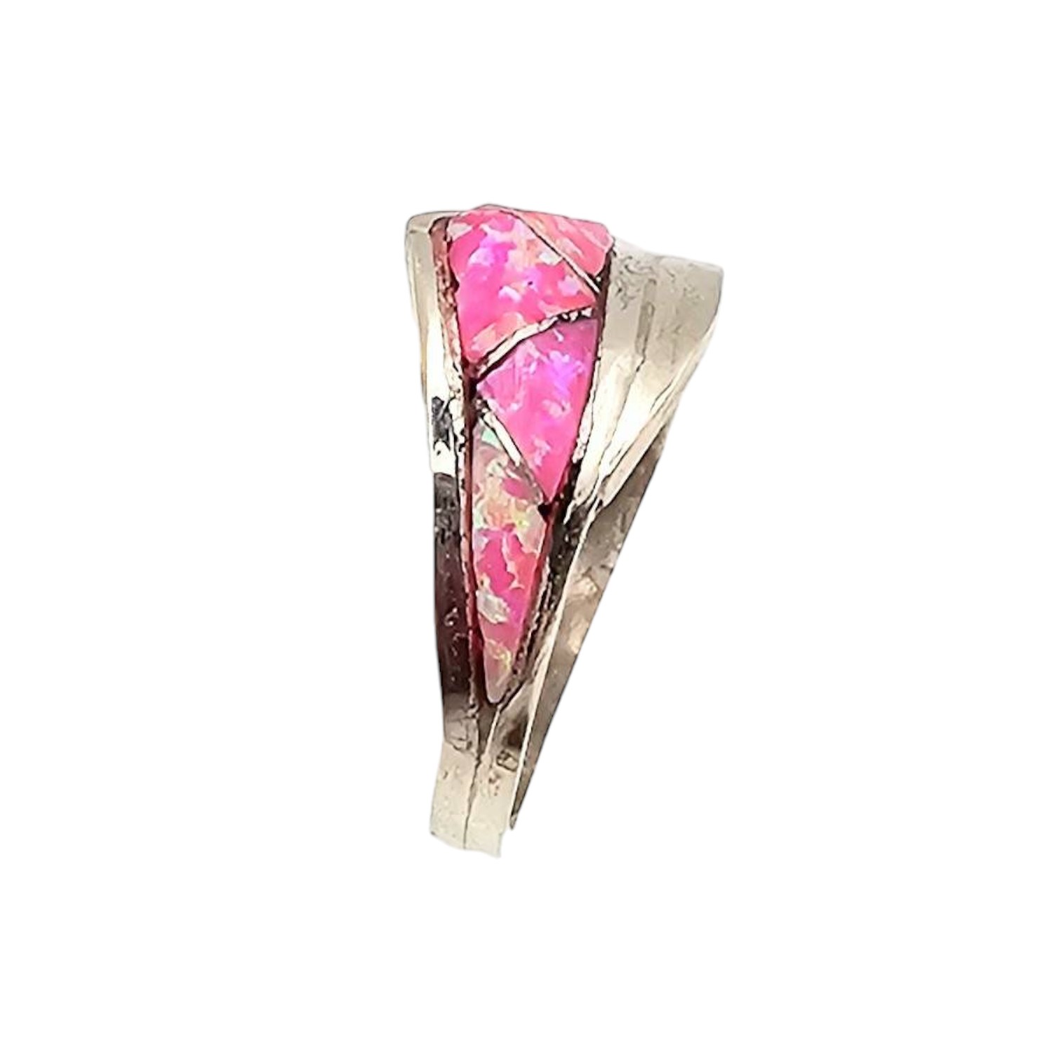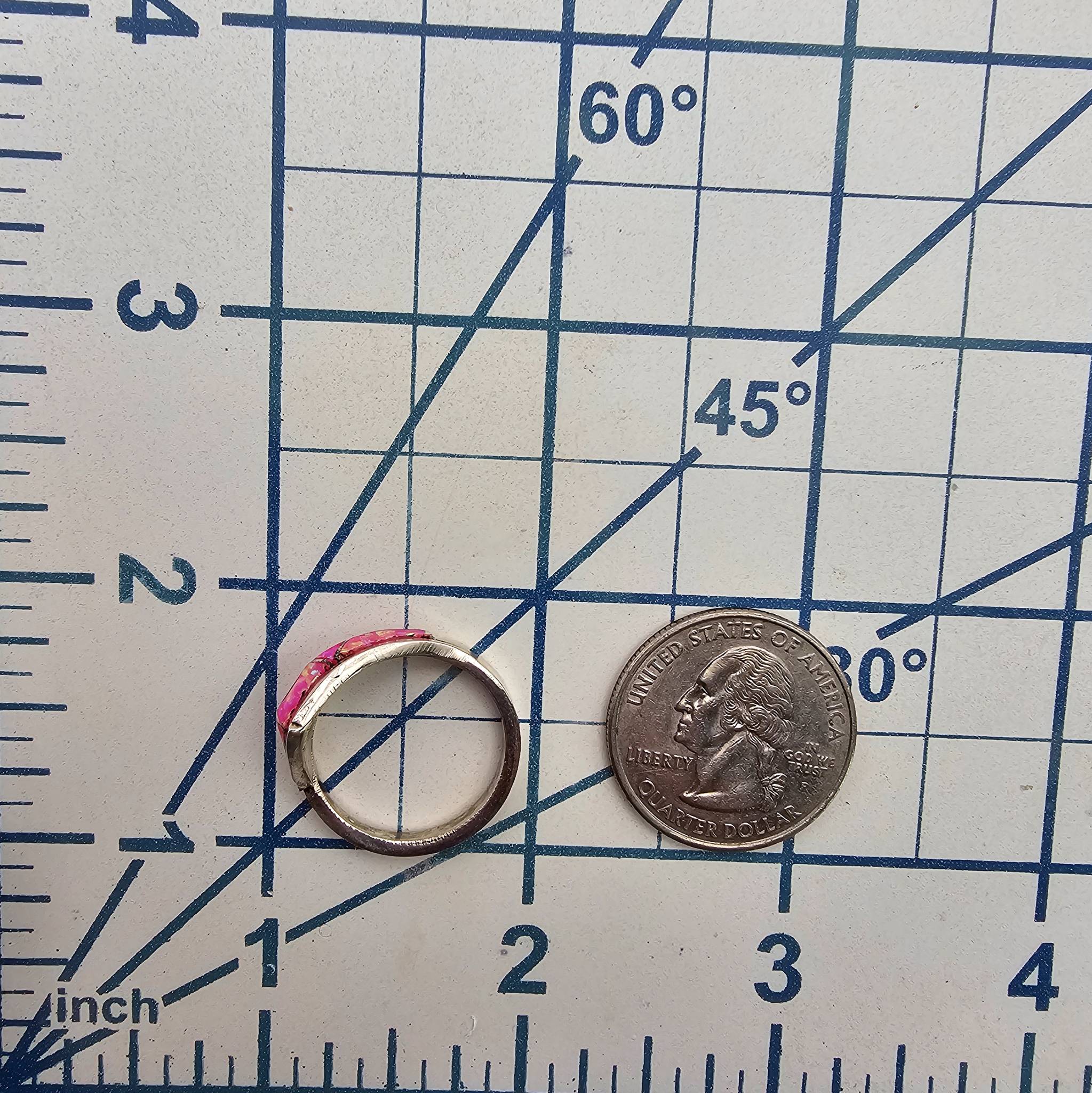 Phyllis Beyuka Zuni handmade sterling silver ring featuring an inlay opal design in pink tones. Signed by the artist on the inner band. The ring size is 7.5, and it weighs 3.4 grams. It showcases exquisite craftsmanship and detailed inlay work, characteristic of traditional Zuni jewelry.