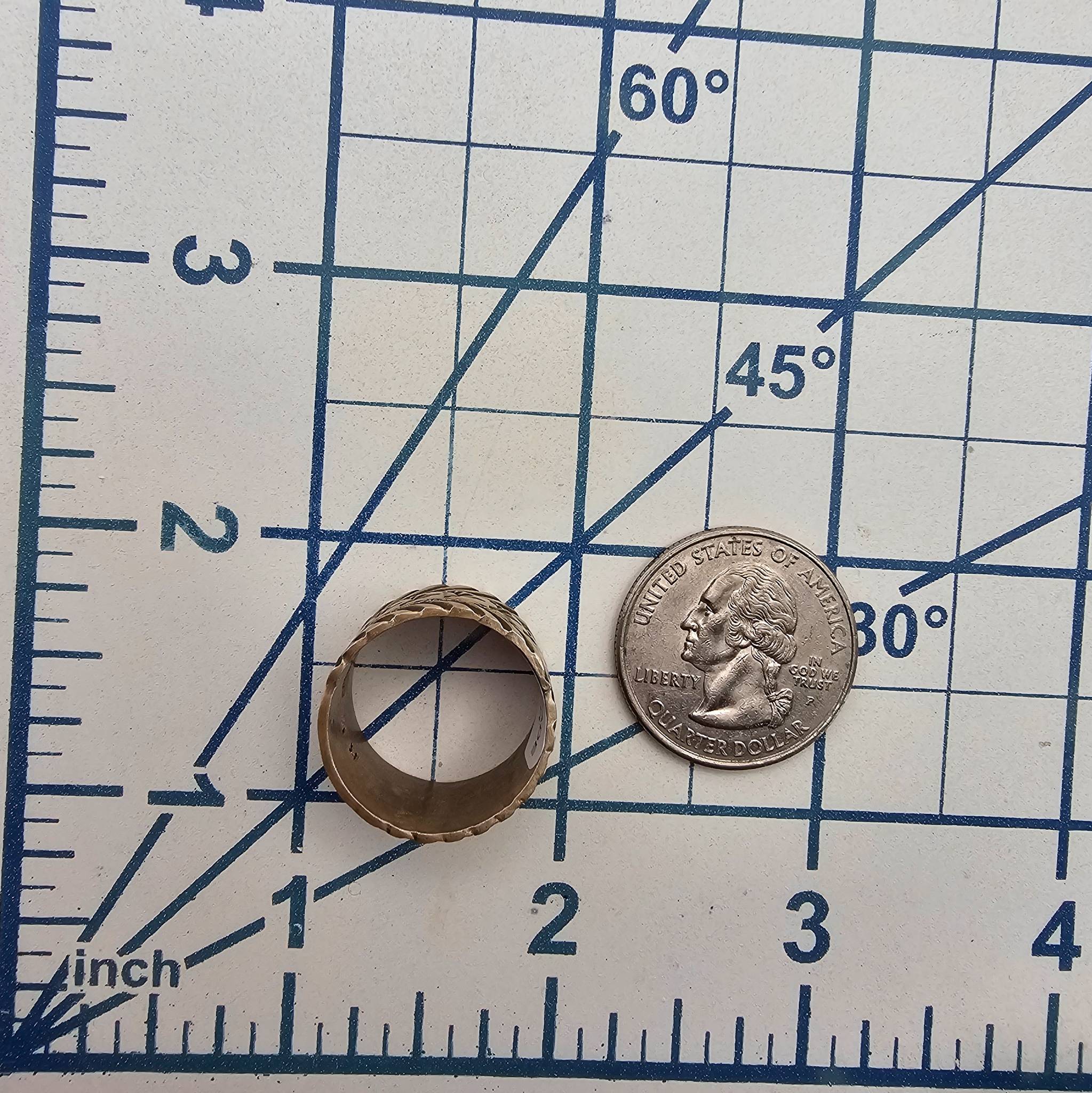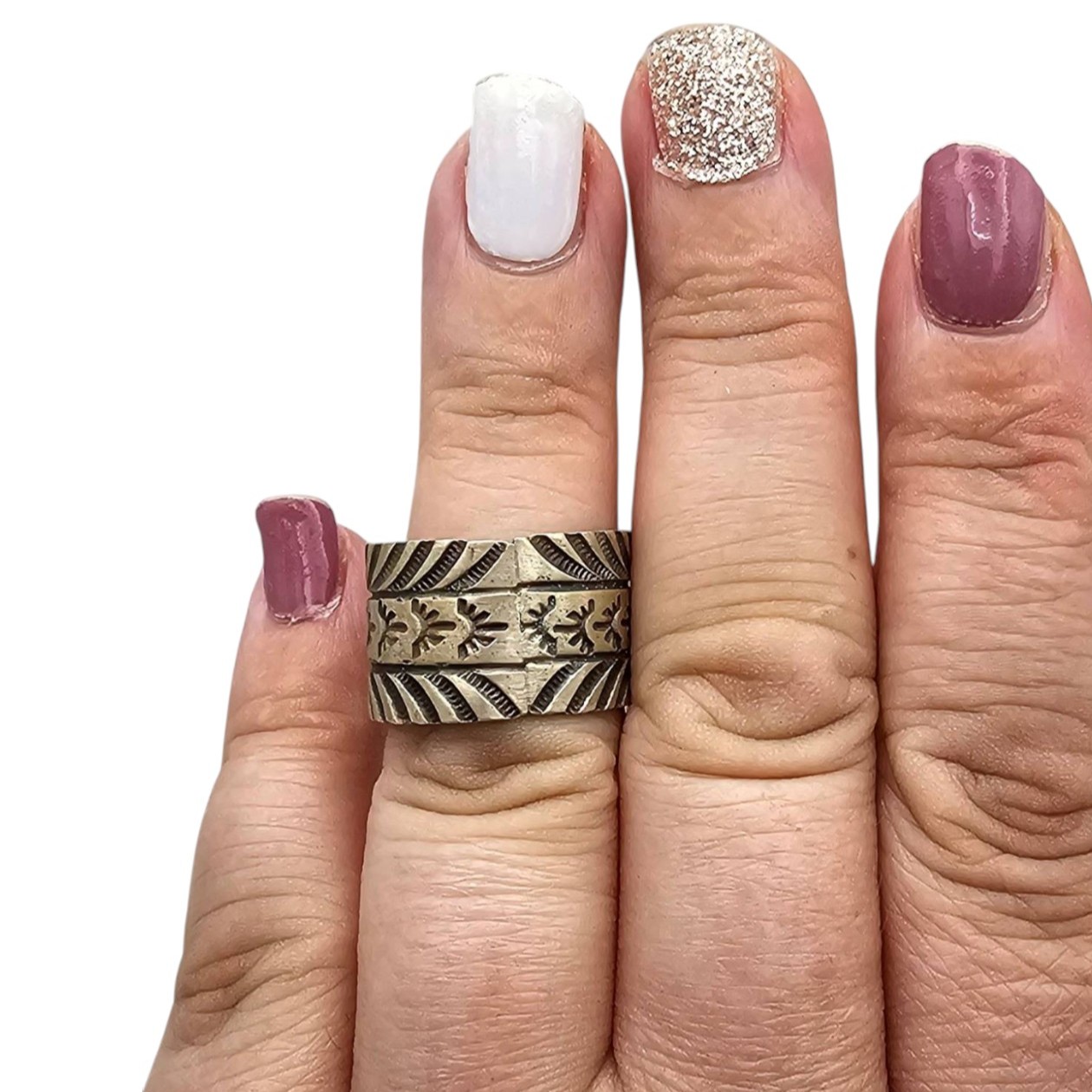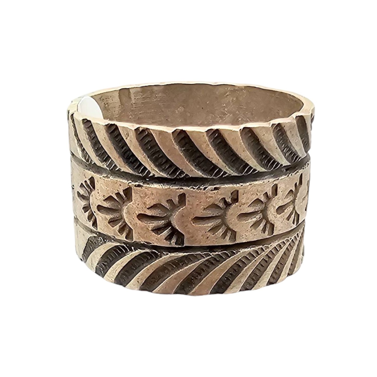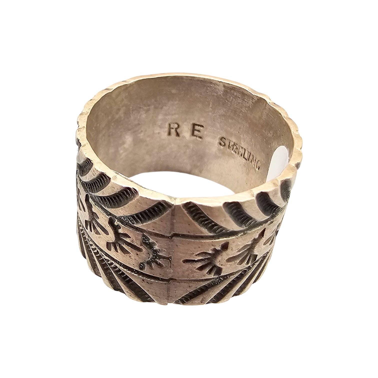 Sterling silver ring by Rick Enriquez, a Navajo artisan. Features hand-engraved patterns with textured detailing. Inner band is stamped with “RE Sterling.” Ring size is 8, and the weight is approximately 6.9 grams. Suitable for collectors of Native American handmade jewelry.