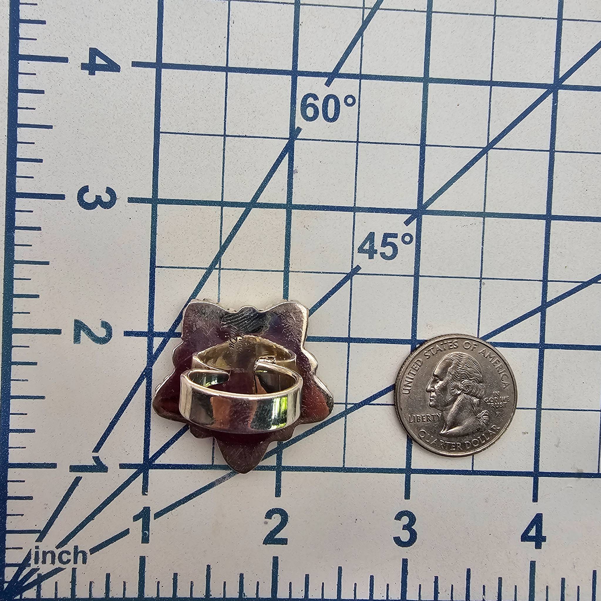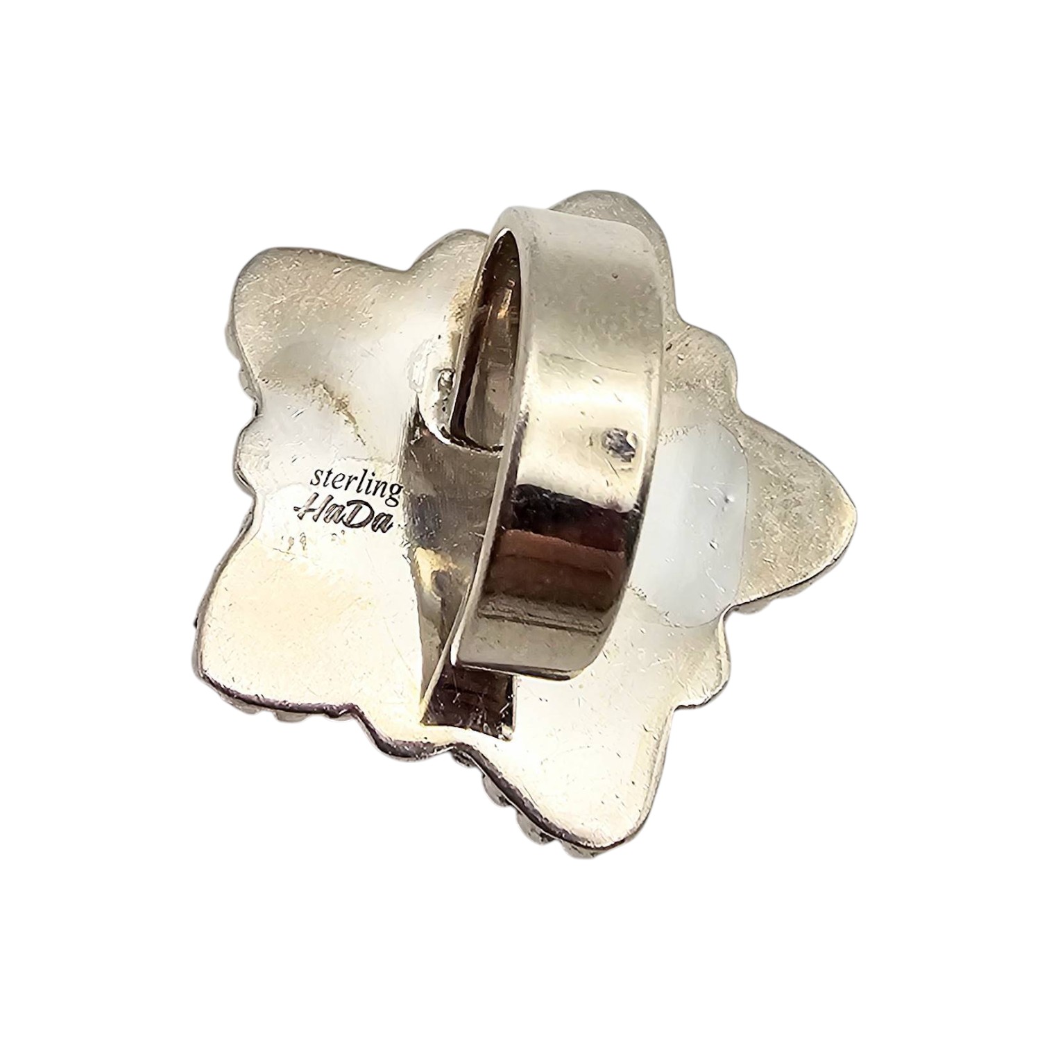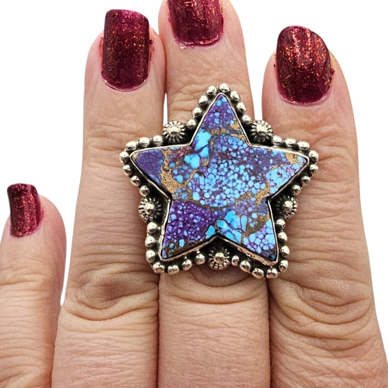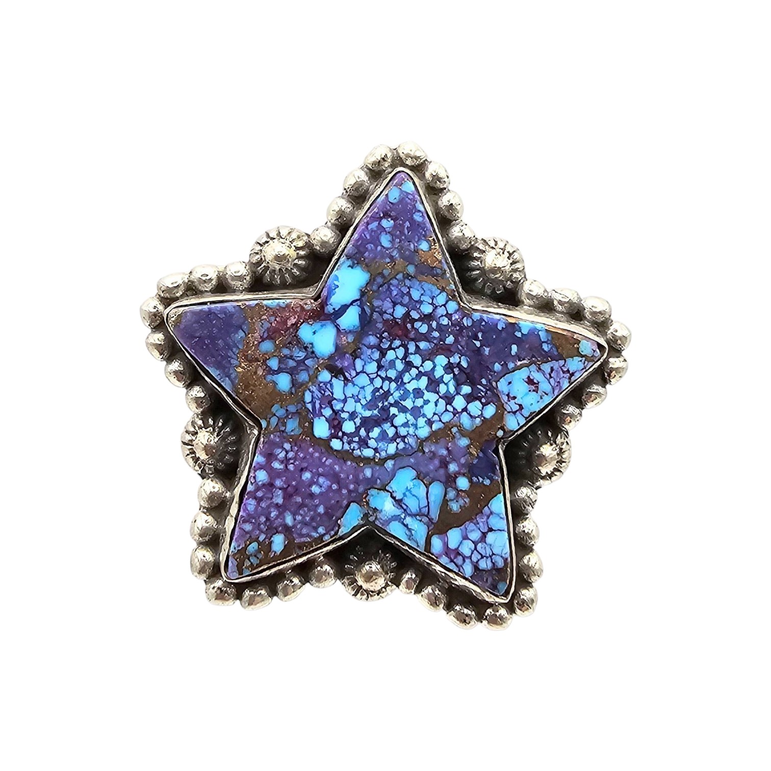 Sterling silver adjustable ring from the Hada Collection featuring a star-shaped Purple Mojave stone centerpiece. Weighs approximately 16.1 grams. Decorative bead details around the star. Stamped ‘sterling’ and ‘Hada’ on the underside. Adjustable band for versatile sizing.