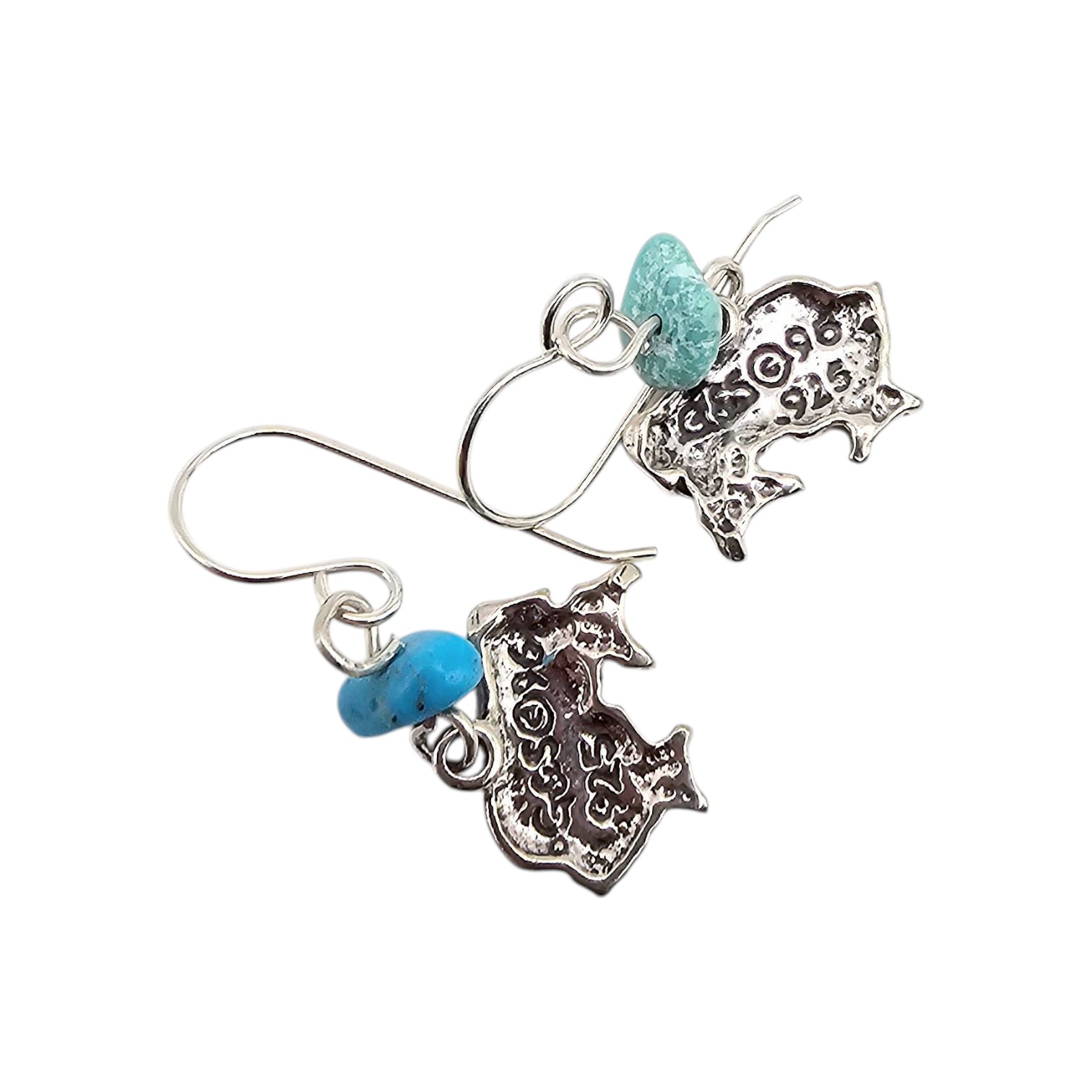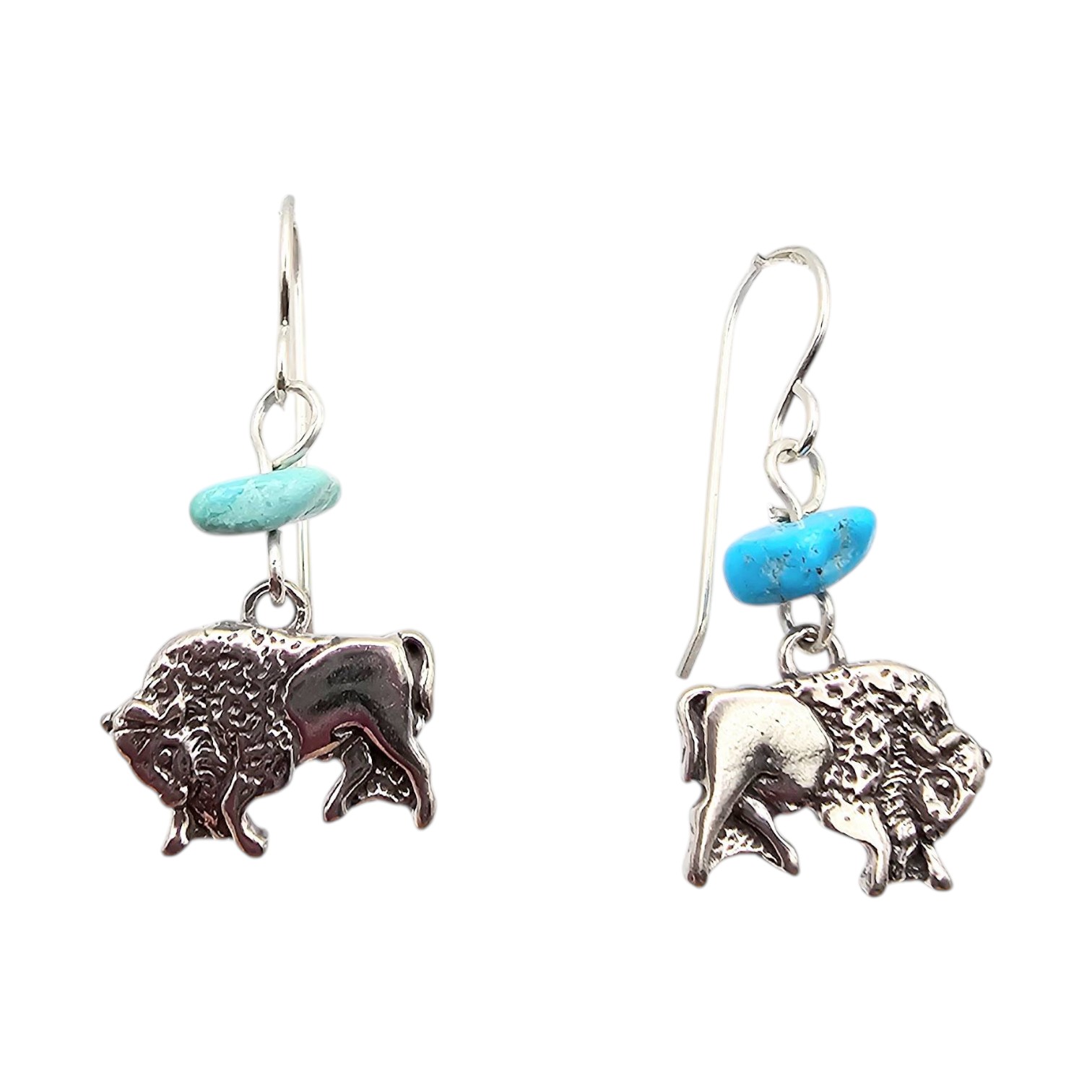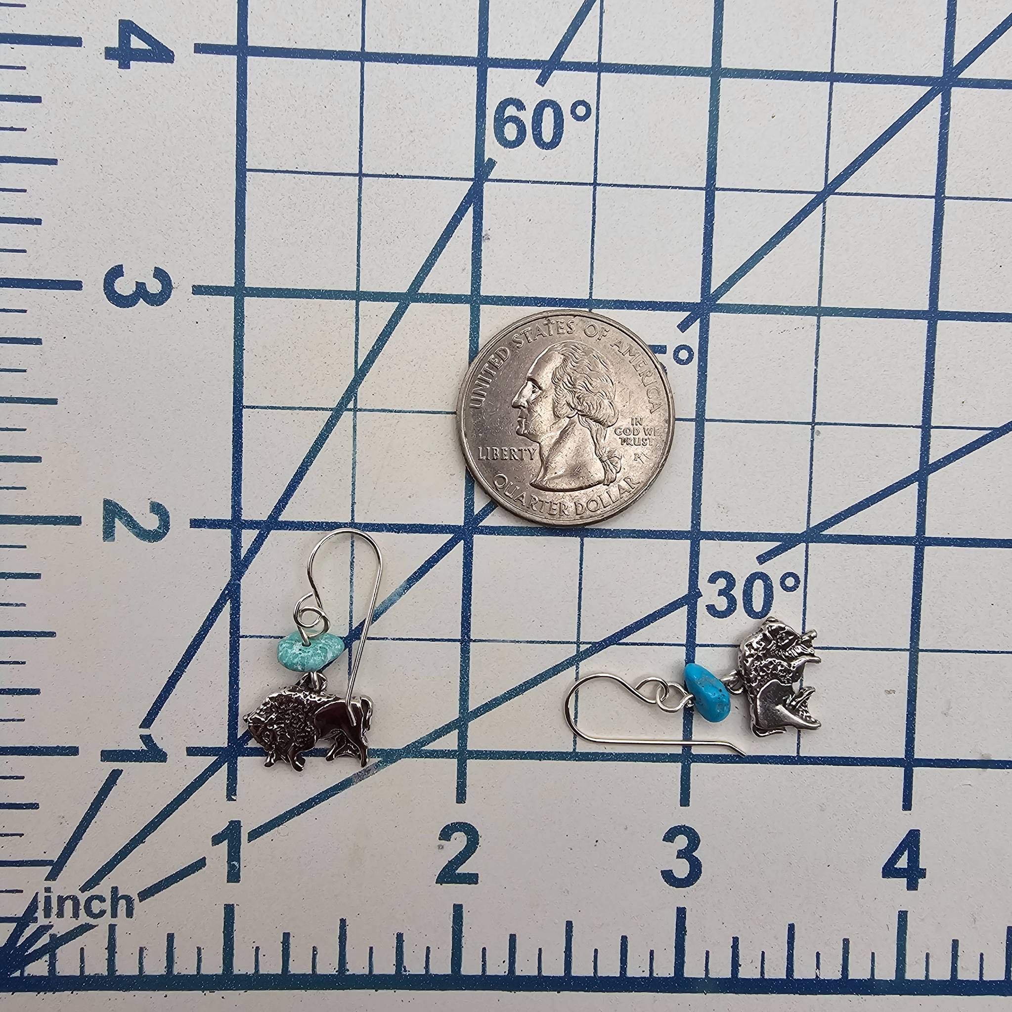 Sterling silver buffalo-shaped earrings featuring Kingman turquoise beads. These earrings have a combined weight of 2.6 grams as displayed on a scale. Each earring is designed with a hook-style back for easy wear and a detailed buffalo shape accented by turquoise for a unique design. The total weight and design details suggest a handcrafted or artisanal touch.