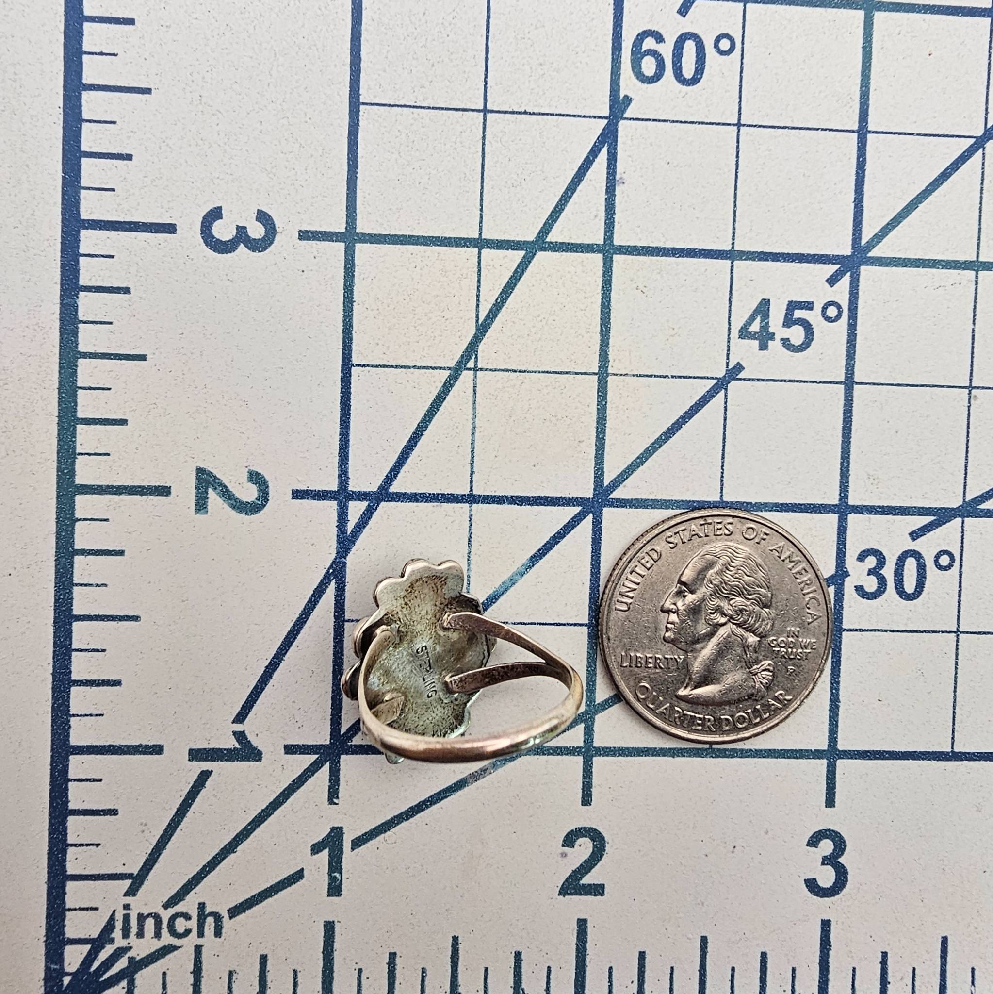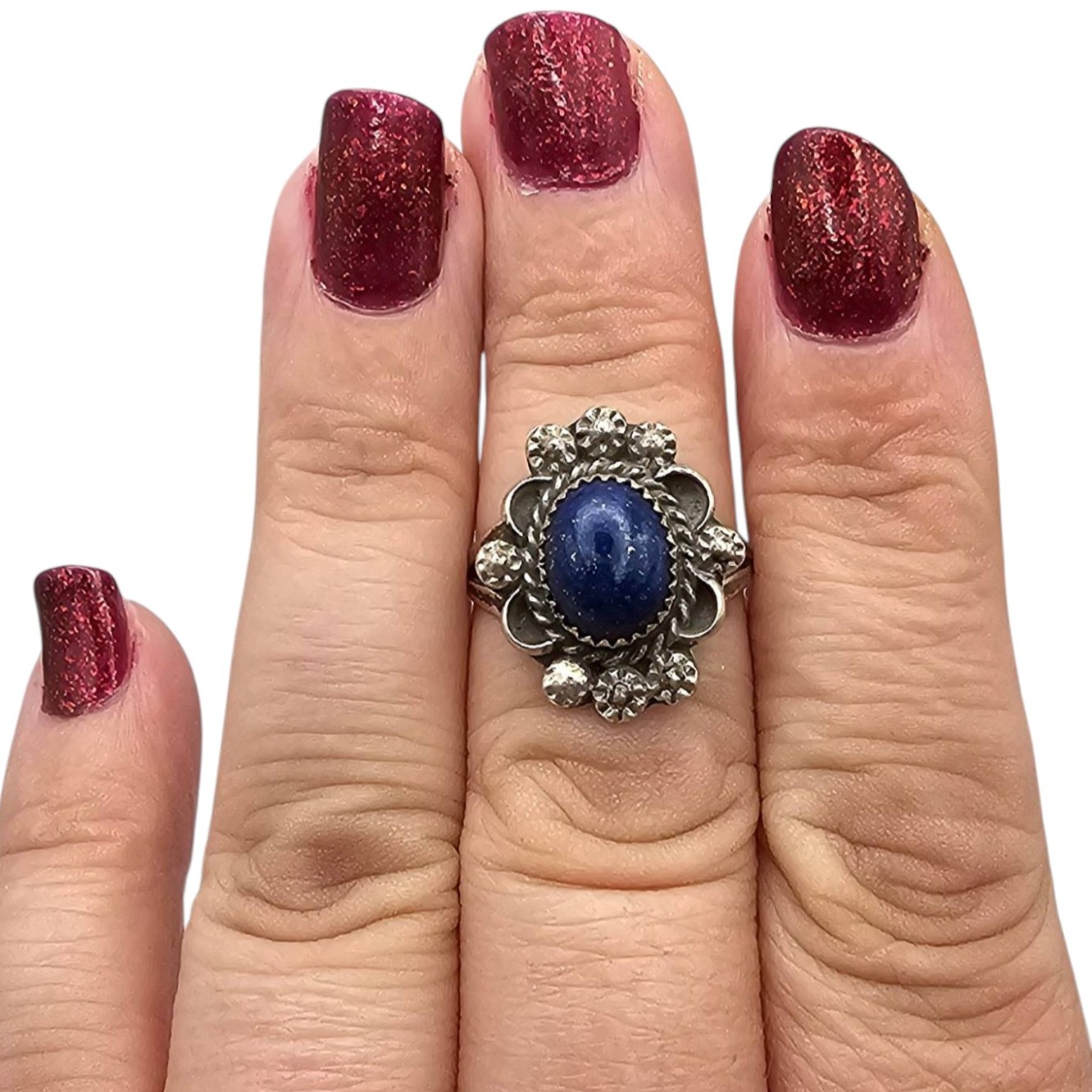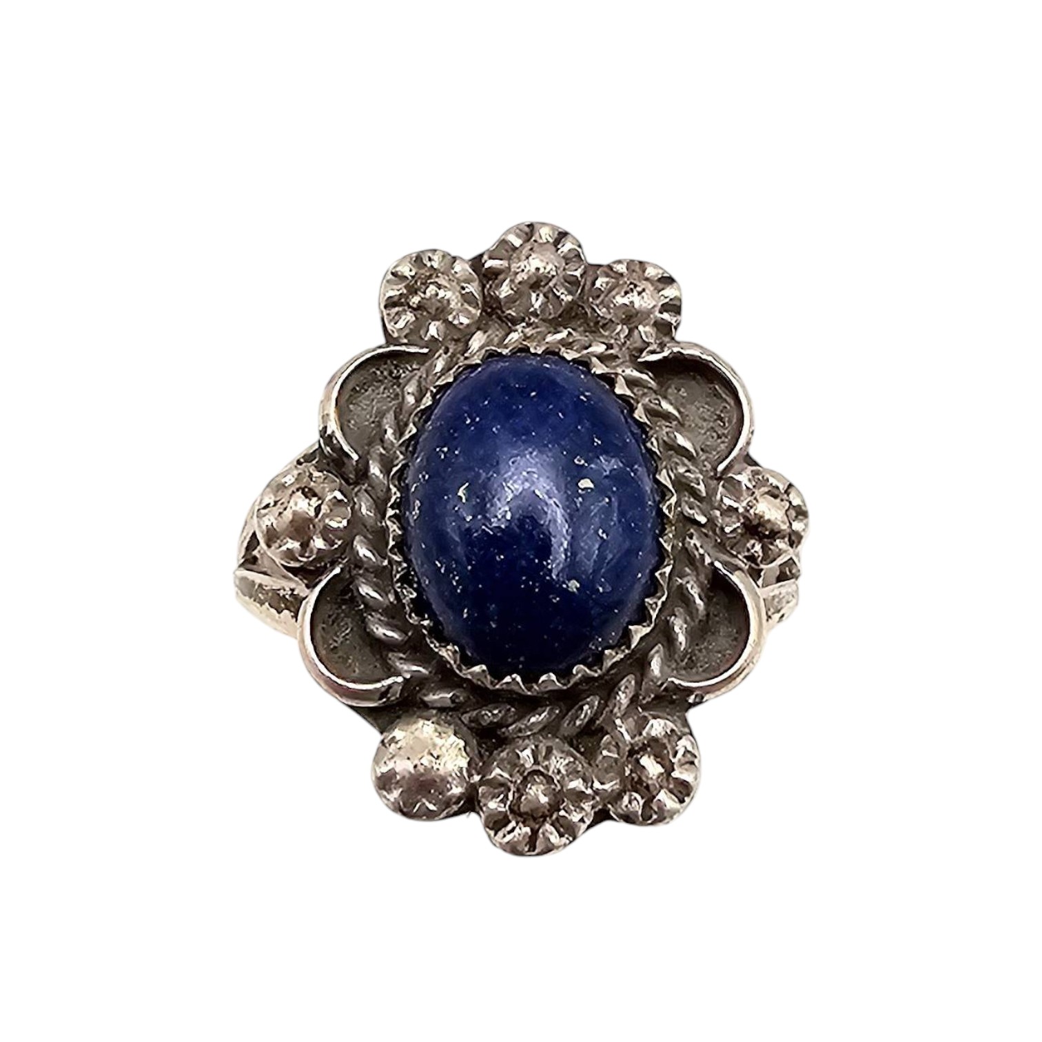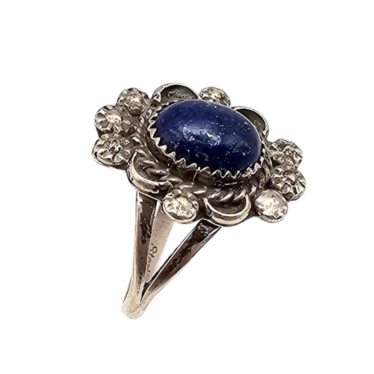 Sterling silver ring handmade by Navajo artisan Freda Martinez, featuring a lapis lazuli stone in a detailed floral design. The ring is sized 7.5 and weighs approximately 3.2 grams. The lapis stone is bezel-set, with fine silverwork surrounding it.