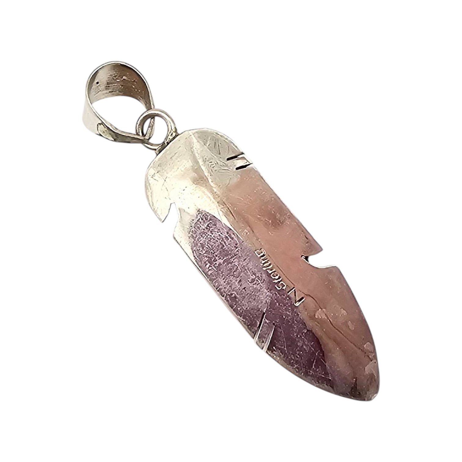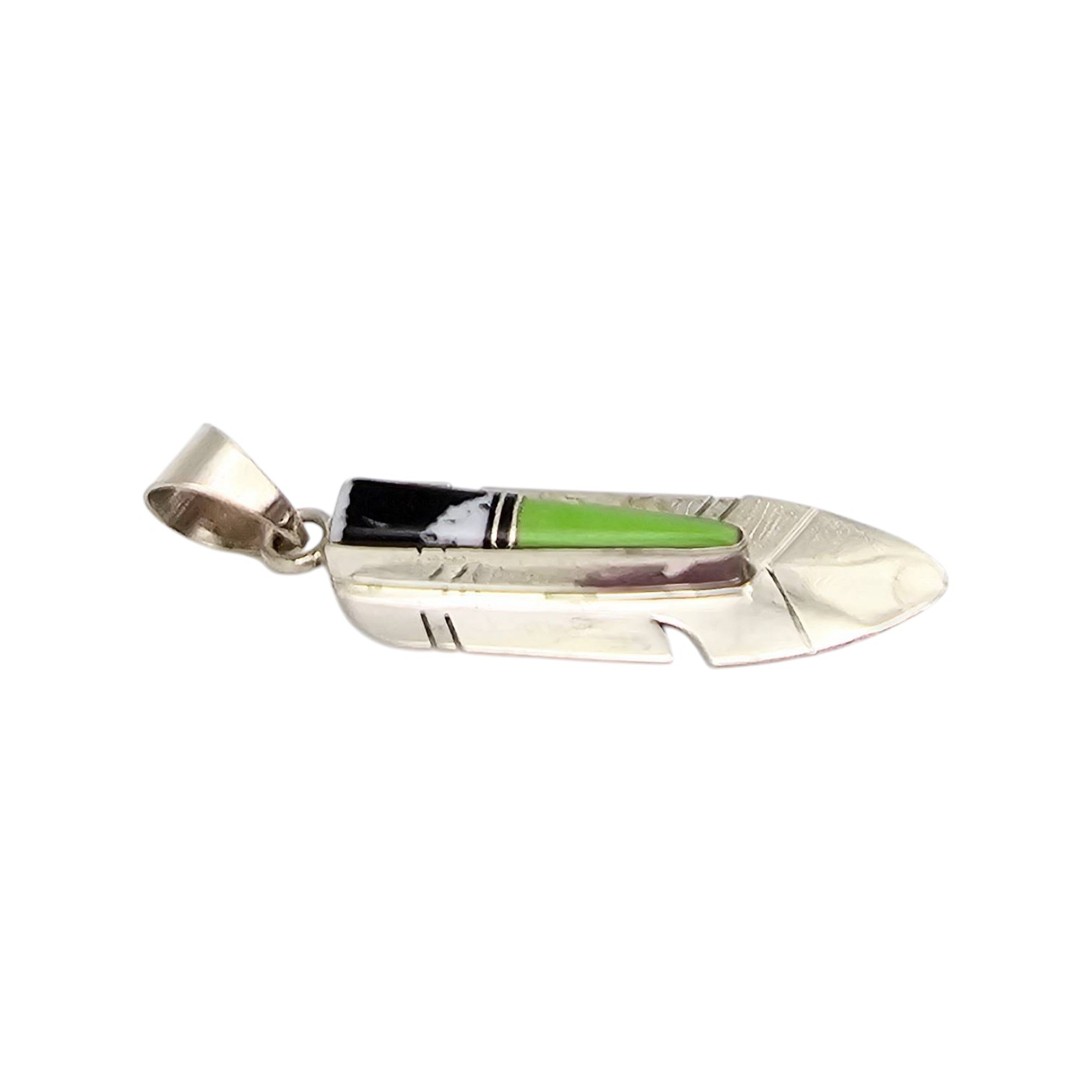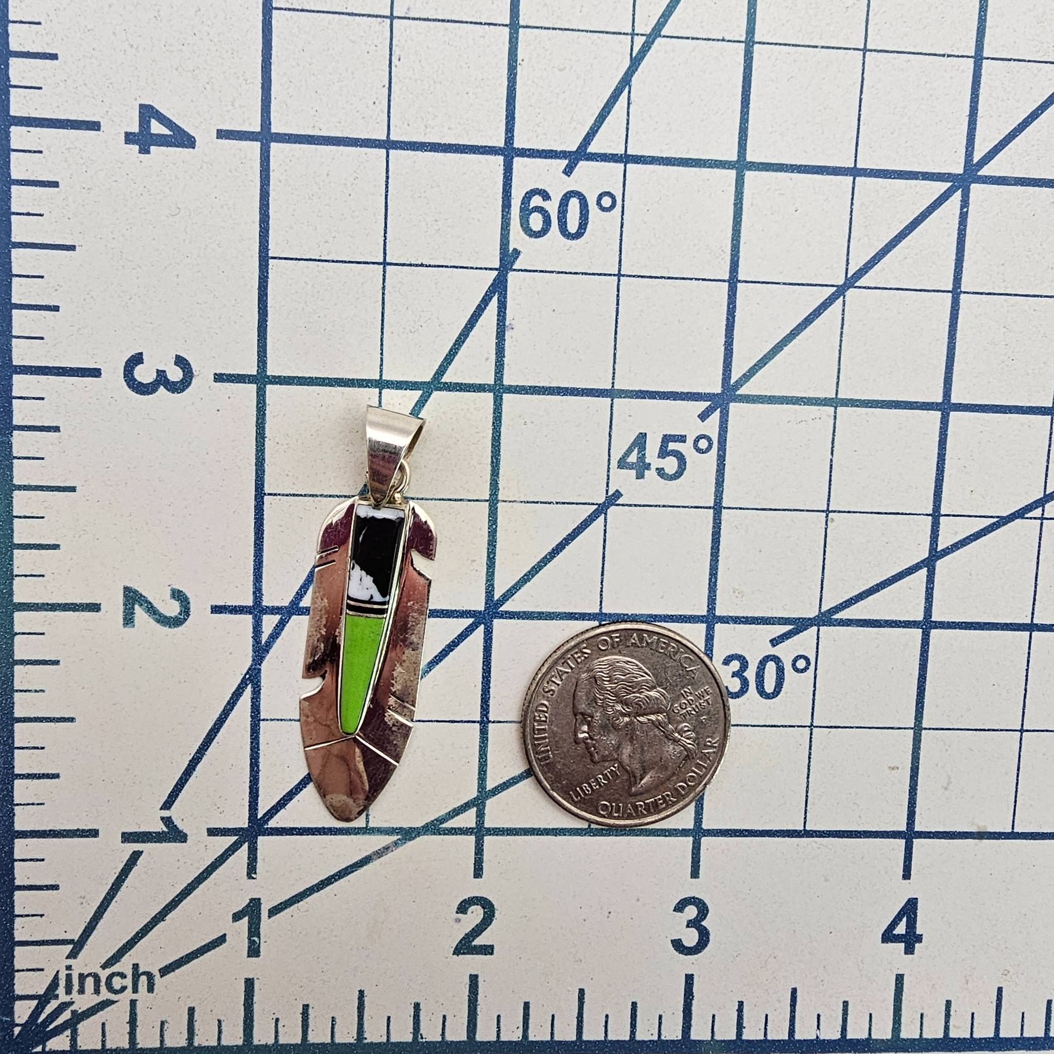 Navajo handmade feather-shaped pendant crafted by Mary Yazzie. Made of sterling silver (marked ‘STERLING’) and features multi-stone inlay with green and black stones. Weighs approximately 2.9 grams and includes a bail for attaching to a necklace. Traditional Navajo artistry with fine craftsmanship.