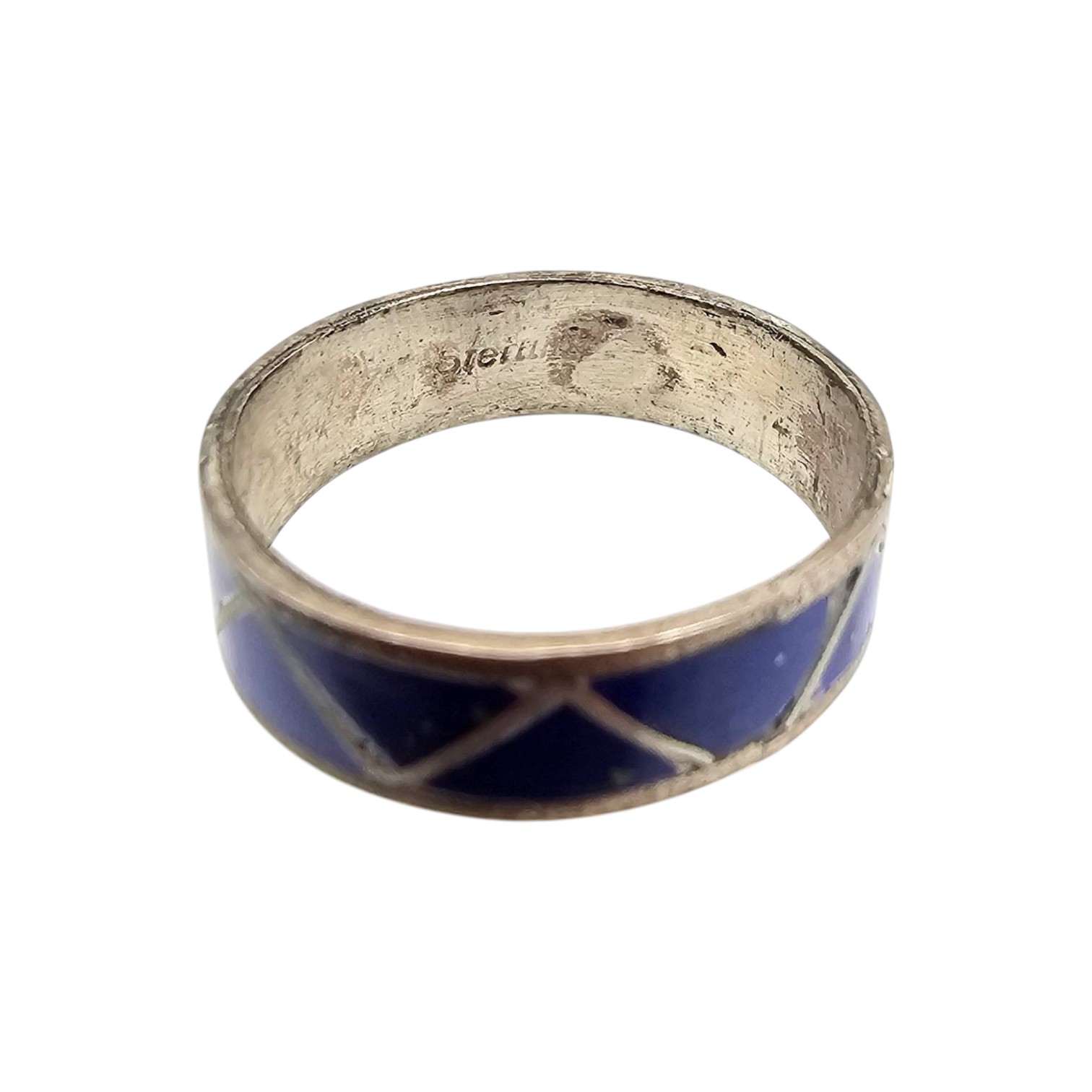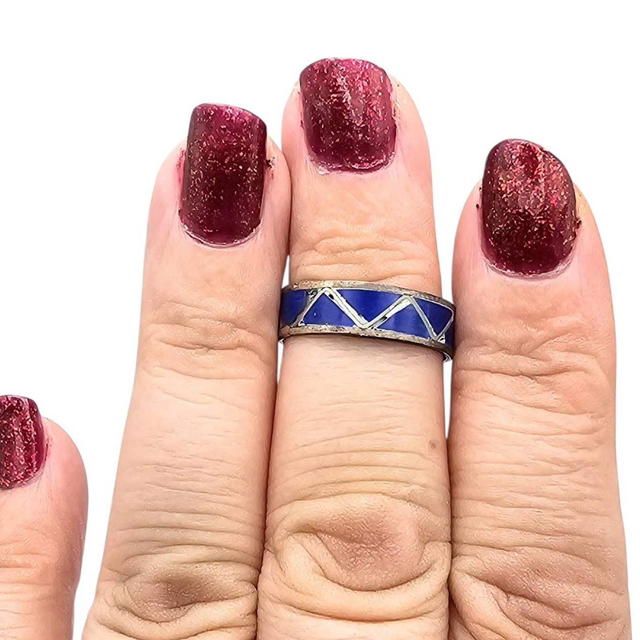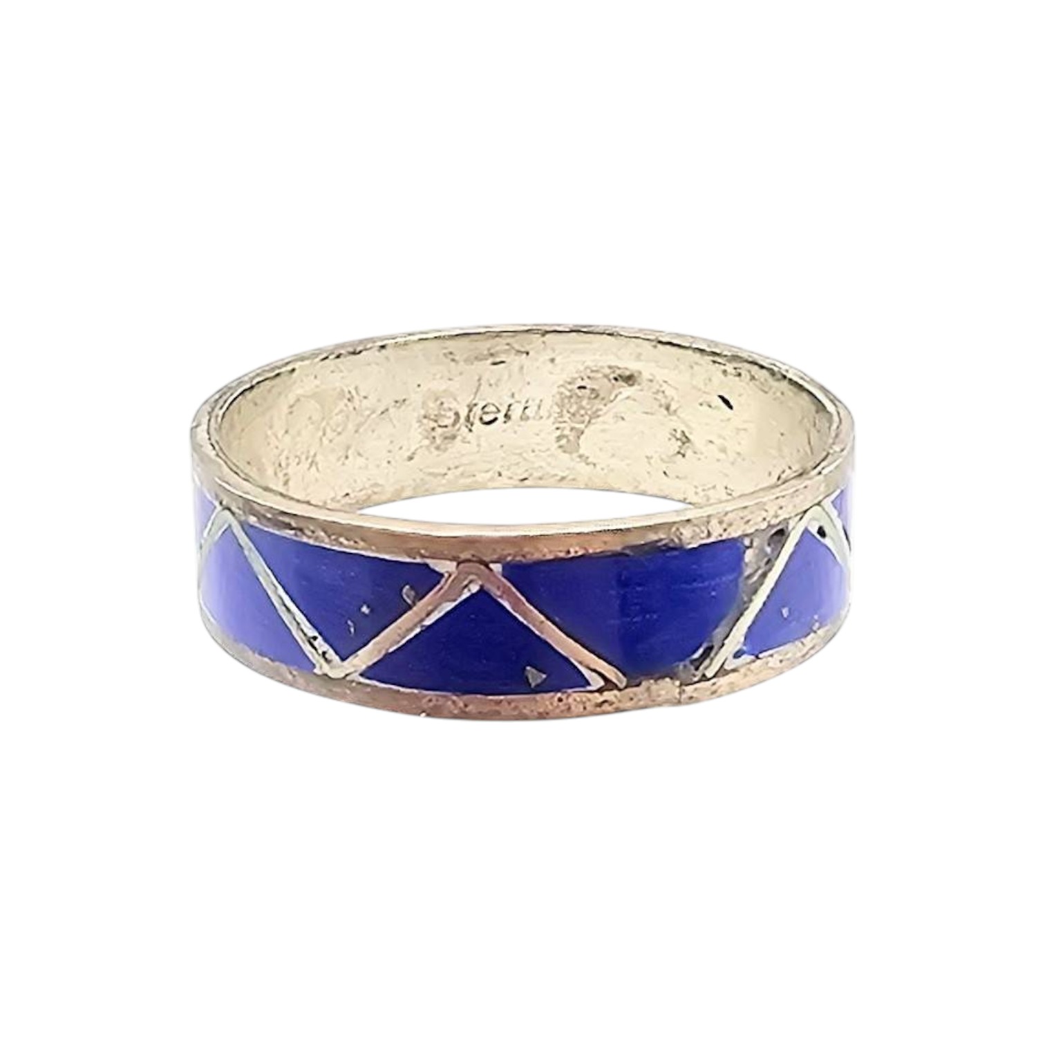 Sterling silver ring handmade by Roger Morgan, a Navajo artisan. The ring features lapis inlay in a geometric pattern. It is marked sterling, weighs approximately 1.3 grams, and has a size of 7. The craftsmanship represents traditional Navajo jewelry-making techniques.