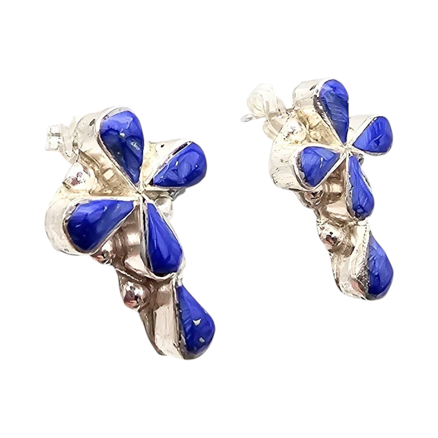 Zuni handmade sterling silver earrings by Pino Yunie. Each earring features a decorative design with lapis inlays. The total weight of the earrings is approximately 4.5 grams. Includes butterfly backs.
