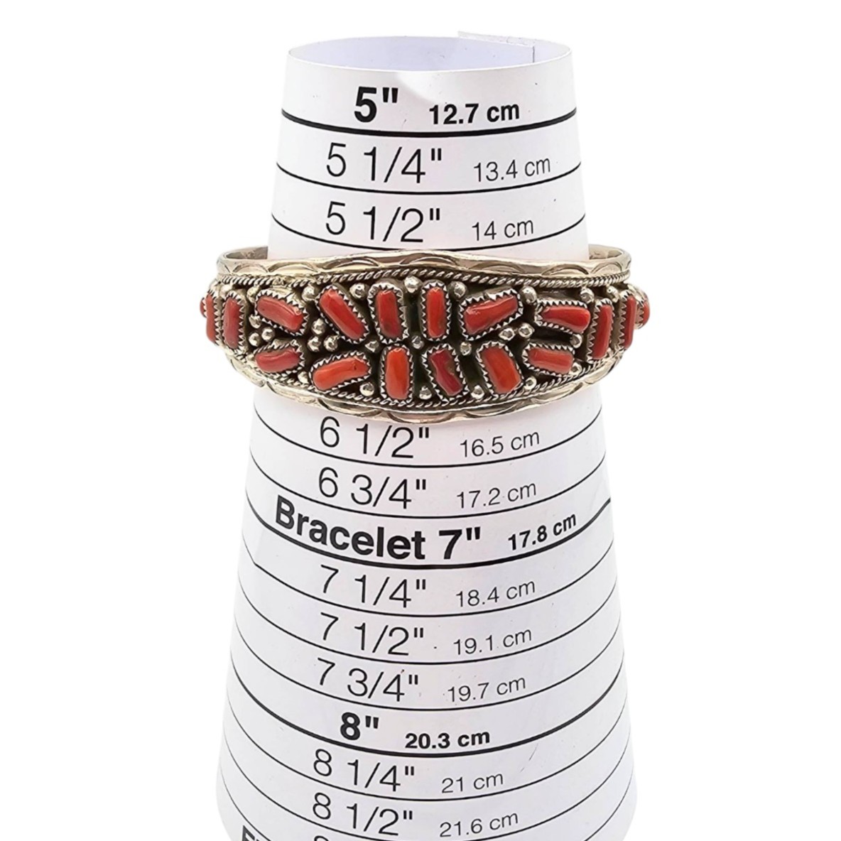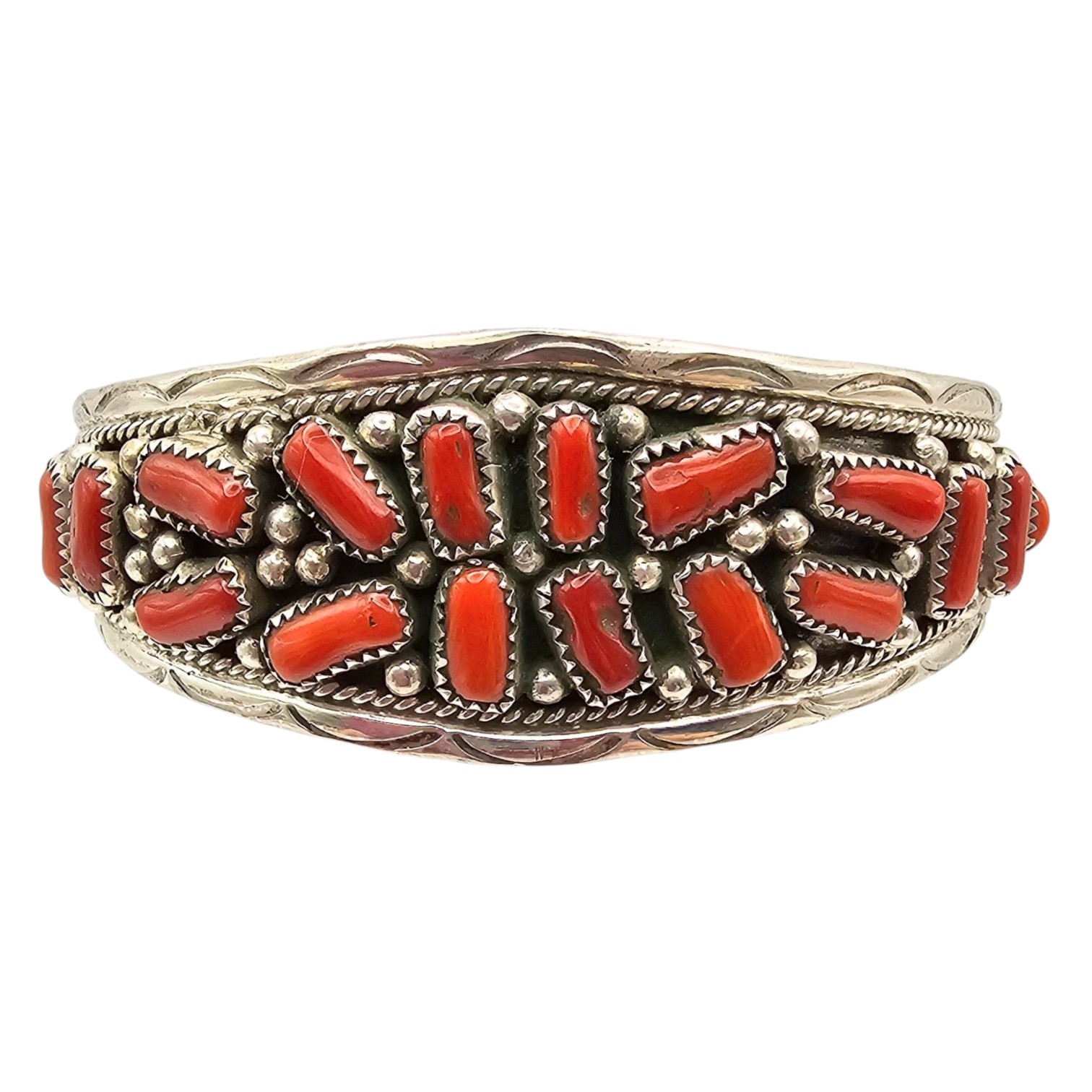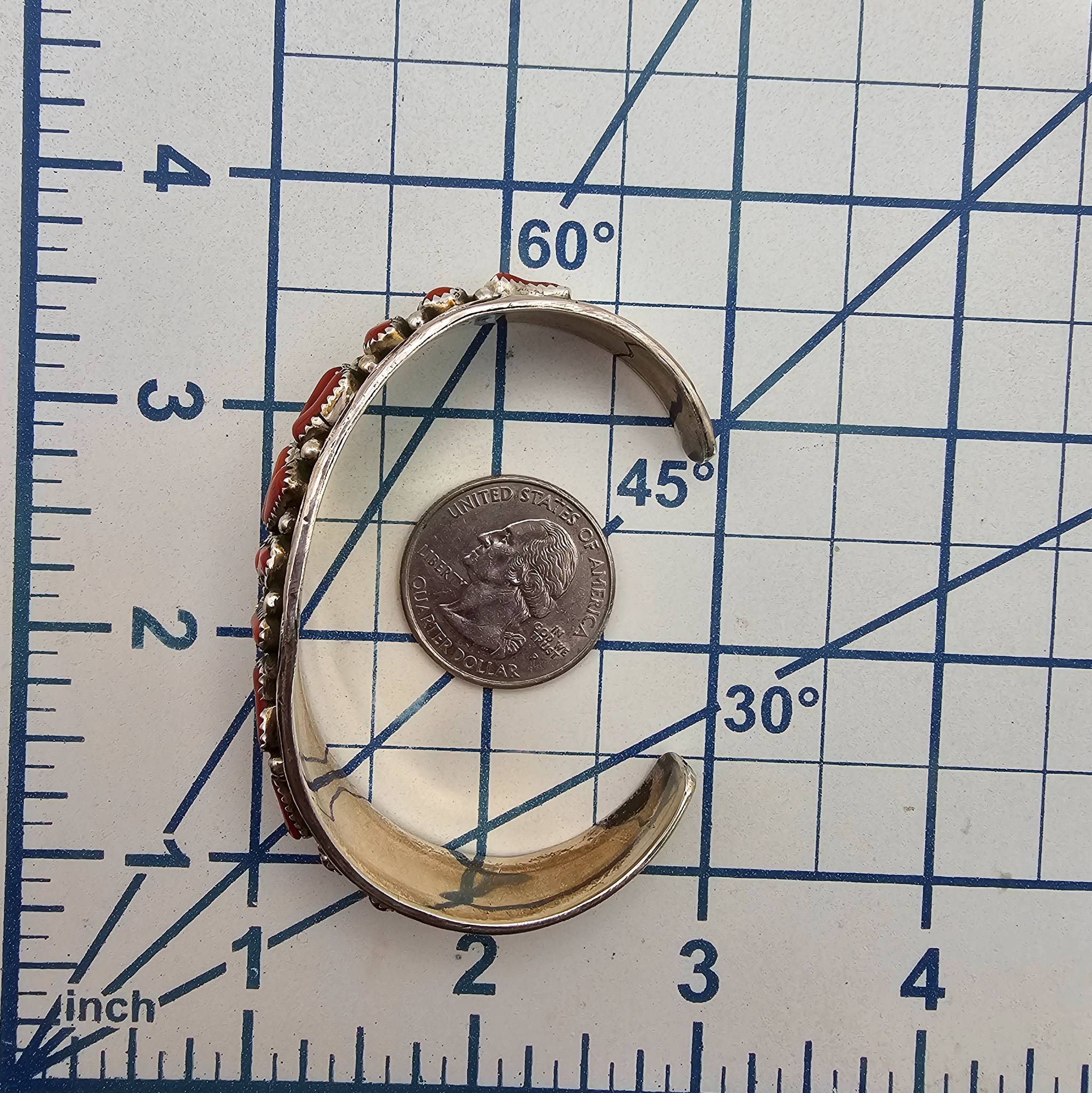 Navajo handmade bracelet crafted by Anita Whitegoat featuring sterling silver and red coral stones arranged in an intricate design. Stamped ‘A Sterling’ on the interior. The bracelet is measured for a 7-inch wrist and weighs approximately 27.6 grams.