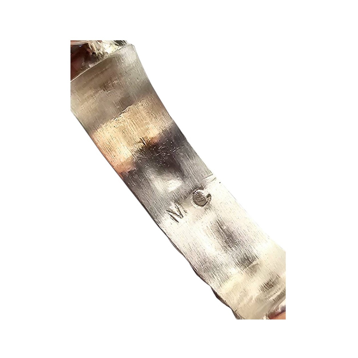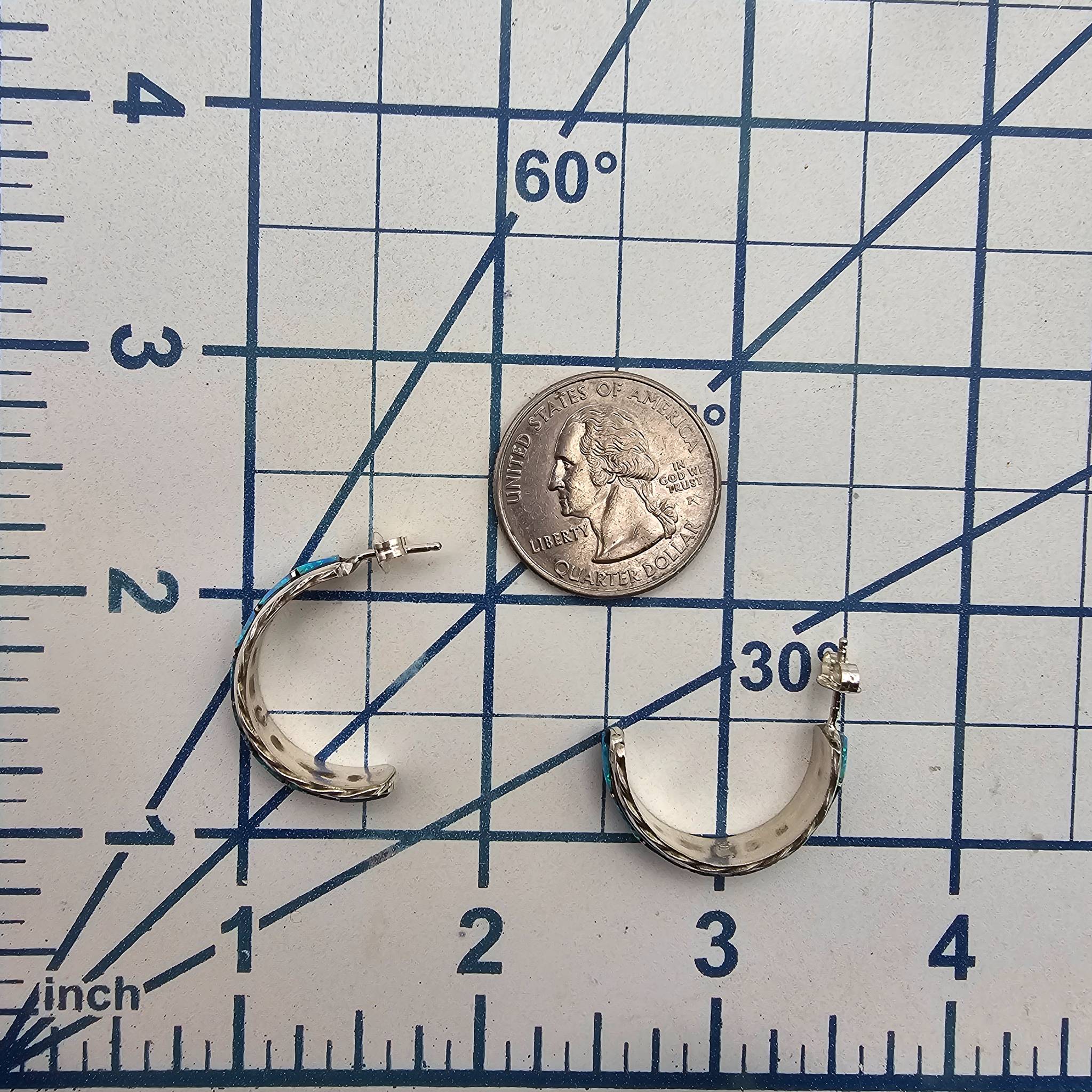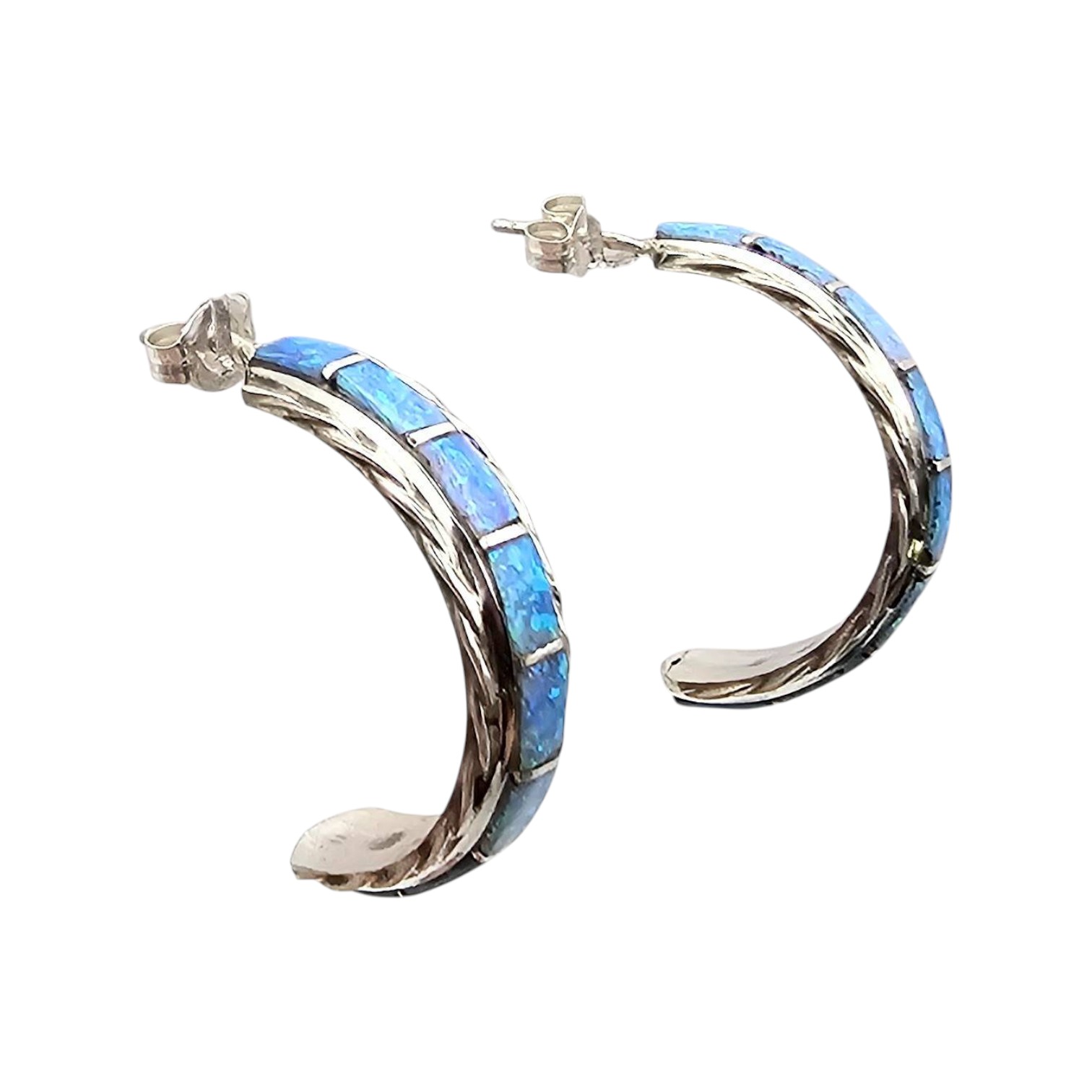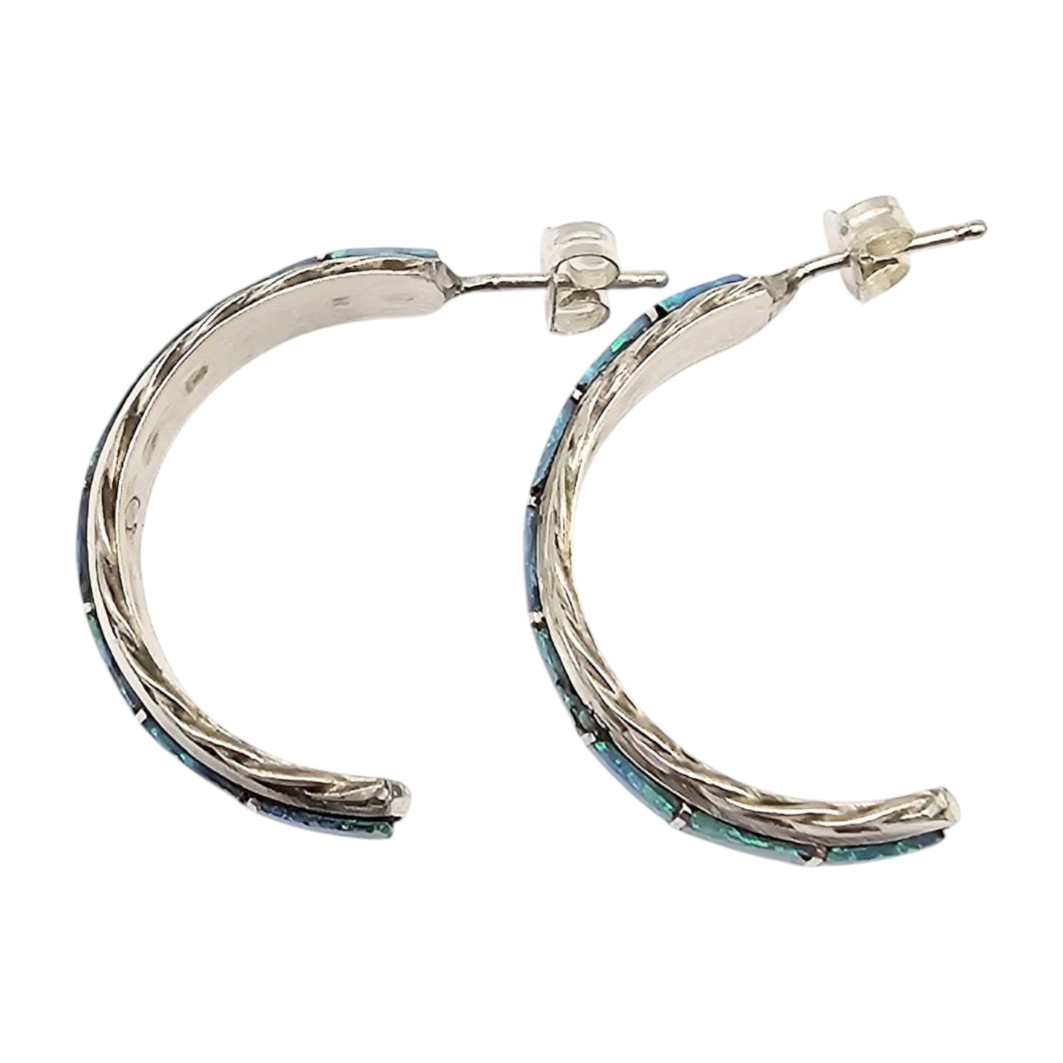 Zuni handmade sterling silver and opal earrings by Malcom Chaves. Featuring an inlaid opal design, these hoop-style earrings display vibrant blue opal accents and a detailed silver edge. Each earring is stamped with the artist’s initials ‘MC’ on the reverse. Weight: 4.5 grams. Includes butterfly backs for secure wear.