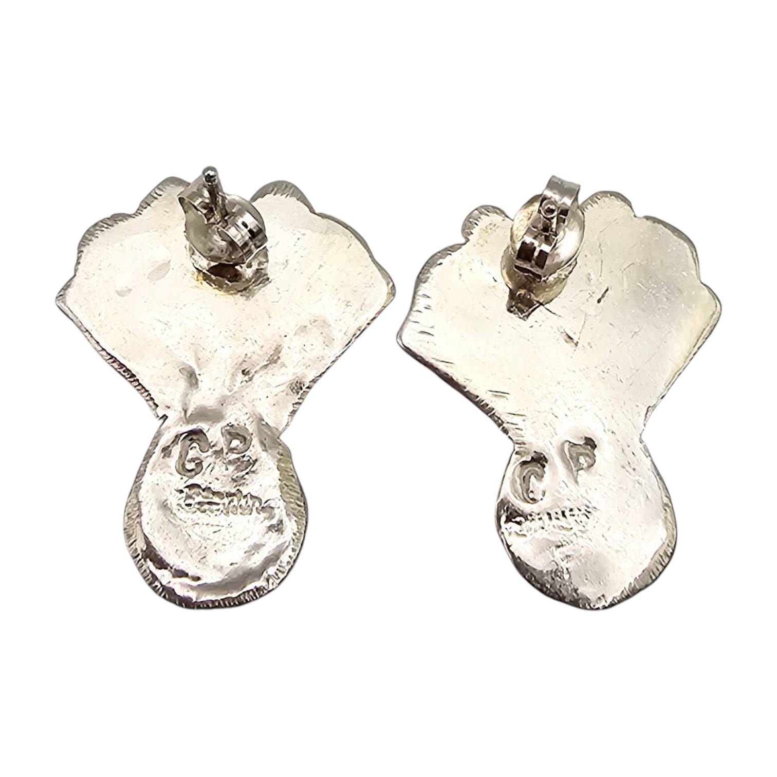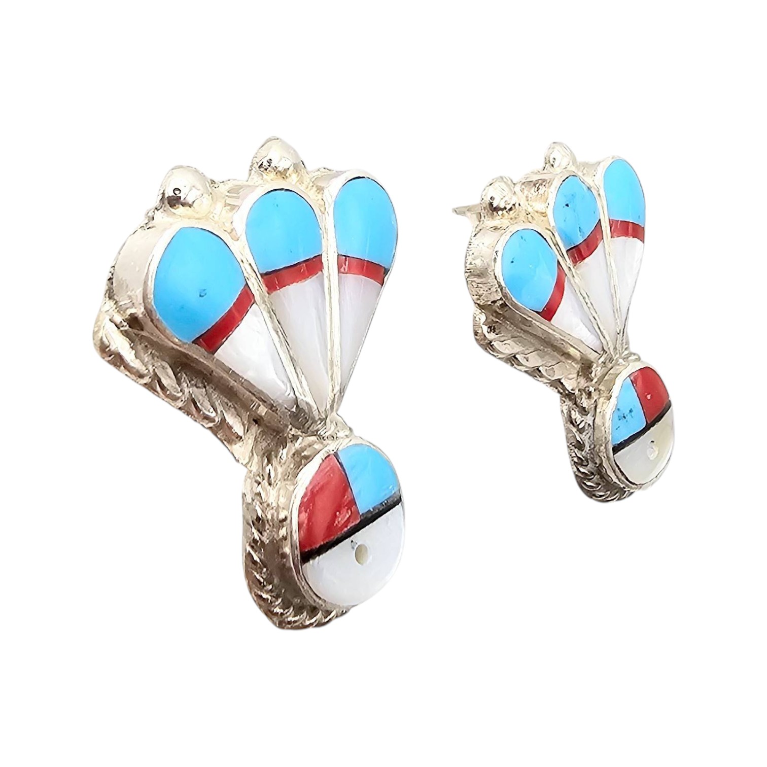 Handcrafted sterling silver earrings by Clarence Pedro, a Zuni artisan. Each earring features a multi-stone inlay sunface design with turquoise, coral, black onyx, and white shell. Marked with the artist’s initials ‘CP’ on the back. The total weight is 7.8 grams. Earrings measure approximately 1 x 1 inch. Includes secure post backings for wear. As-is, shown in photos.