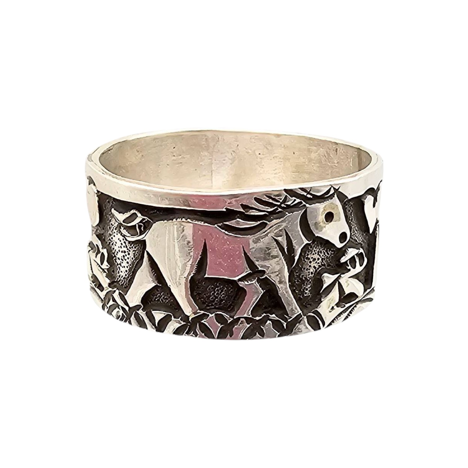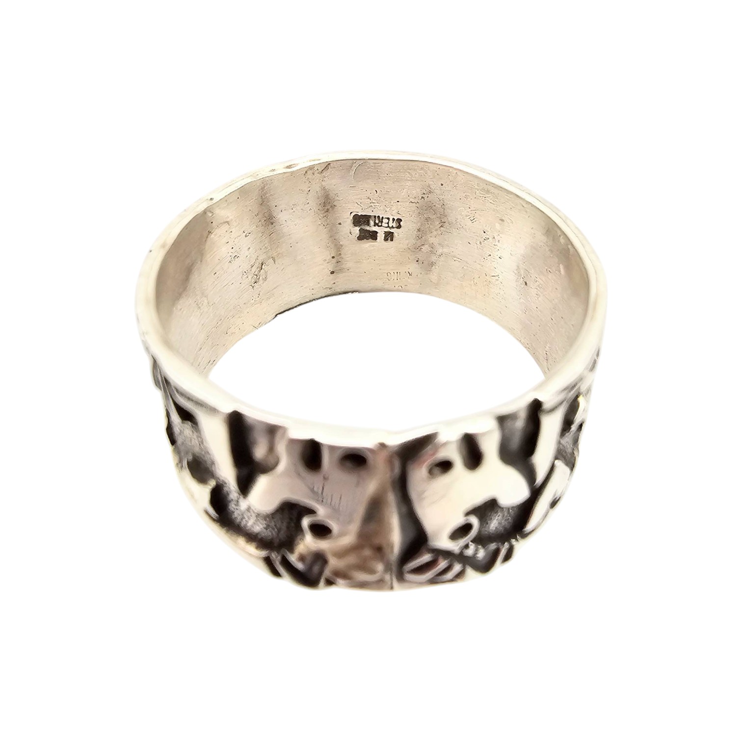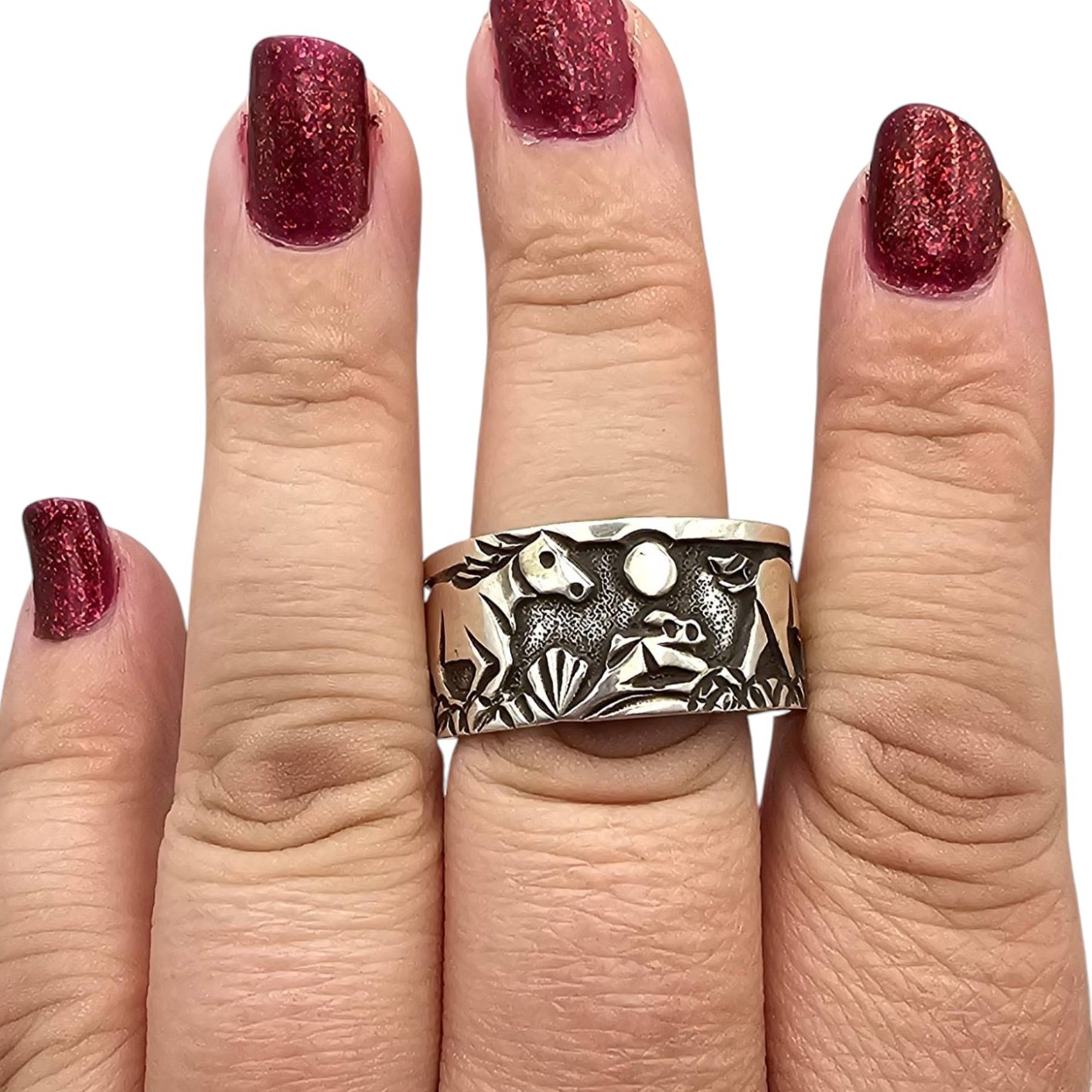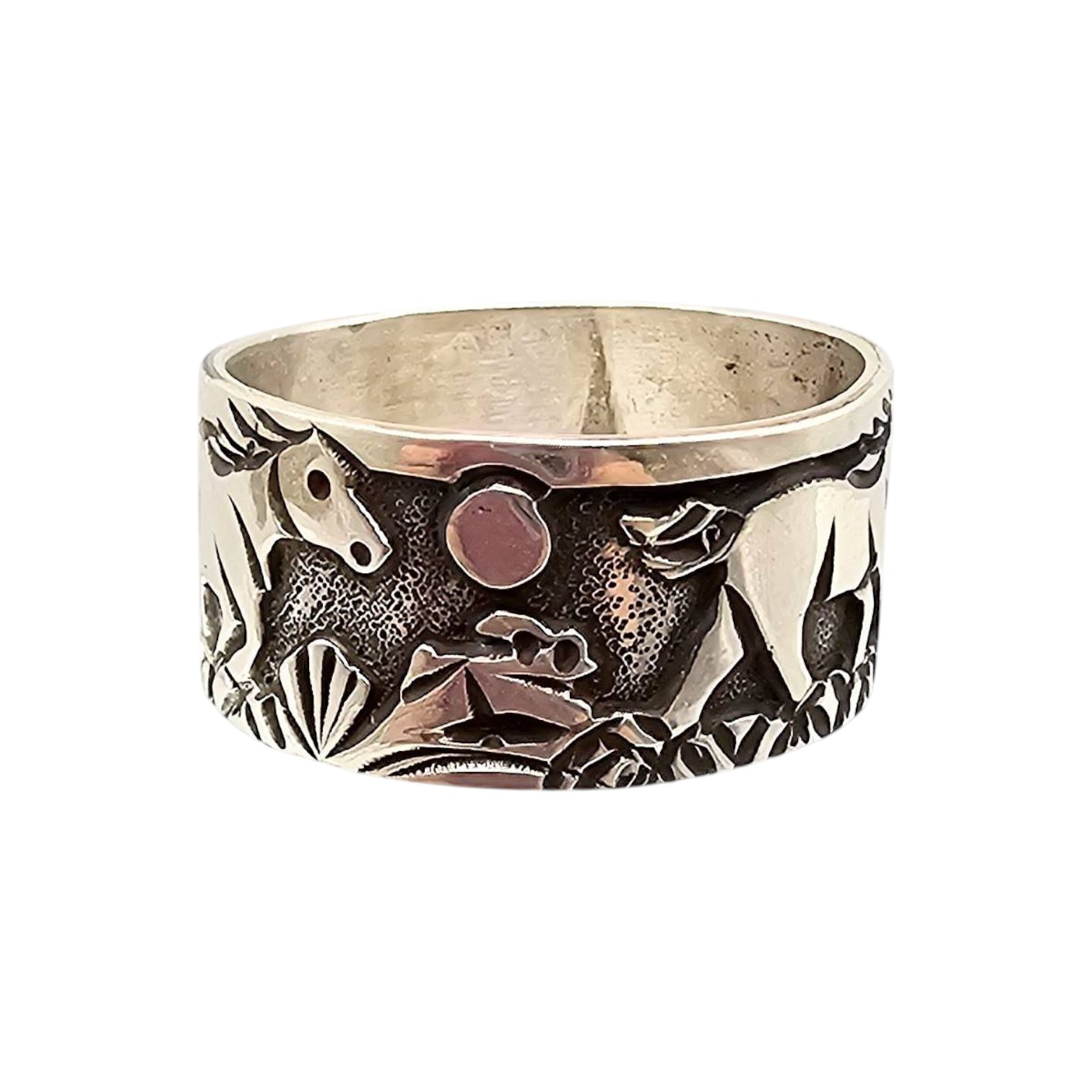 Sterling silver storyteller ring handmade by Navajo artist Elaine Becenti. Features intricate designs of symbolic imagery, including landscapes and animals. Marked ‘STERLING’ and artist-stamped. Weighs 8.9 grams and is size 15. Excellent craftsmanship and cultural significance.