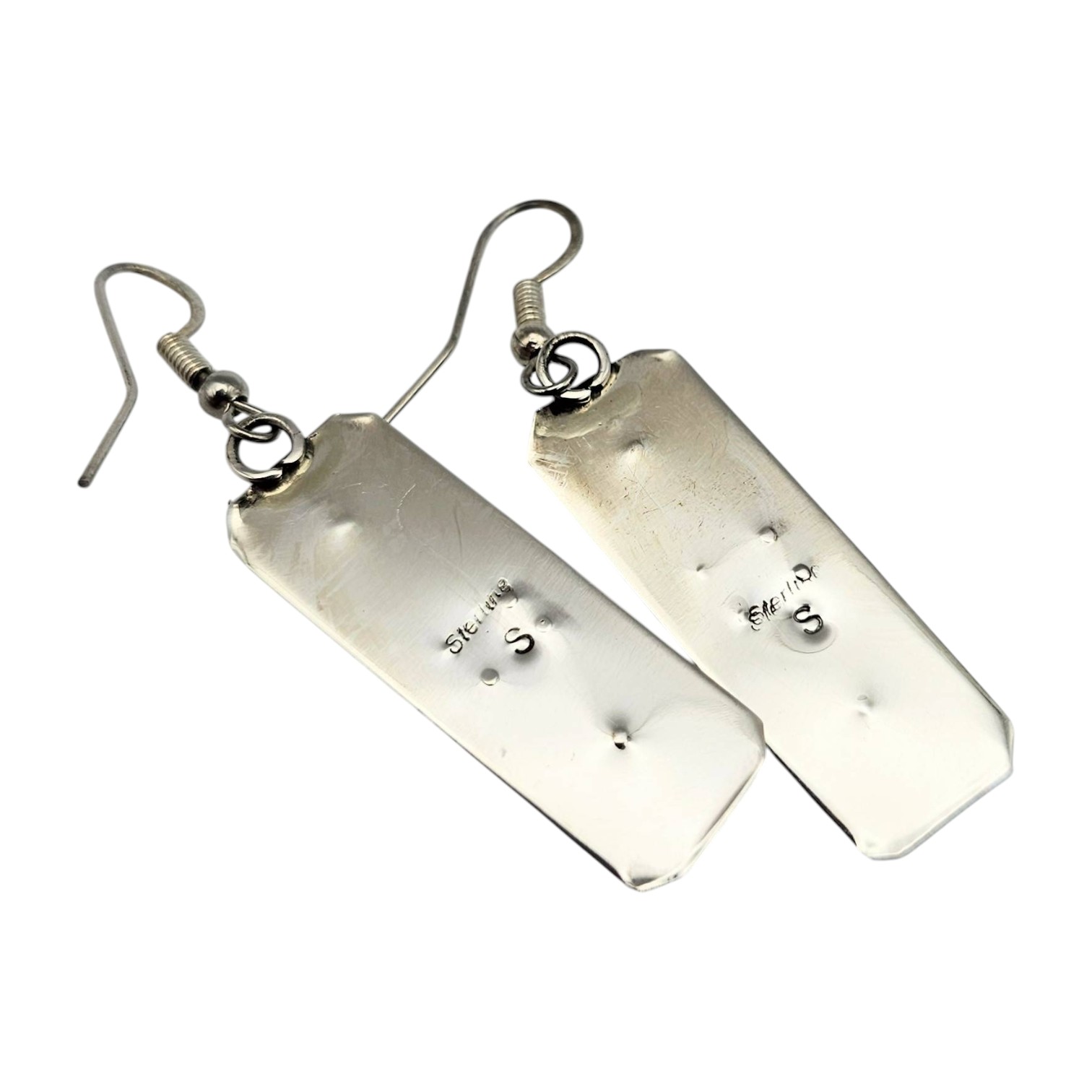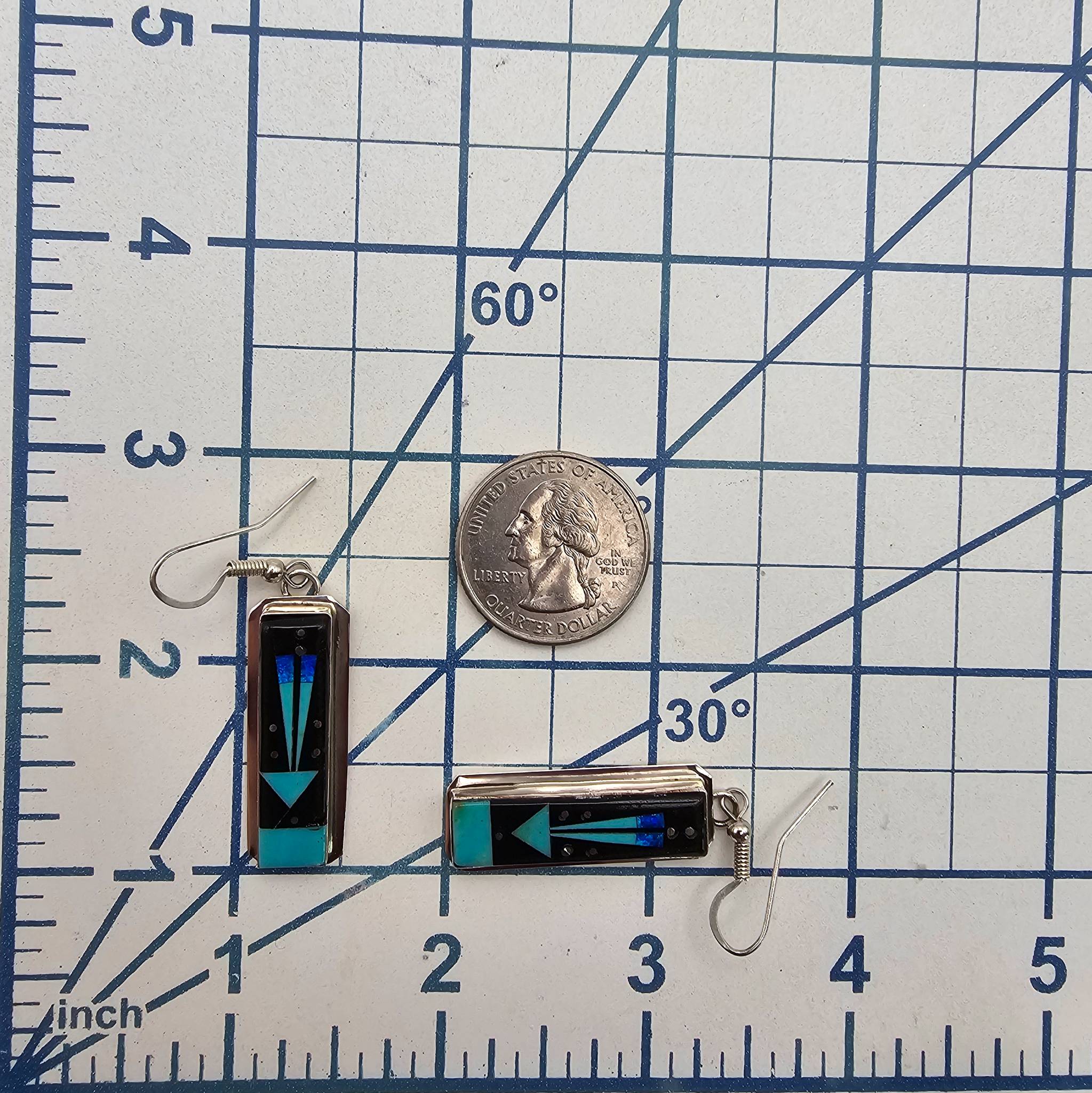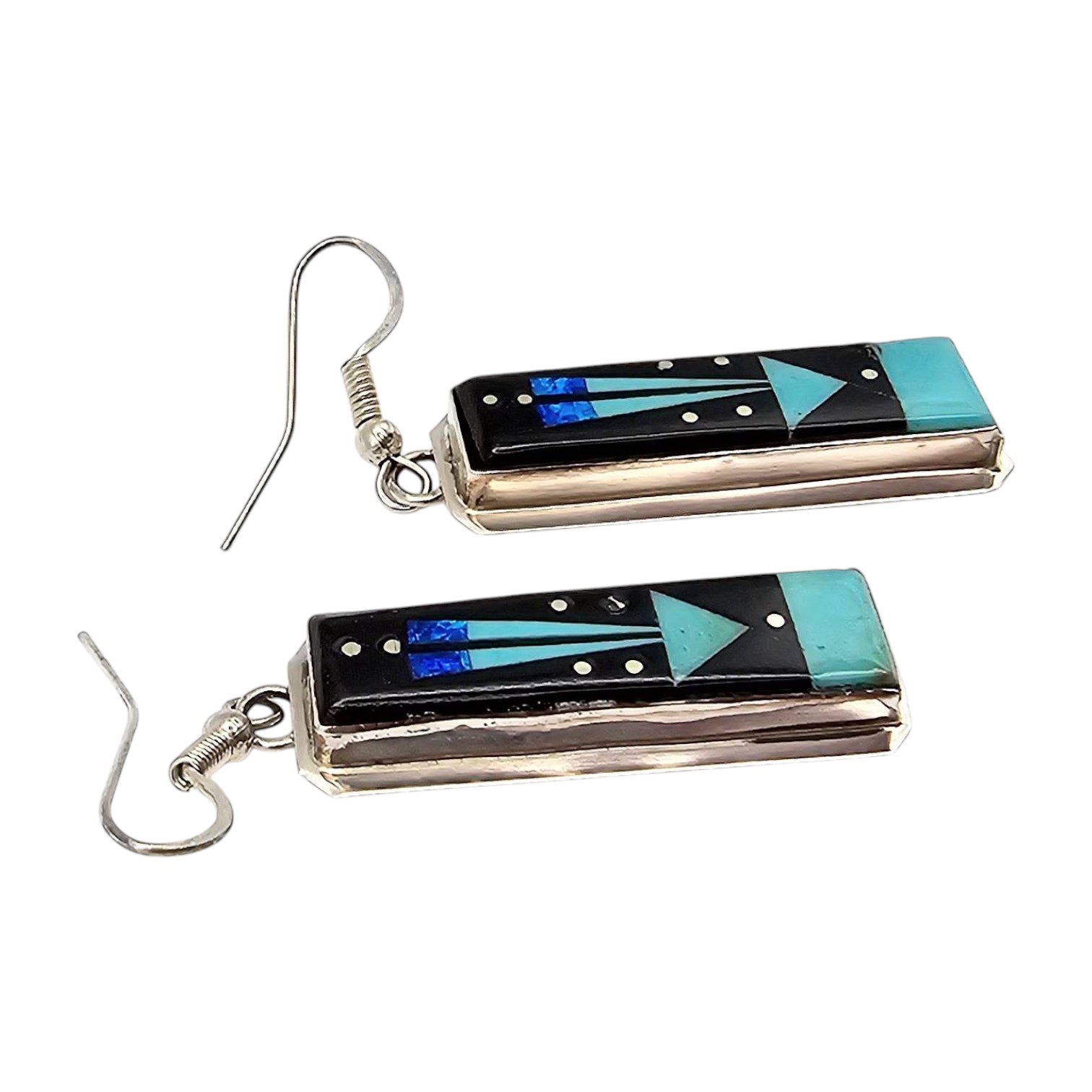 Handmade Navajo sterling silver earrings by artist Gilbert Smith. The earrings feature a multi-stone inlay design with turquoise and other colored stones. The artist’s hallmark, ‘G S,’ is stamped on the reverse. The earrings measure approximately 2 inches in length, including the hooks, and have a combined weight of 5.8 grams.