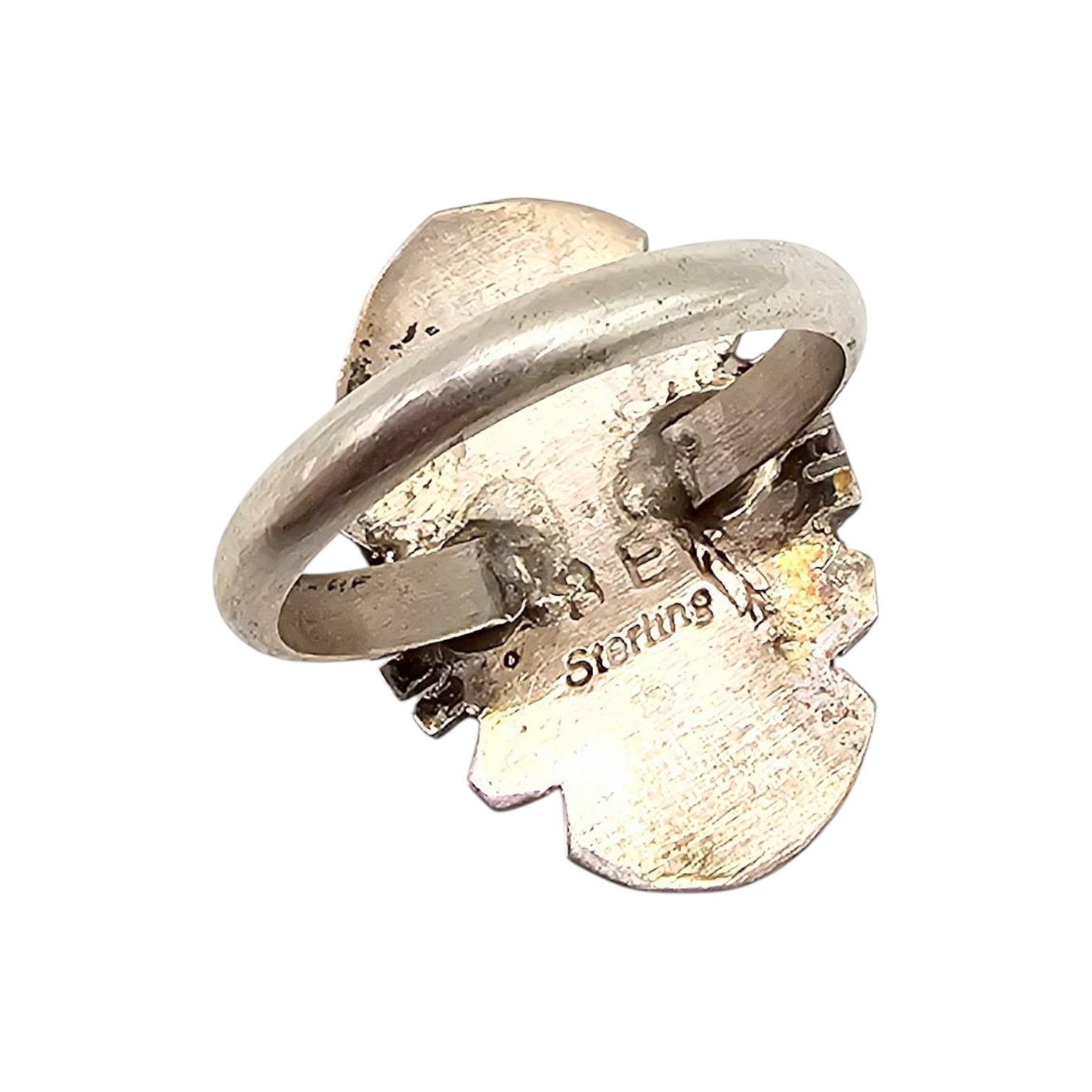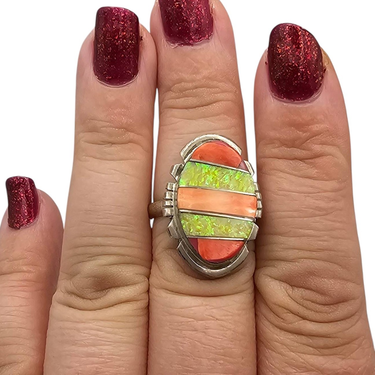 Handcrafted sterling silver ring by Brandon Etcity, a Navajo artisan. Features a multi-stone inlay design with vibrant colors. Marked ‘Sterling’ on the back. Ring size is 8, and the total weight is 5.9 grams. Exceptional craftsmanship and use of materials reflecting traditional Navajo artistry.