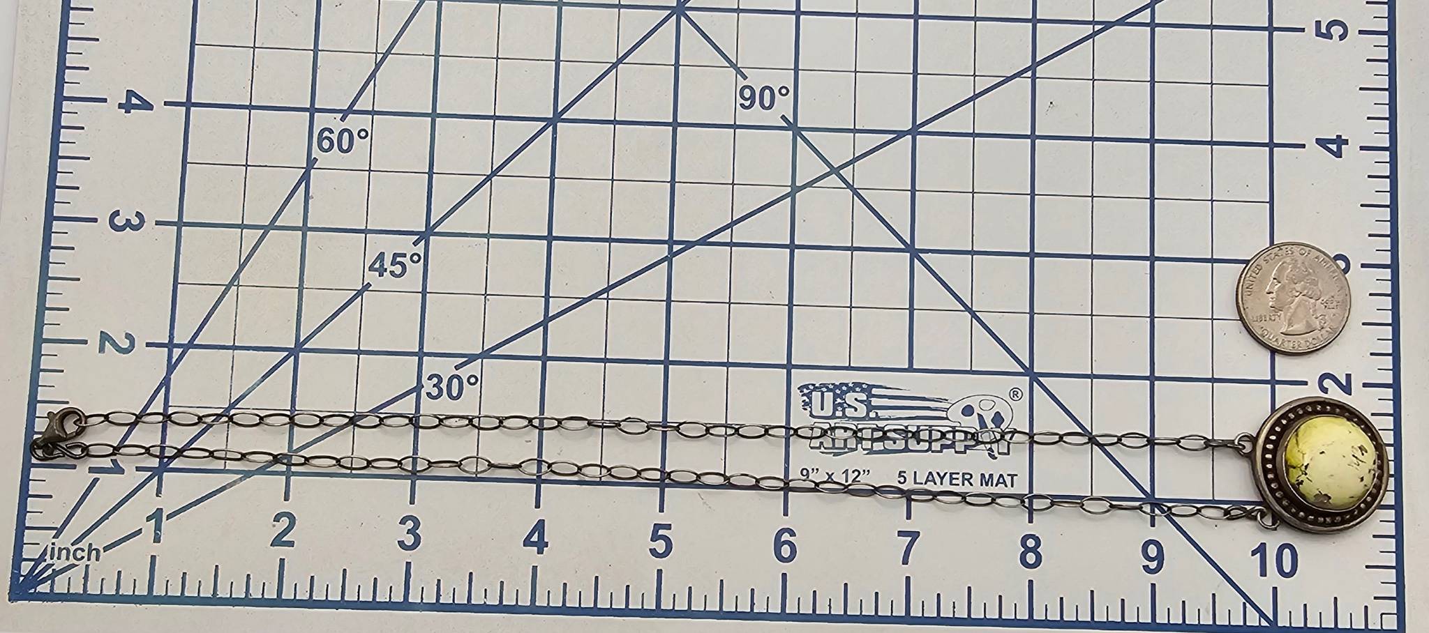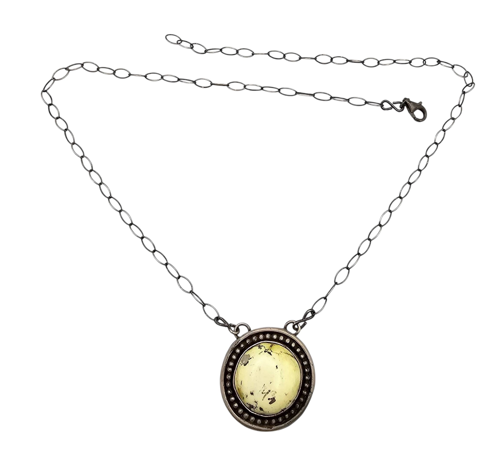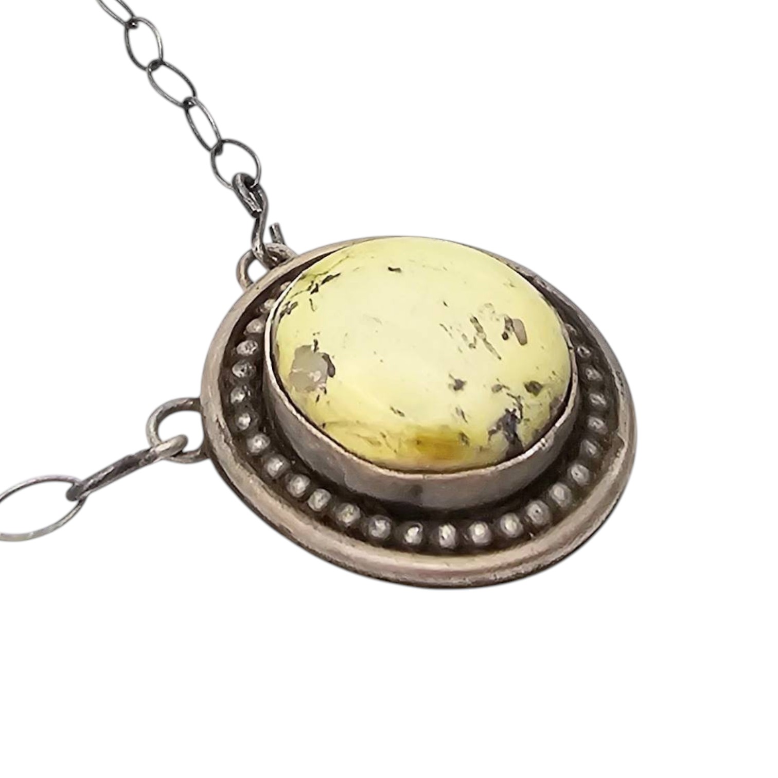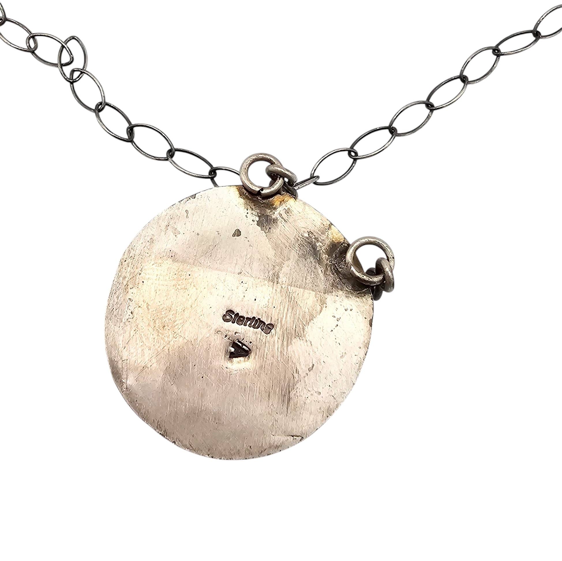 Navajo handmade sterling silver necklace by Antionete Largo. Features a circular palomino stone encased in a sterling silver bezel with beaded accents. The necklace includes a link chain with a secure clasp. The pendant is stamped ‘Sterling’ on the back. Total weight is 15.1 grams, and the dimensions of the chain and pendant can be referenced against a ruler in the images.