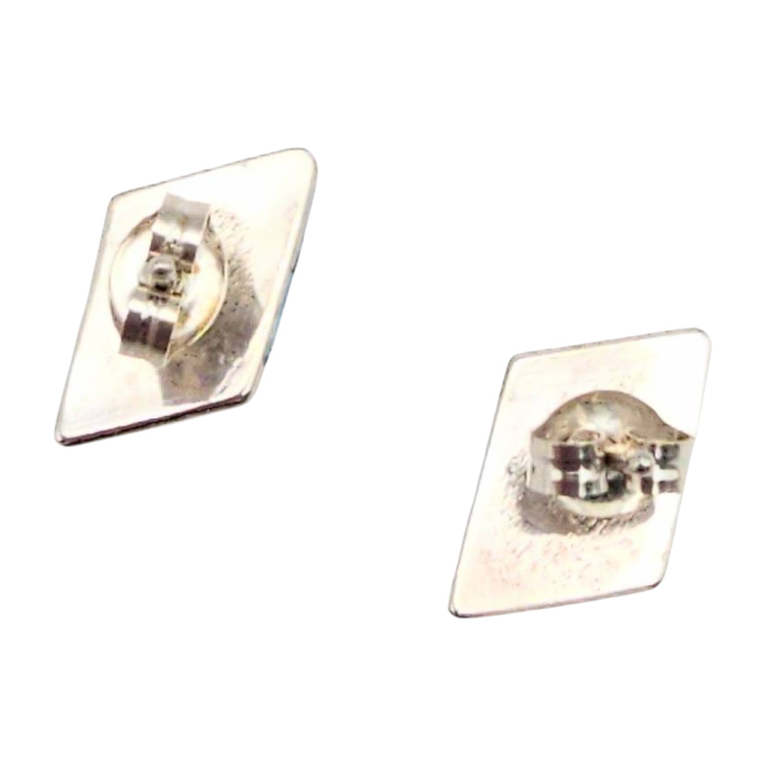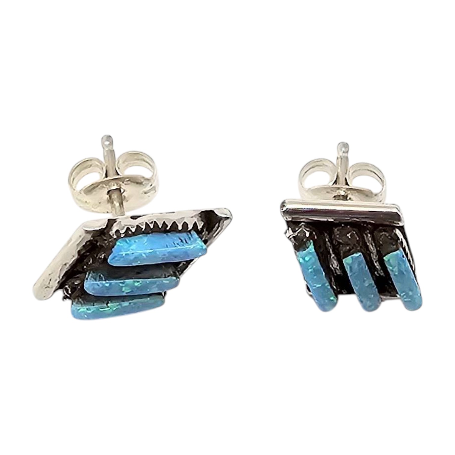 Cletus Lamy Zuni handmade sterling silver earrings featuring vibrant opal inlay. These diamond-shaped stud earrings showcase the craftsmanship and intricate design of Zuni jewelry. Weighing approximately 1.5 grams, these earrings measure under 0.5 inch in length. Post-back closures ensure a secure fit.