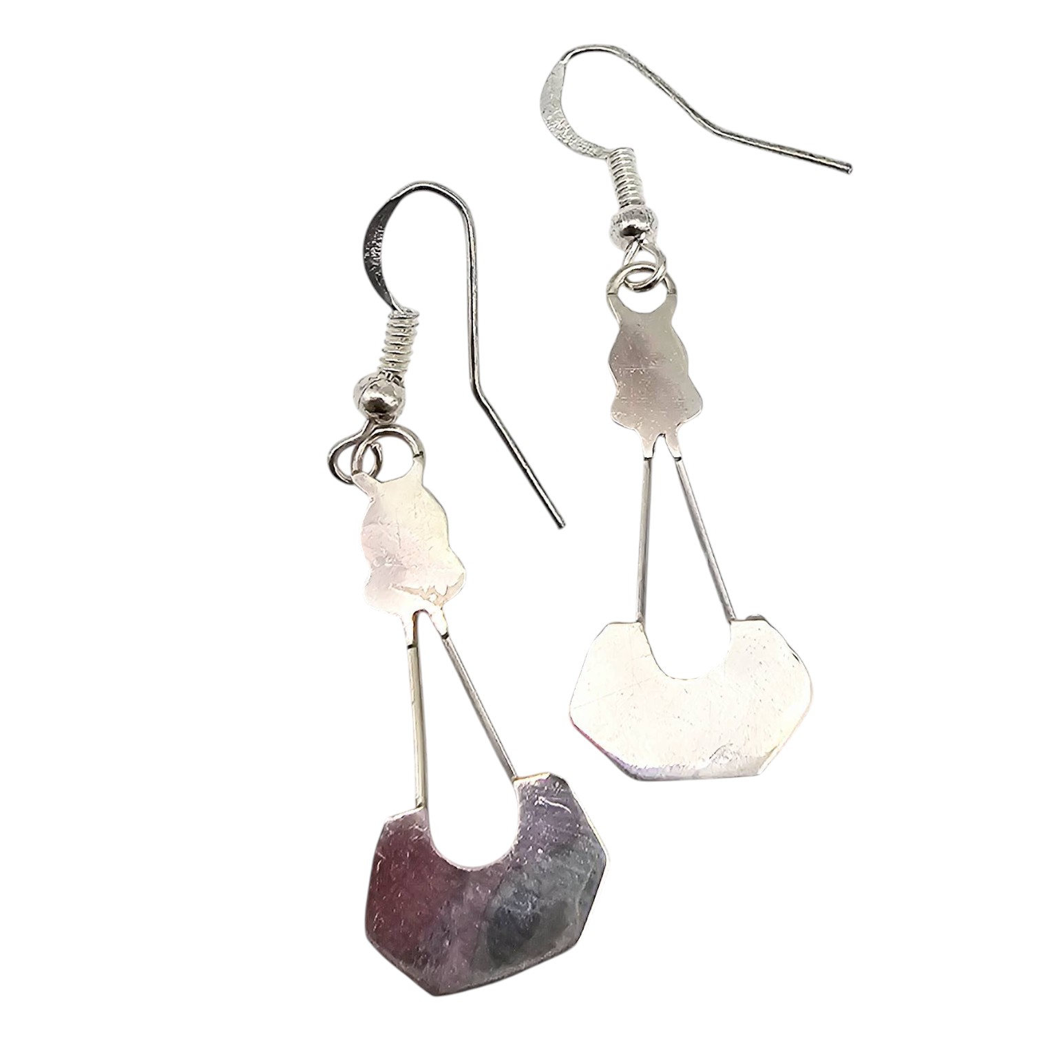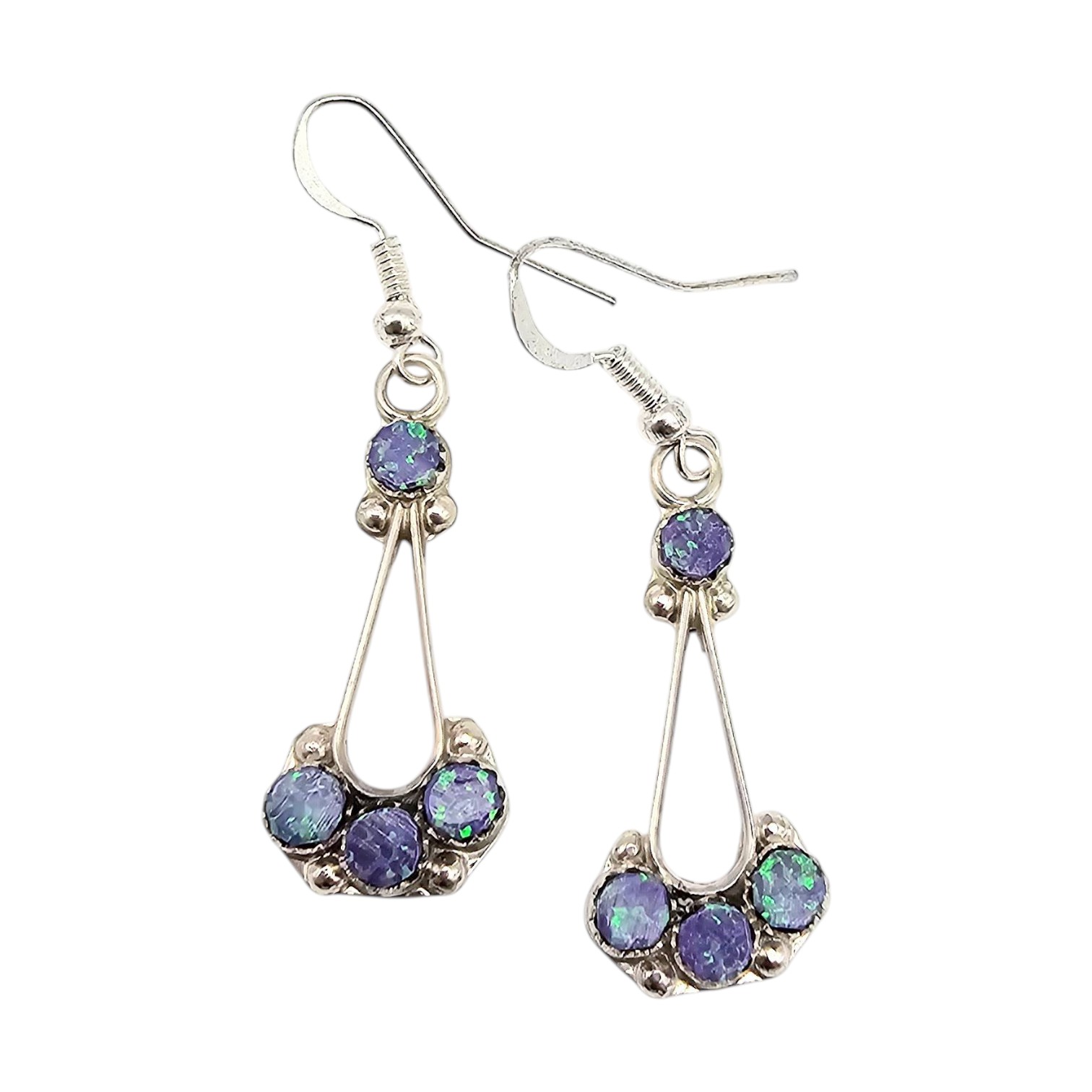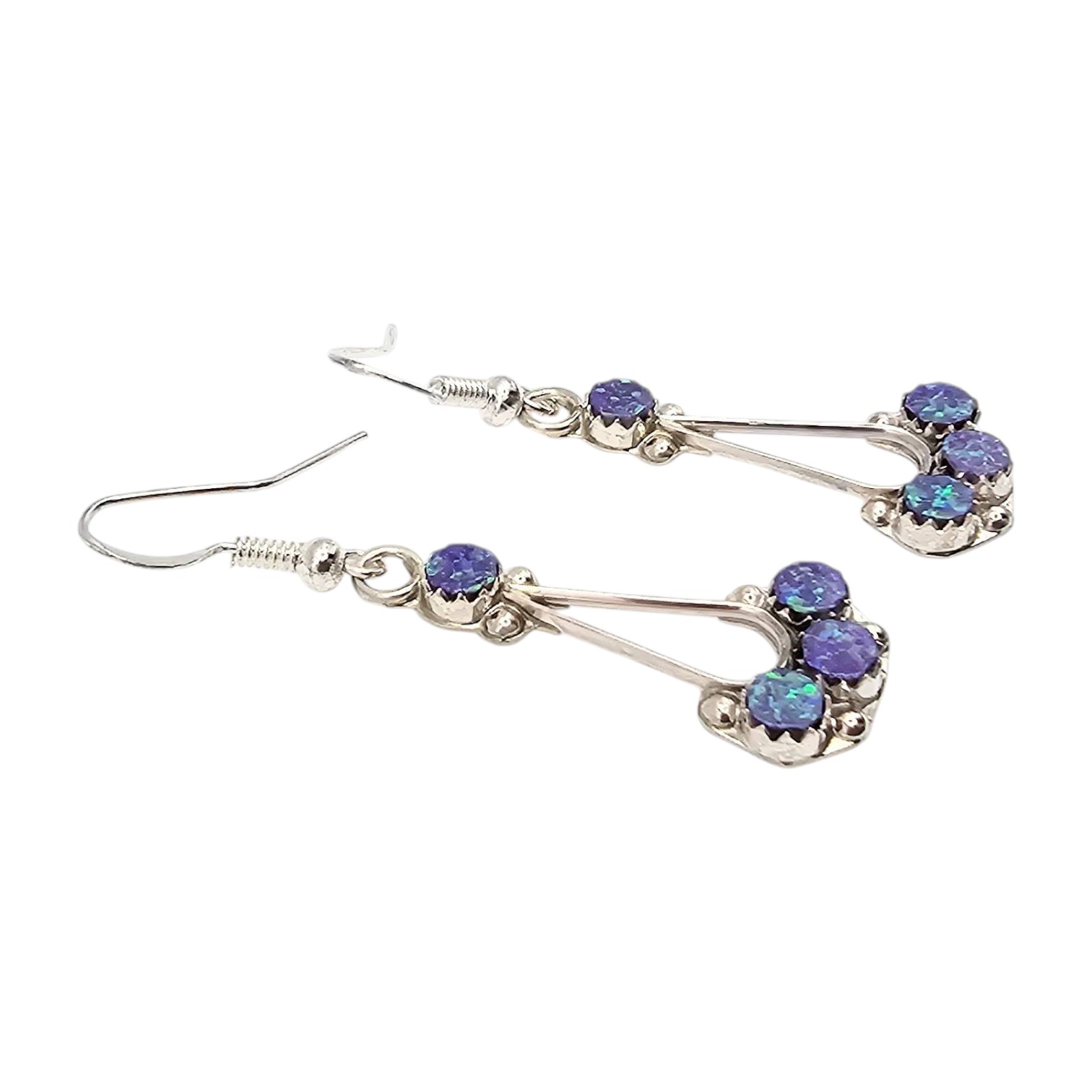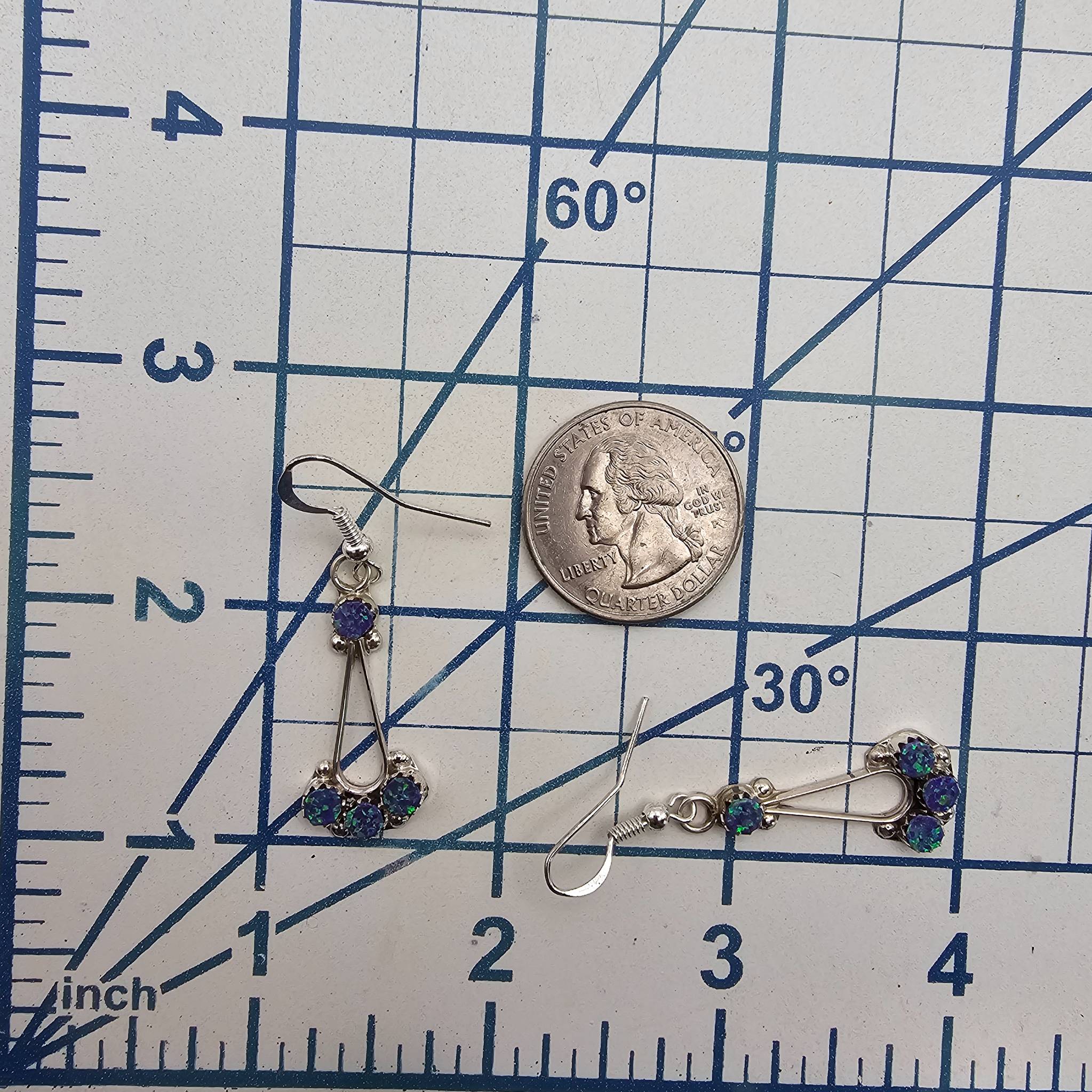 Zuni handmade dangle earrings crafted by Swain Charlie. Made of sterling silver and set with multiple opal stones. The earrings weigh approximately 3.1 grams and feature a hook fastening. Measuring roughly 1.5 inches in length as indicated by the scale grid. Includes an original price tag of $100.