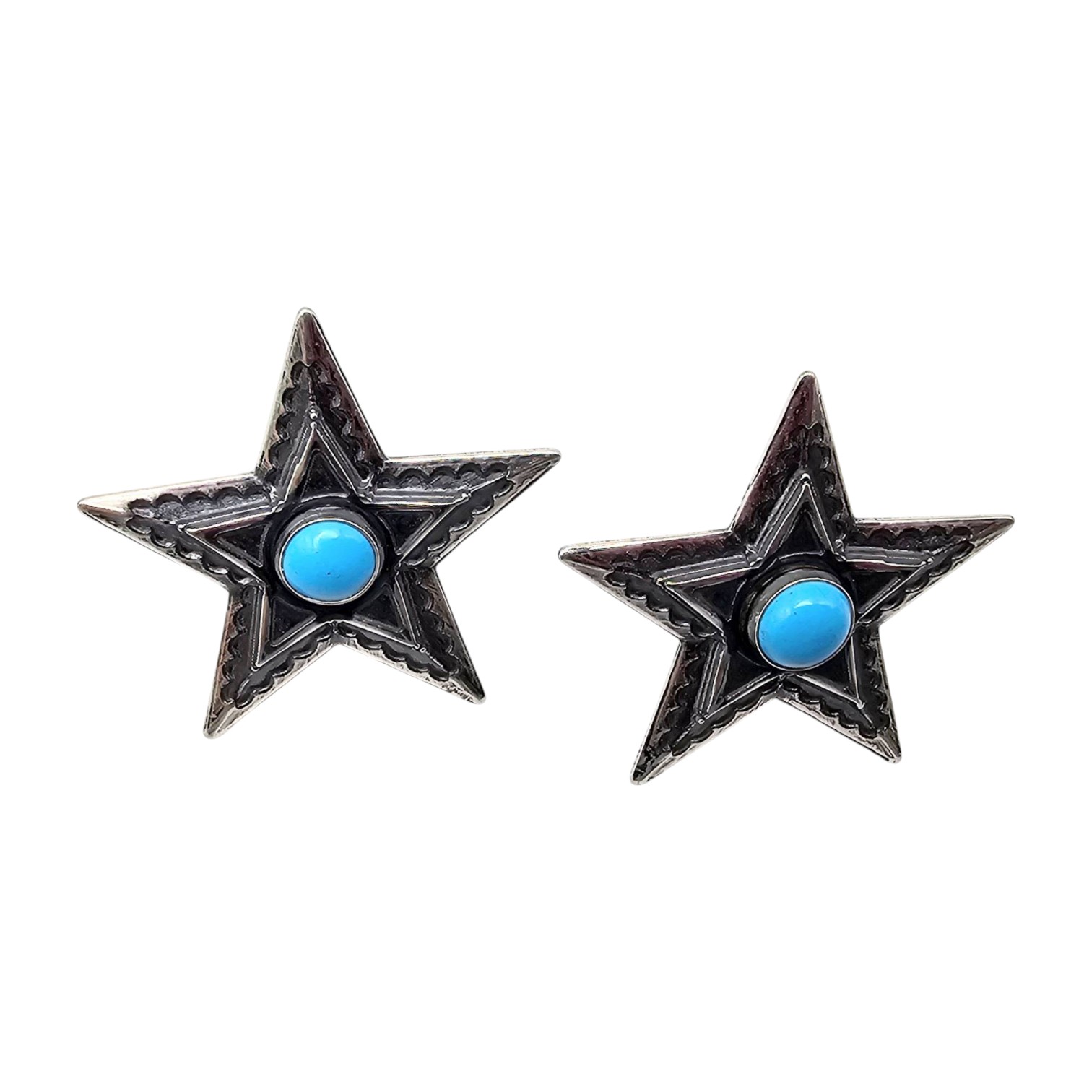 Star-shaped sterling silver earrings featuring Kingman turquoise cabochons at the center. The intricate design highlights Southwest-inspired motifs. Earrings measure approximately 1.5 inches in height and weight is approximately 5.1 grams. The earrings have a stud back fastening. Original retail tag indicates $110.