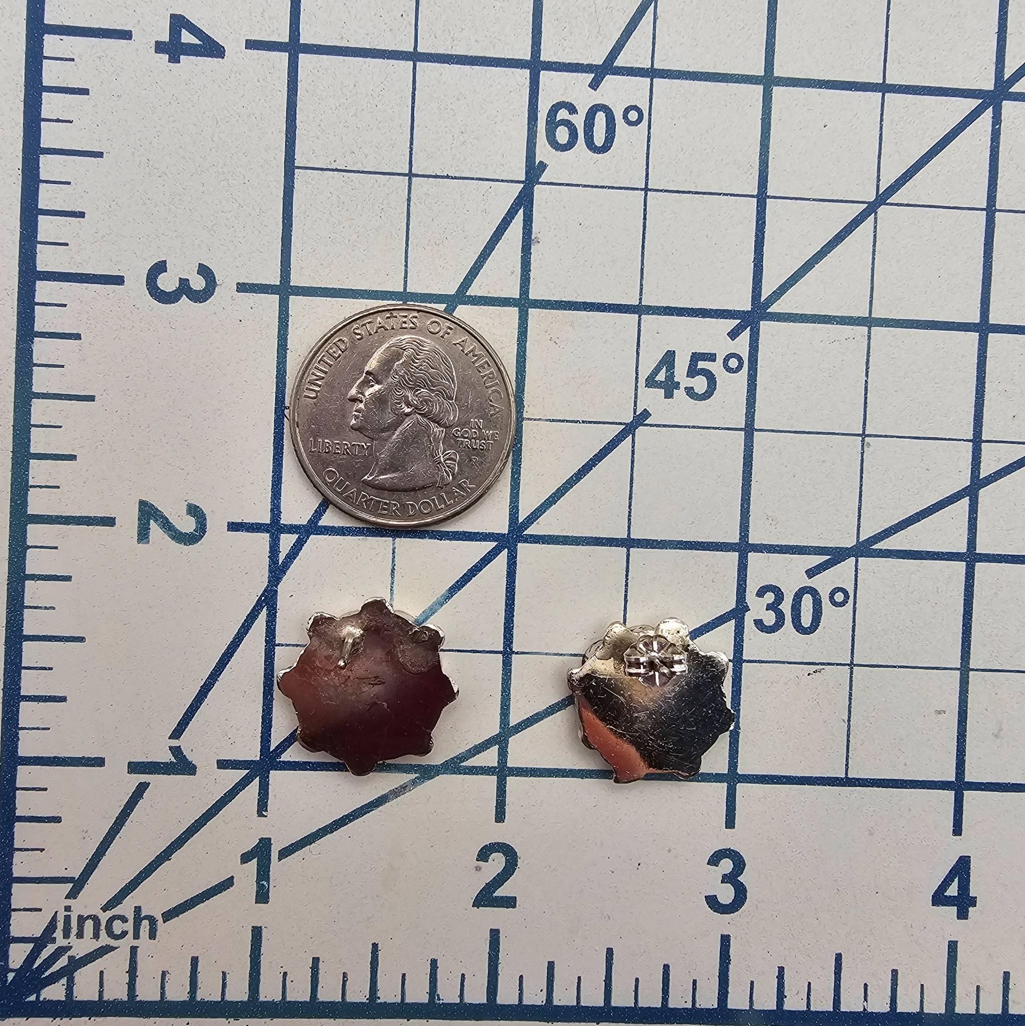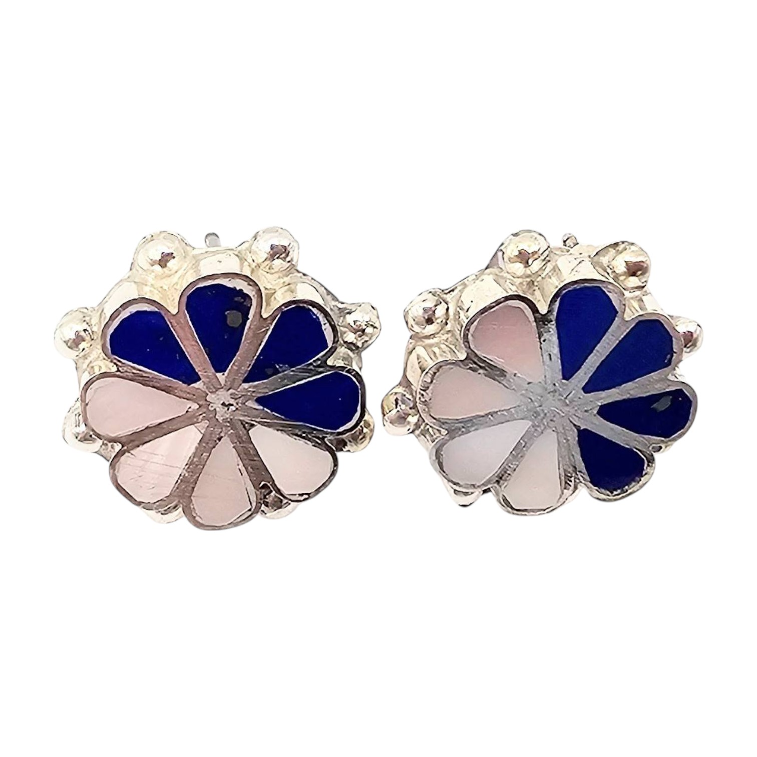 Handmade sterling silver earrings by Pino Yunie, a Zuni artisan. These earrings feature multicolored inlay in a floral design with lapis and mother of pearl sections. Post-back style for pierced ears. Total weight is approximately 6.7 grams. Dimensions and materials align with traditional Zuni craftsmanship.