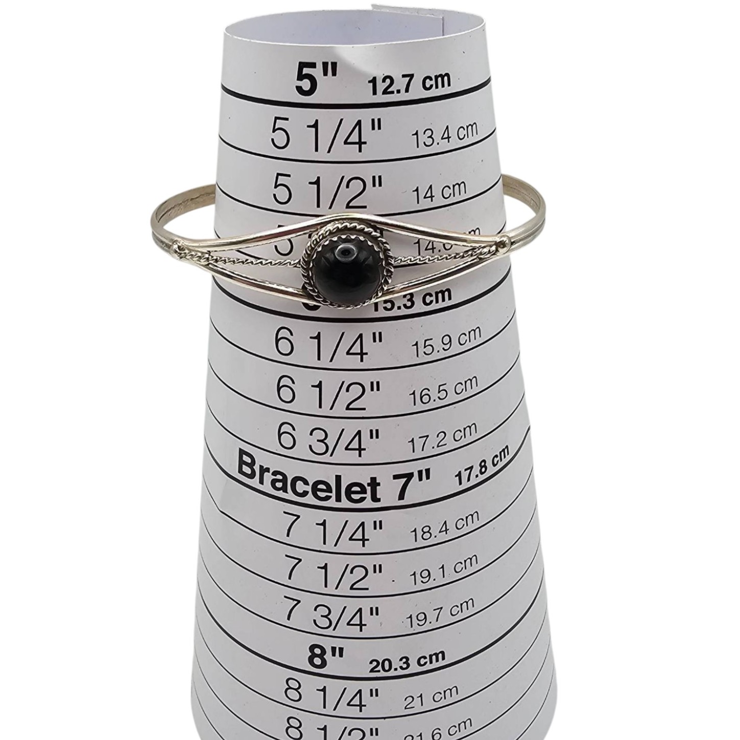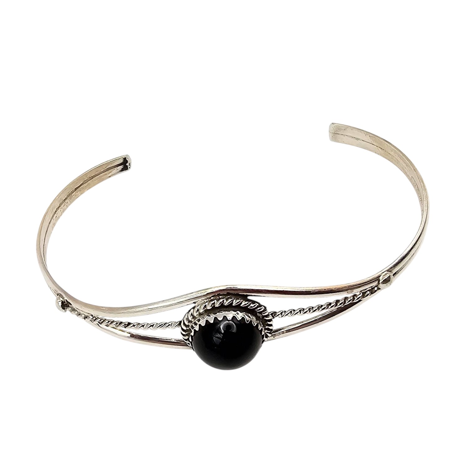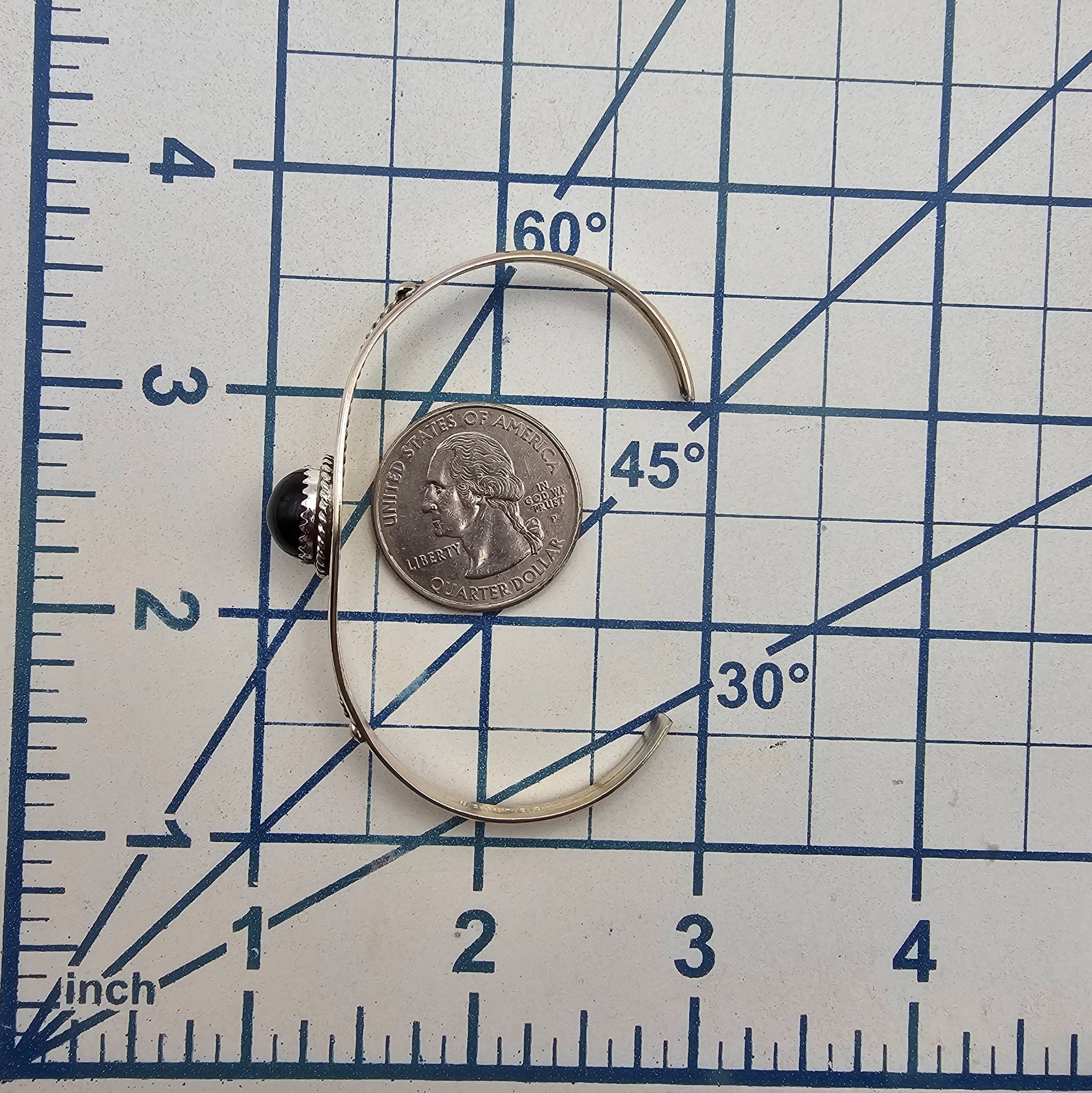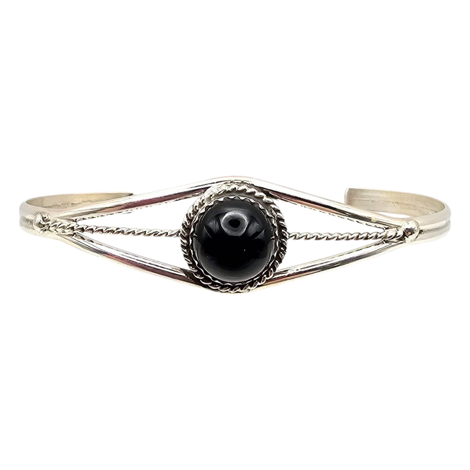 Handmade sterling silver bracelet featuring a central black onyx stone. Crafted by Navajo artist Esther White using traditional techniques. The bracelet includes intricate silverwork with a single braided silver accent detail. Weighs approximately 6.6 grams and fits a wrist size of approximately 6.5 inches. A beautiful piece showcasing Native American craftsmanship.
