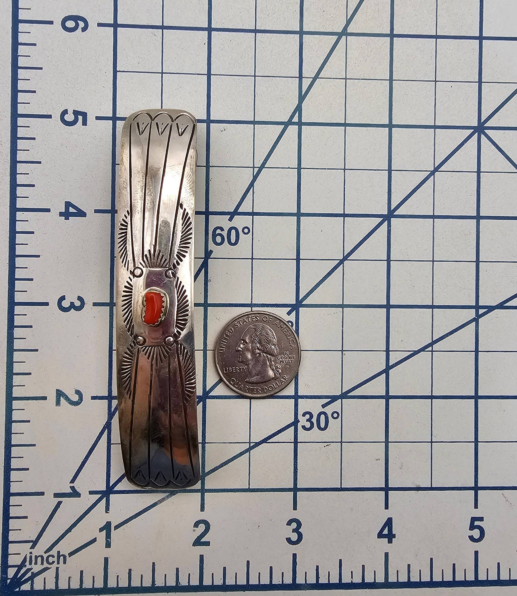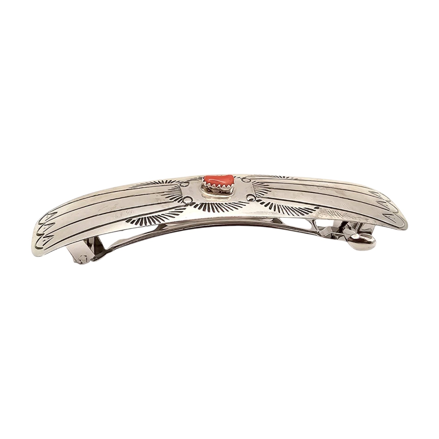 A handmade Navajo hair barrette by Joanne, crafted from sterling silver and featuring a red coral centerpiece. The barrette showcases intricate stamped designs typical of Navajo artistry. Measures approximately 4.5 inches in length, weighs about 14.5 grams. A fine example of traditional Native American jewelry craftsmanship.