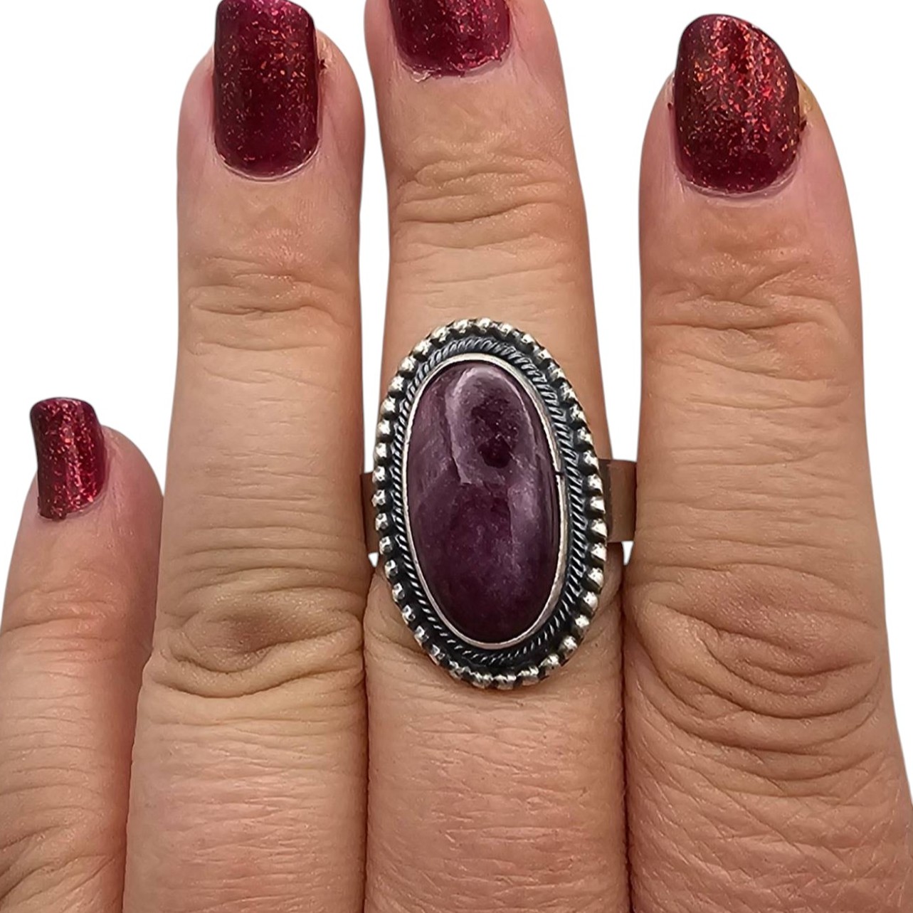 Handmade sterling silver ring featuring an oval spiny oyster stone in a bezel setting, crafted by Navajo artisan Antionette Martinez. The ring is adjustable and weighs approximately 10.3 grams. The band and setting show detailed craftsmanship characteristic of Navajo design. The piece is marked “Sterling.”