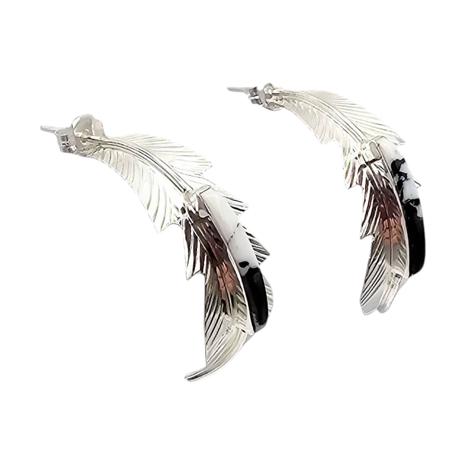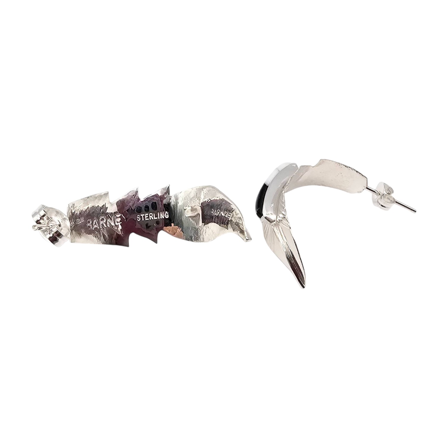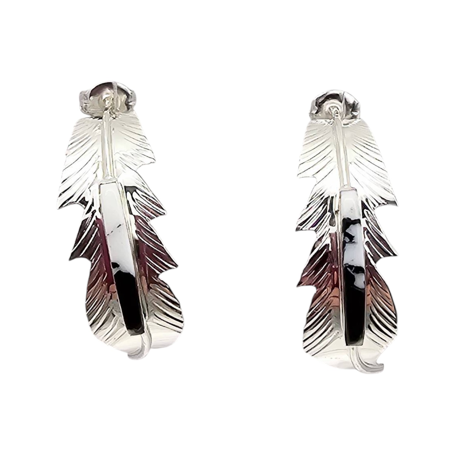 Allen Barney Navajo handmade earrings crafted from sterling silver in a feather motif and adorned with white buffalo stone inlays. Featuring a curved design, they measure approximately 2.5 inches in length. Stamped ‘STERLING’ and ‘A. BARNEY’ on the reverse side. Weighs approximately 2.8 grams as shown.